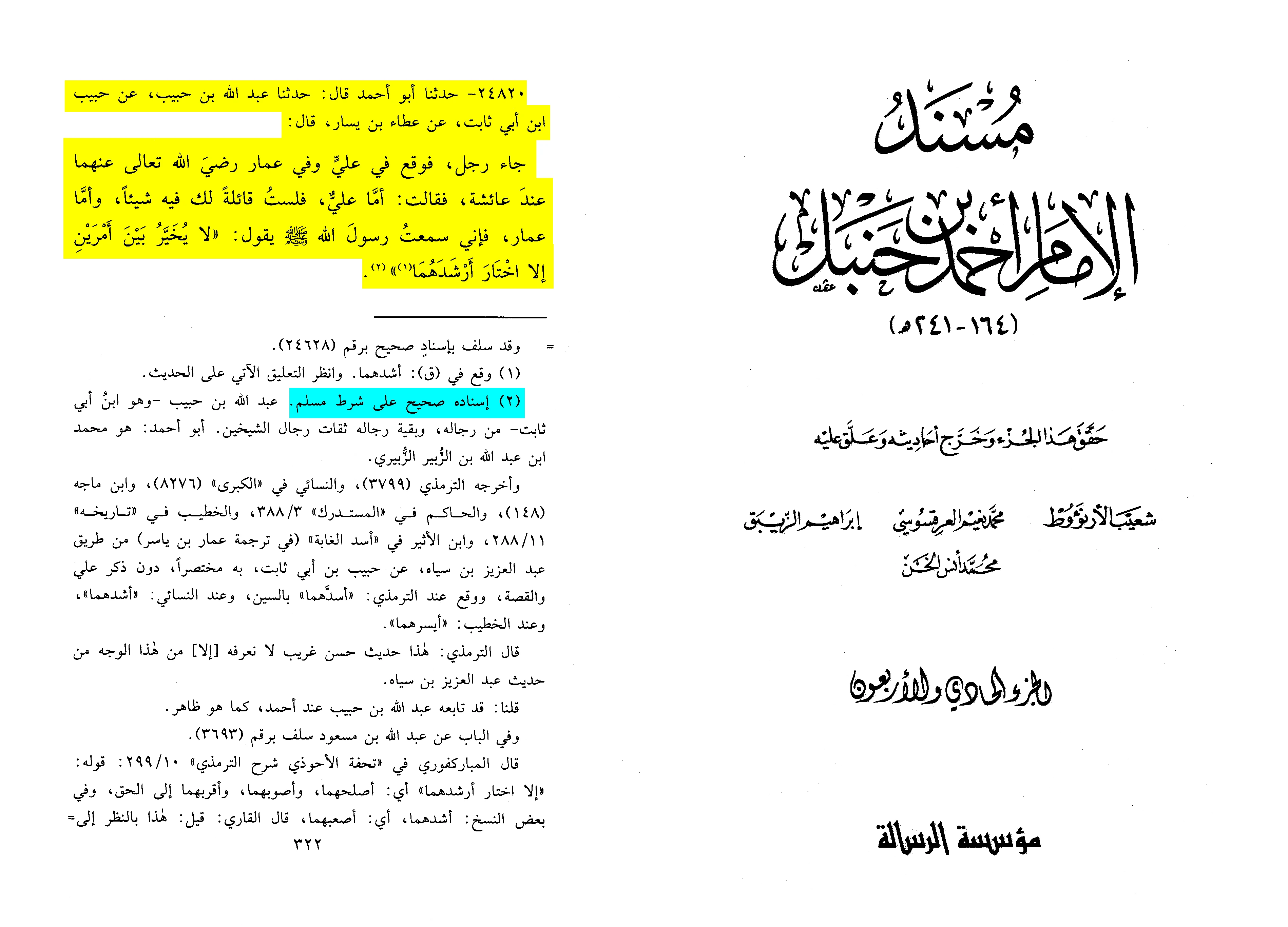 A man came and spoke against ‘Ali and ‘Ammar in the presence of ‘Aisha. She said: “As for ‘Ali, I will not say anything to you about him. But as for ‘Ammar, I heard the Messenger of Allah (saw) say, ‘He is never presented with two options except that he chooses the more righteous of the two.’”