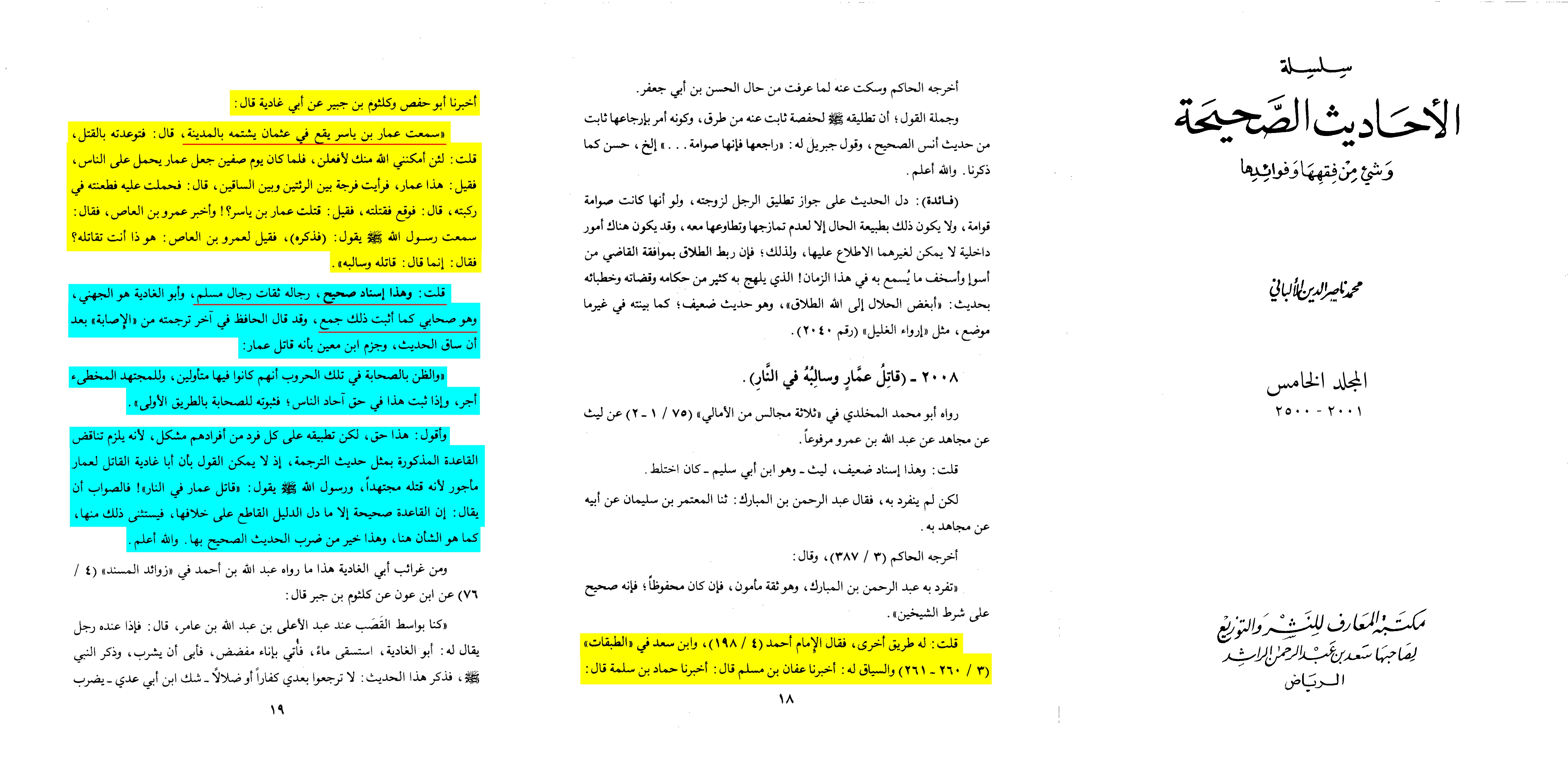 I heard ‘Ammar b. Yasir criticizing and insulting ‘Uthman in Medina. So, I threatened to kill him, saying: “If Allah grants me the opportunity, I will do it.” When the day of Siffin came, ‘Ammar was charging at the people, and it was said: “This is ‘Ammar.” I saw an opening between his ribs and thighs, so I charged at him and stabbed him in the knee, causing him to fall, and I killed him. It was then said: “You killed ‘Ammar b. Yasir.” This was reported to ‘Amr b. al-‘As, who said: “I heard the Messenger of Allah (saw) say, ‘His killer and plunderer will be in the Fire.’” It was then said to ‘Amr b. al-‘As: “But here you are, fighting him.” He replied: “The Prophet only said, ‘His killer and plunderer.’”