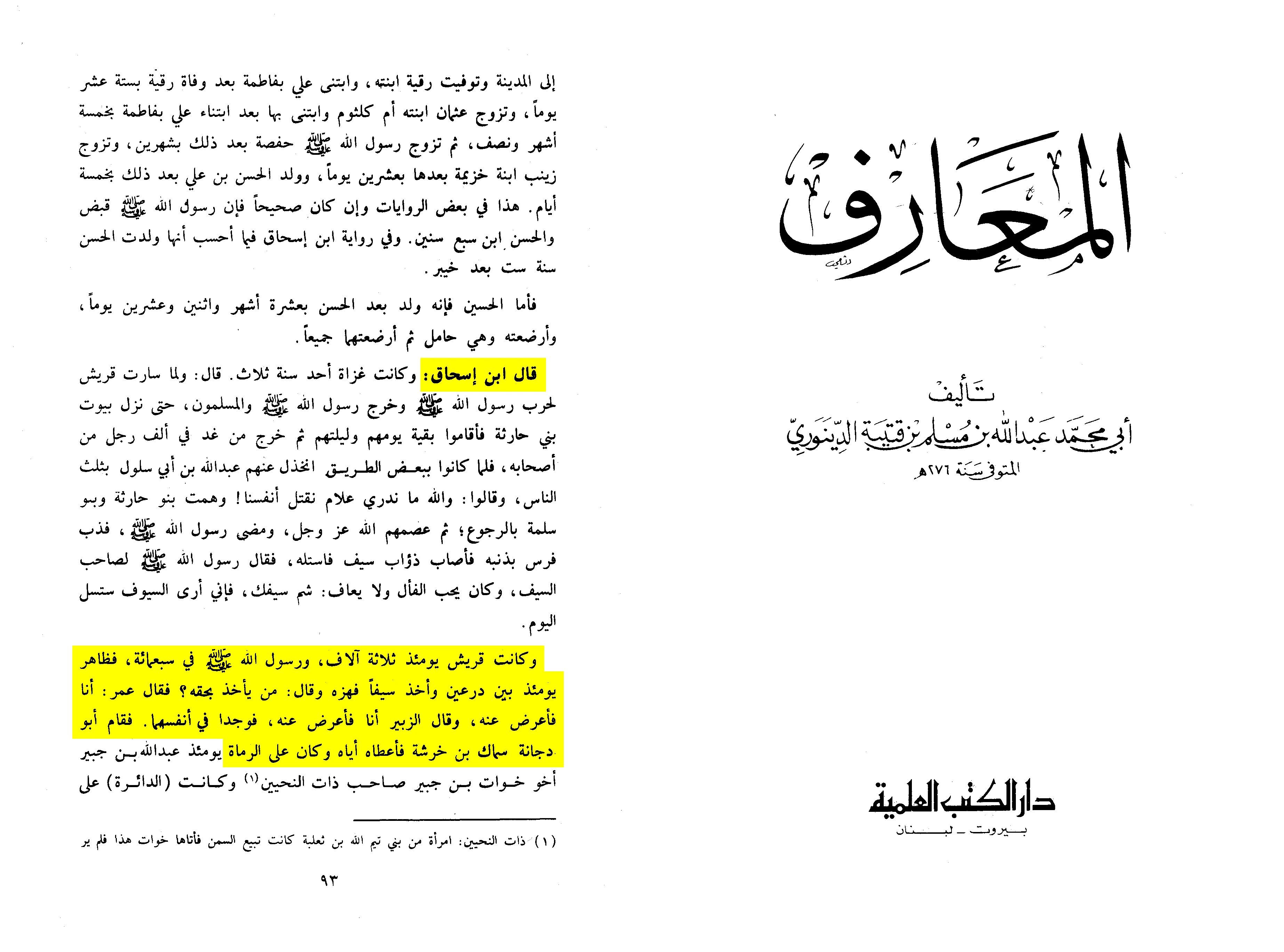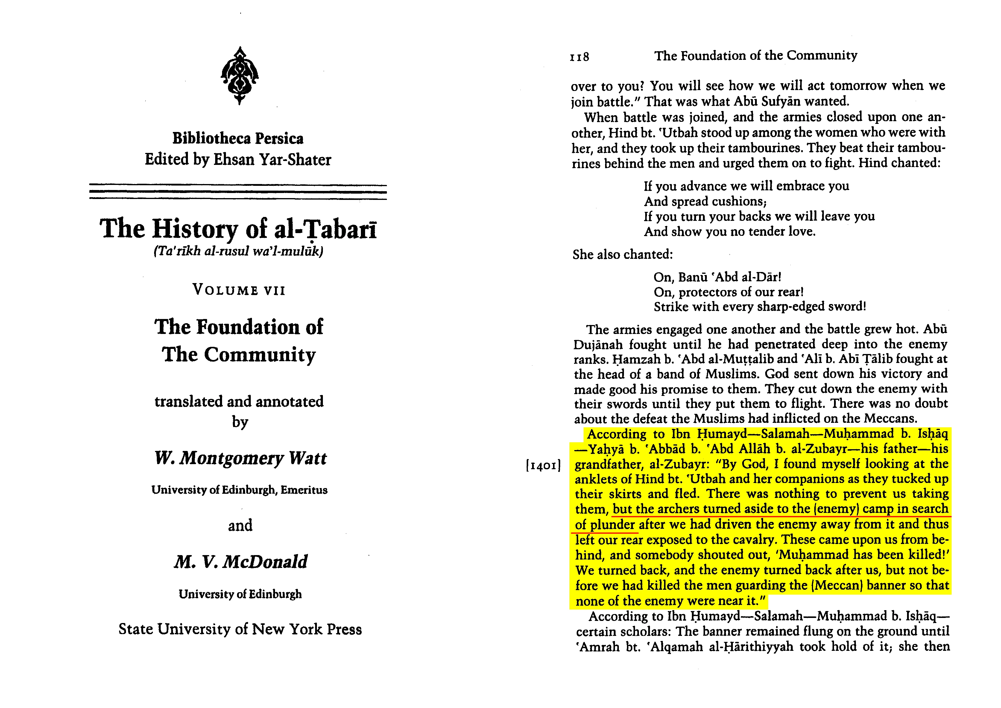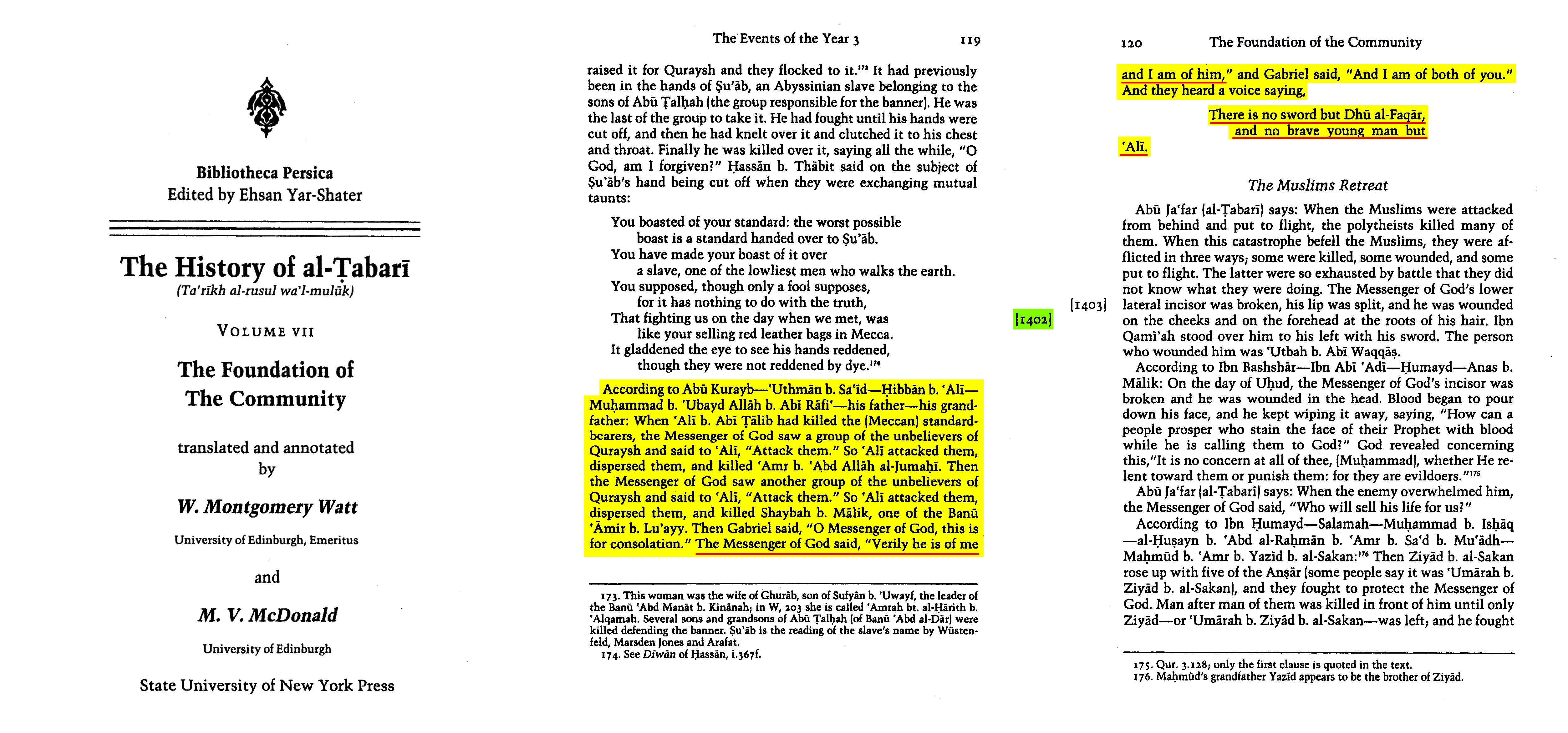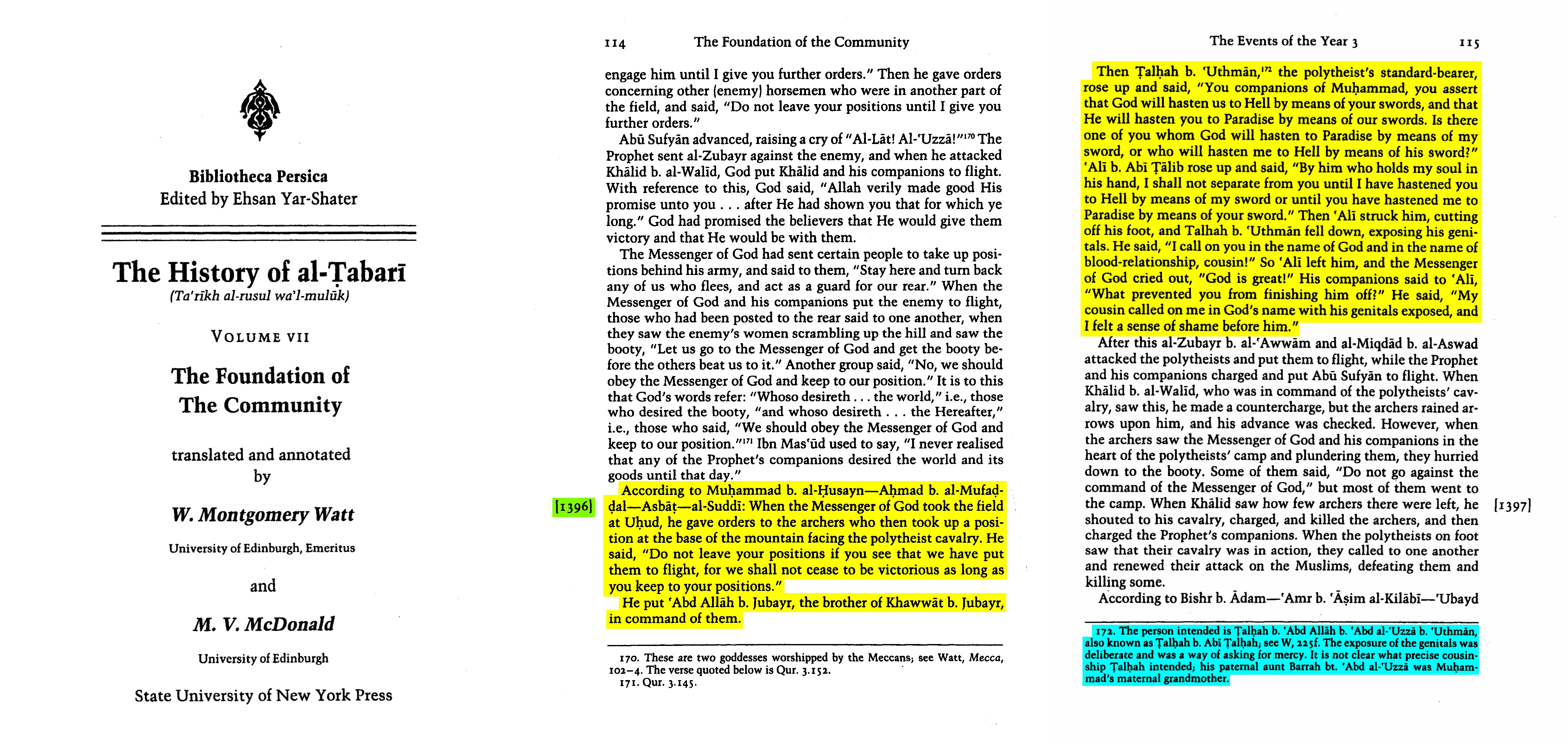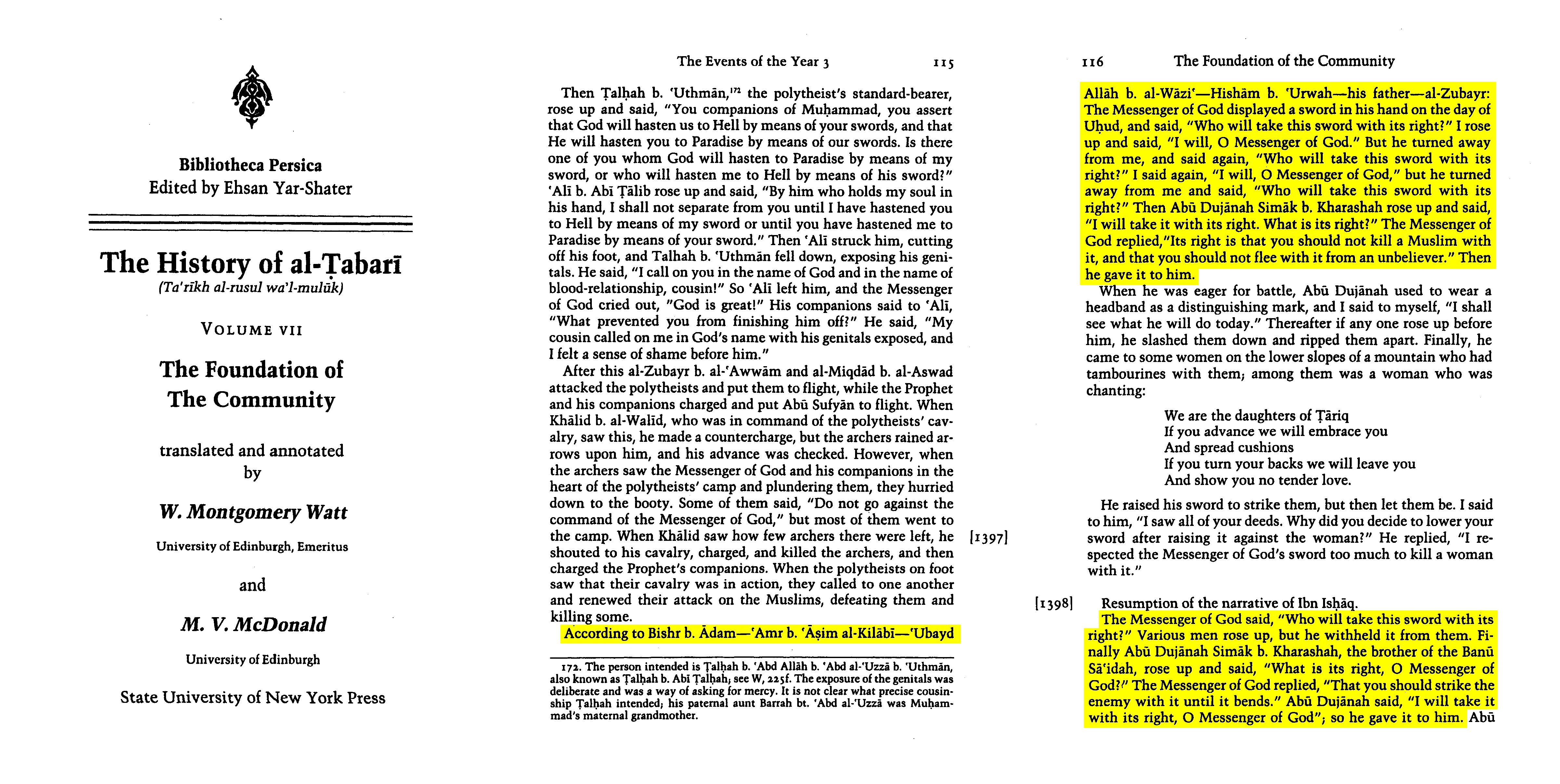“...Then Talhah b. 'Uthman, the polytheist's standard-bearer, rose up and said, "You companions of Muhammad, you assert that God will hasten us to Hell by means of your swords, and that He will hasten you to Paradise by means of our swords. Is there one of you whom God will hasten to Paradise by means of my sword, or who will hasten me to Hell by means of his sword?" 'Alī b. Abi Talib rose up and said, "By him who holds my soul in his hand, I shall not separate from you until I have hastened you to Hell by means of my sword or until you have hastened me to Paradise by means of your sword." Then 'Ali struck him, cutting off his foot, and Talhah b. 'Uthman fell down, exposing his geni- tals. He said, "I call on you in the name of God and in the name of blood-relationship, cousin!" So 'Alī left him, and the Messenger of God cried out, "God is great!" His companions said to 'Alī, "What prevented you from finishing him off?" He said, "My cousin called on me in God's name with his genitals exposed, and I felt a sense of shame before him."