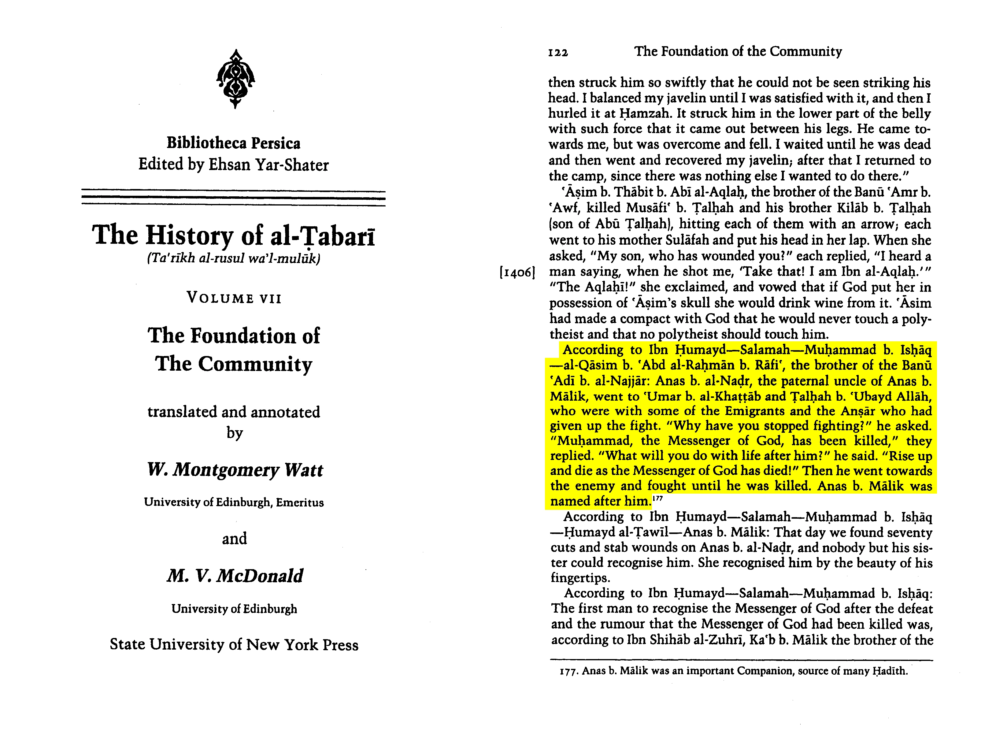 Anas b. al-Nadr, the paternal uncle of Anas b. Malik, went to 'Umar b. al-Khattab and Talhah b. 'Ubayd Allah, who were with some of the Emigrants and the Ansar who had ceased fighting. "Why have you stopped fighting?" he asked. "Muhammad, the Messenger of God, has been killed," they replied. "What will you do with life after him?" he said. "Rise up and die as the Messenger of God has died!" Then he went toward the enemy and fought until he was killed. Anas b. Malik was named after him.