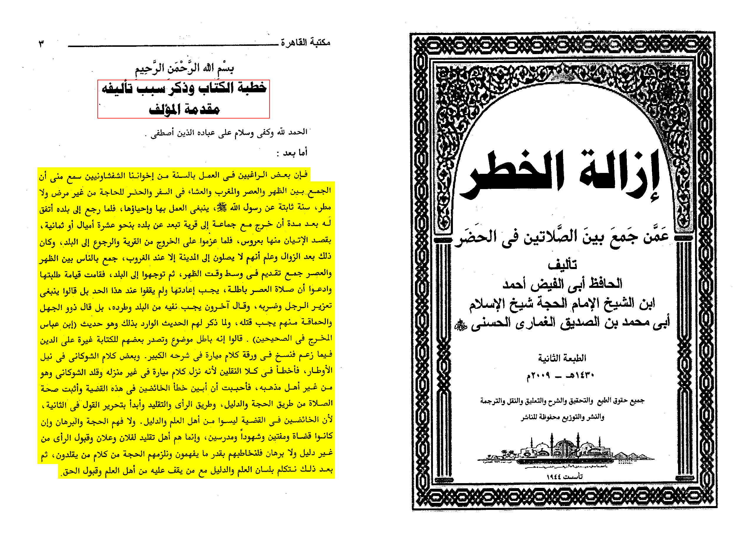 Some of those among our brothers from Chefchaouen, who were keen to act upon the Sunnah, heard from me that combining ẓuhr with ʿaṣr and maghrib with ʿishāʾ—whether in travel or residence—for a need, without illness or rain, is an established Sunnah of the Messenger of Allah, and that it should be practiced and revived.