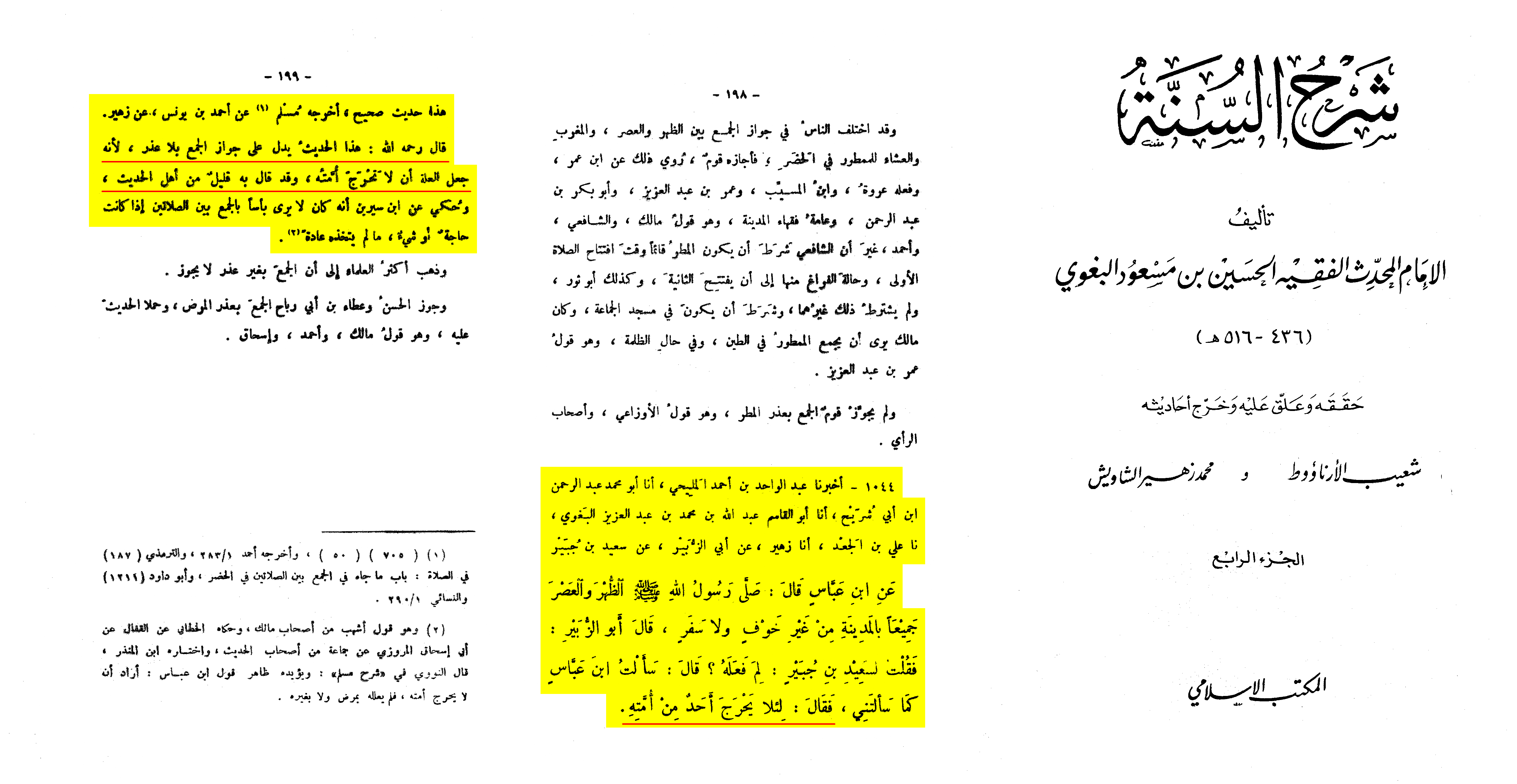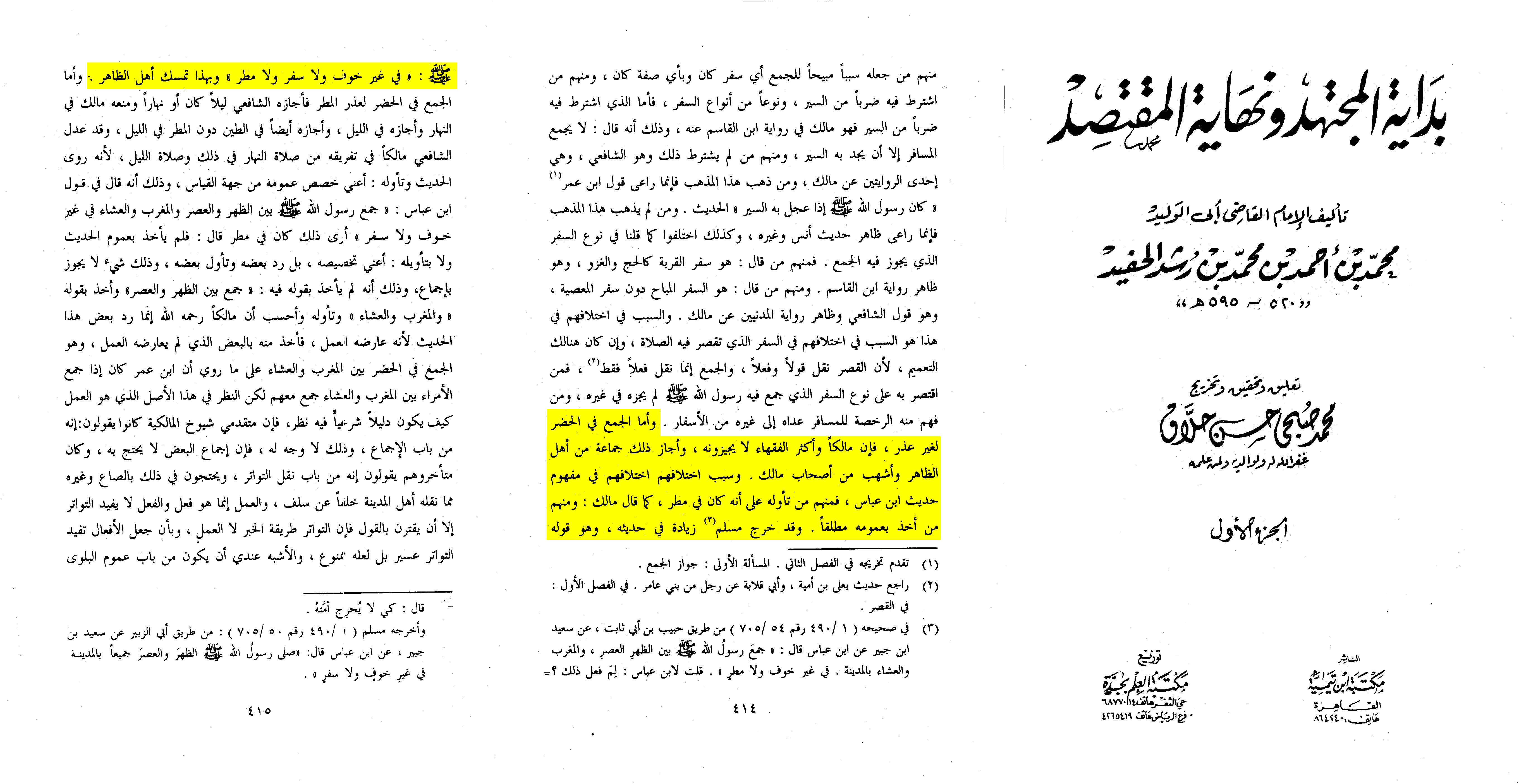 Muslim also transmitted an additional wording in the hadith: “without fear, travel, or rain,” and the Ahl al-Ẓāhir relied upon this.