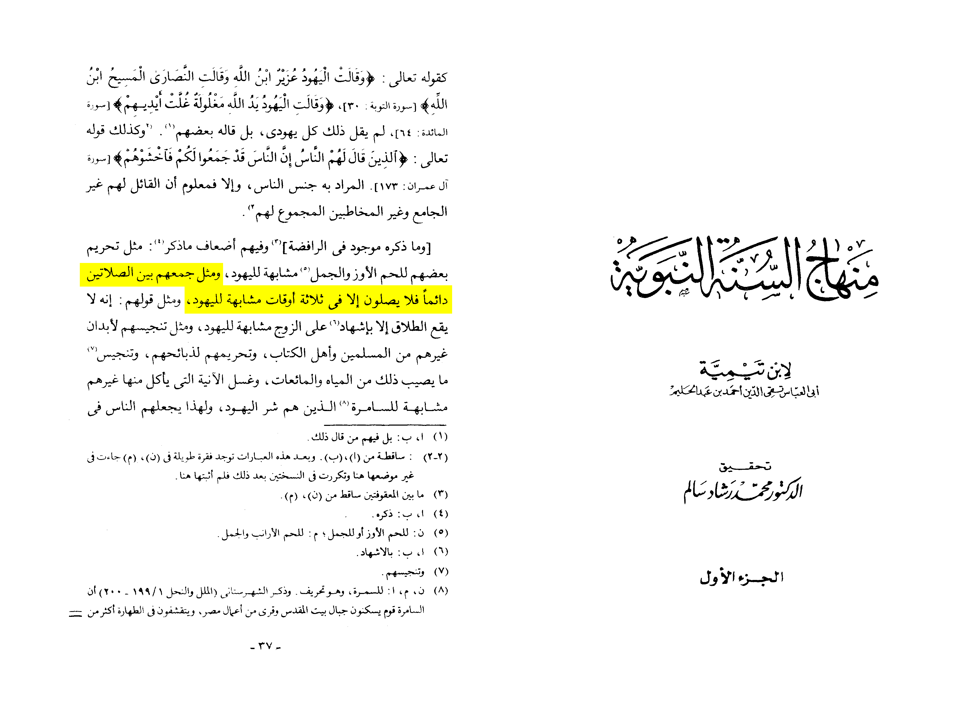 “...They (the Shi’a) combine the prayers constantly, so they only pray three times a day, resembling the Jews...”