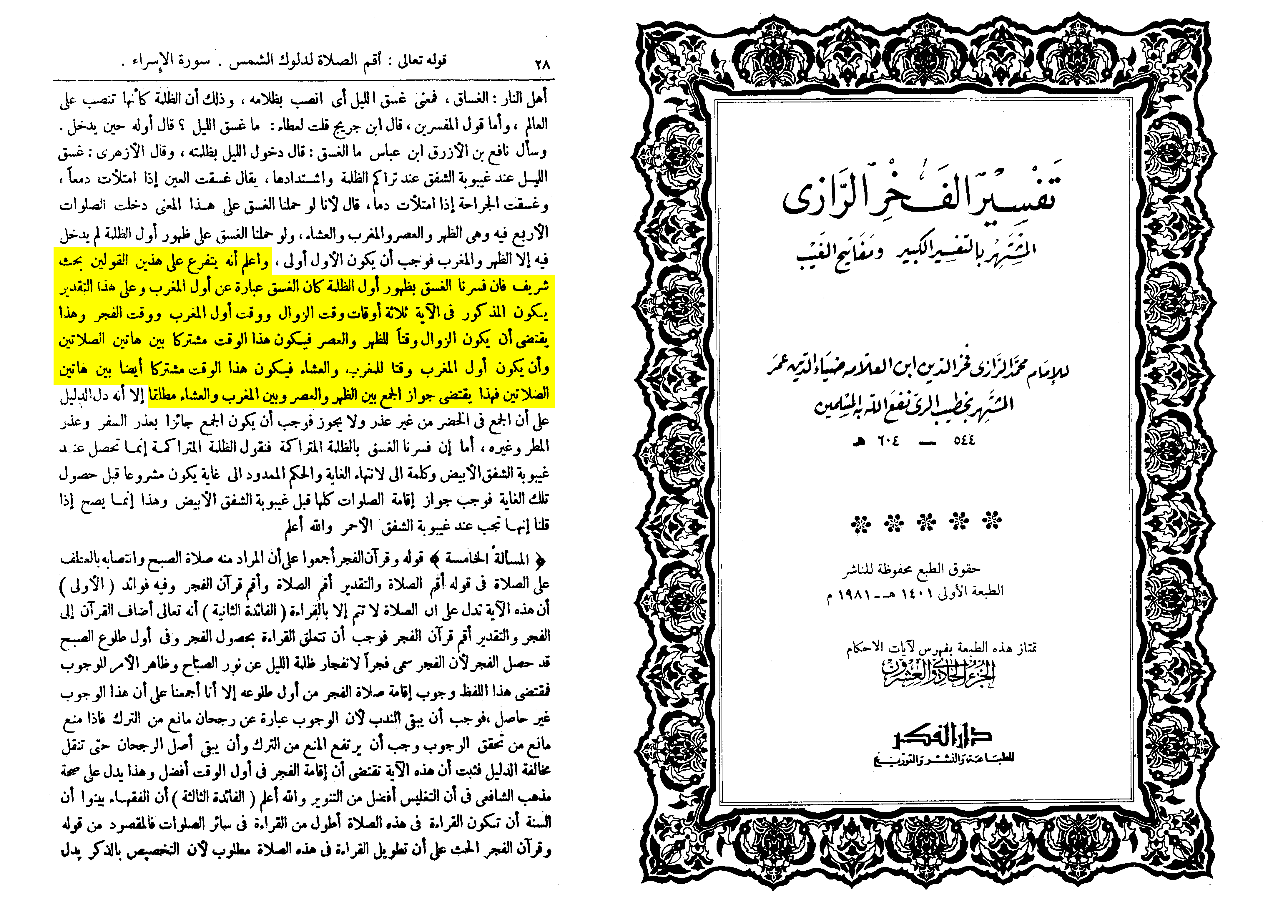 Despite recognising the validity of this argument, Fakhr al-Dīn al-Rāzī rejected it because the impermissibility to combine the prayers without excuse is agreed upon to be forbidden in Sunnī fiqh. Yet, he could not address the response to his own argument except with superstition, because the Sunnīs almost unanimously agree that ghasaq al-layl refers to Maghrib time and the beginning of the sunset.