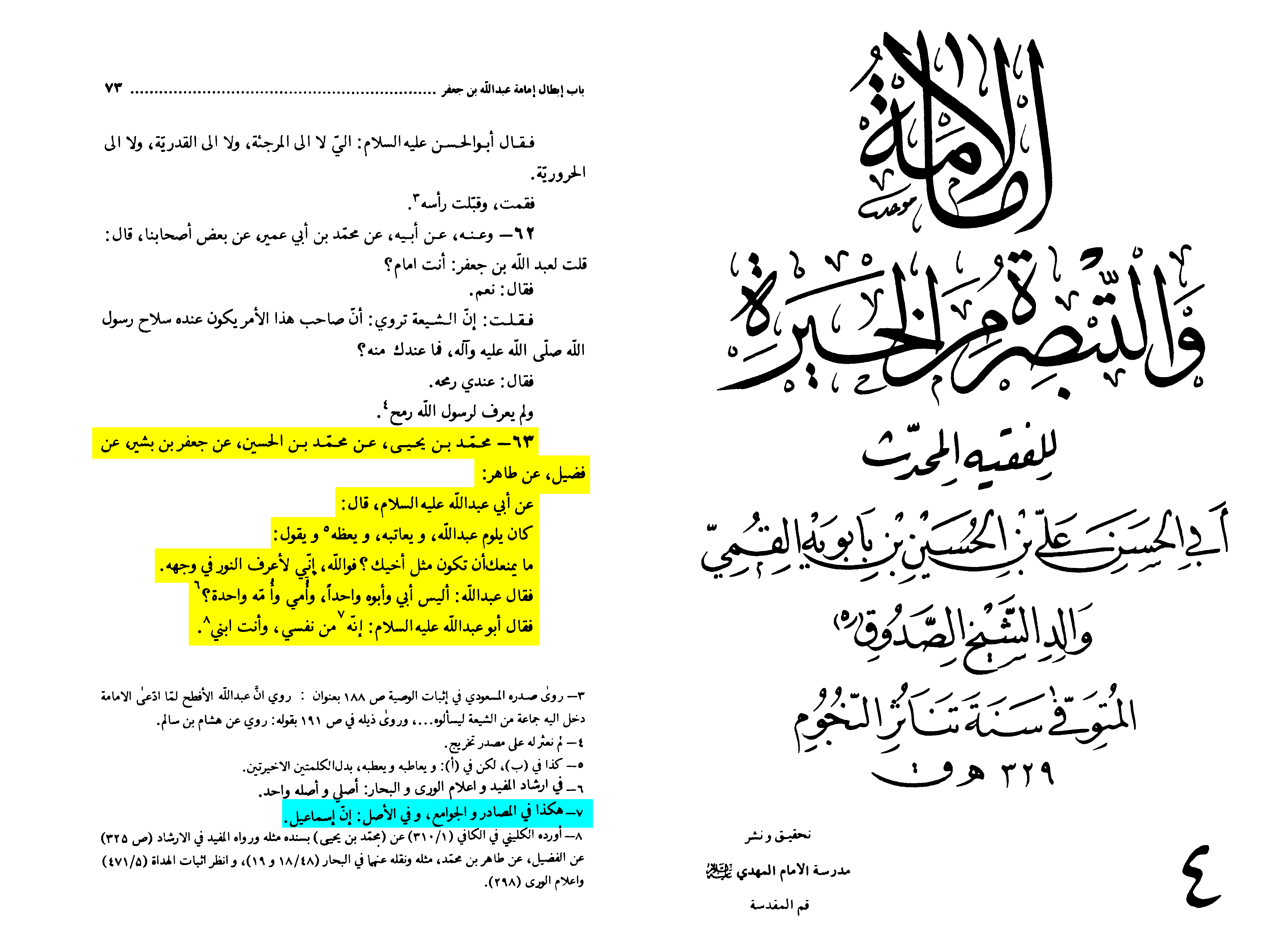 The evidence for this claim comes from the fact that the same report appears in a different hadith collection al-Imama wal-Tabrisa pg. 73, Hadith no. 63 compiled by Ibn Babawayh, the father of Shaykh al-Saduq, where it reads as follows: