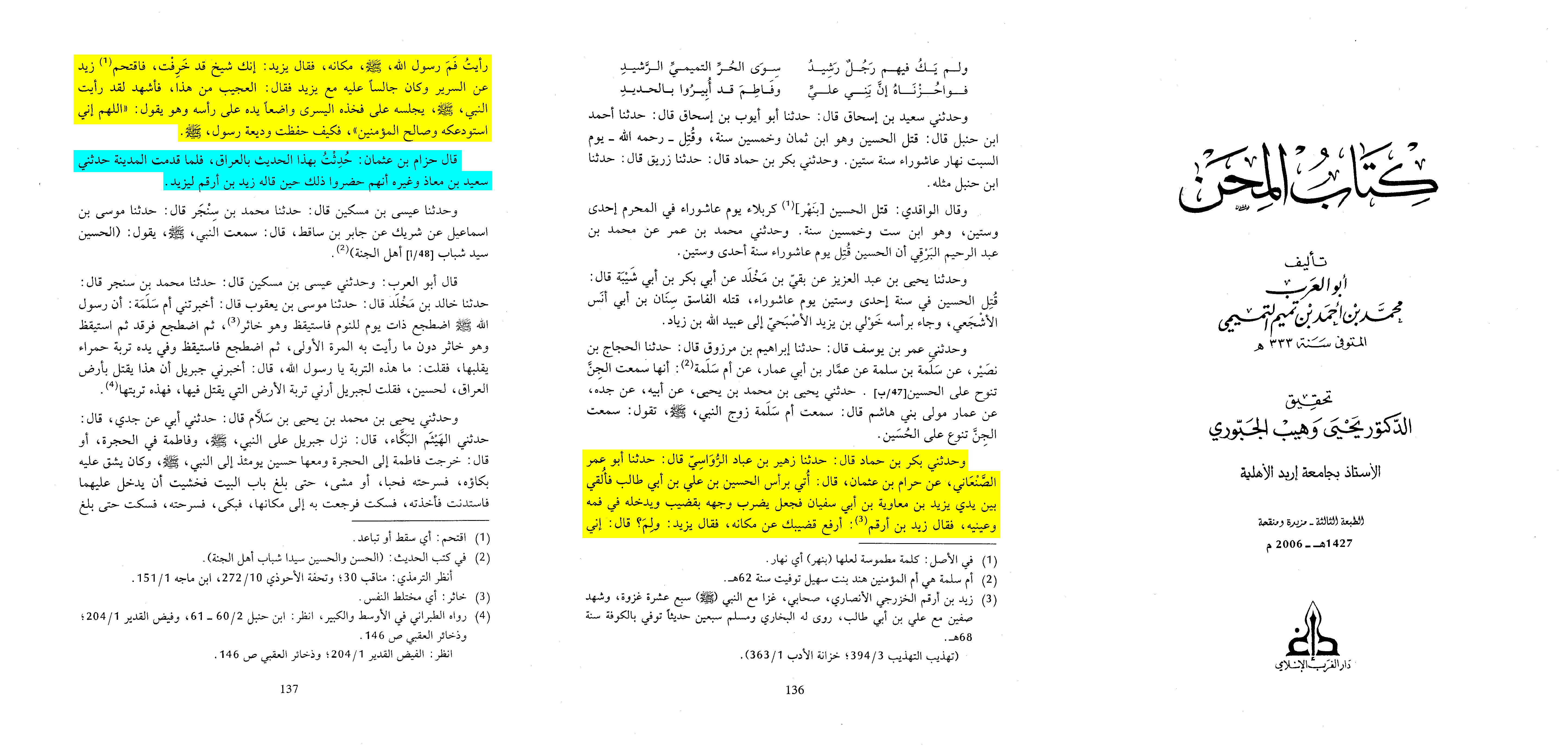 He said: Then al-Husayn was killed, and his head was carried to Yazid. We too were carried, and Yazid seated me on his lap and seated one of his sons on his lap. Then he said to me: “Will you wrestle him?” I said: “Give me a knife and give him a knife, and leave me with him.” He said: “You do not cease showing enmity toward us, young and old alike.”
