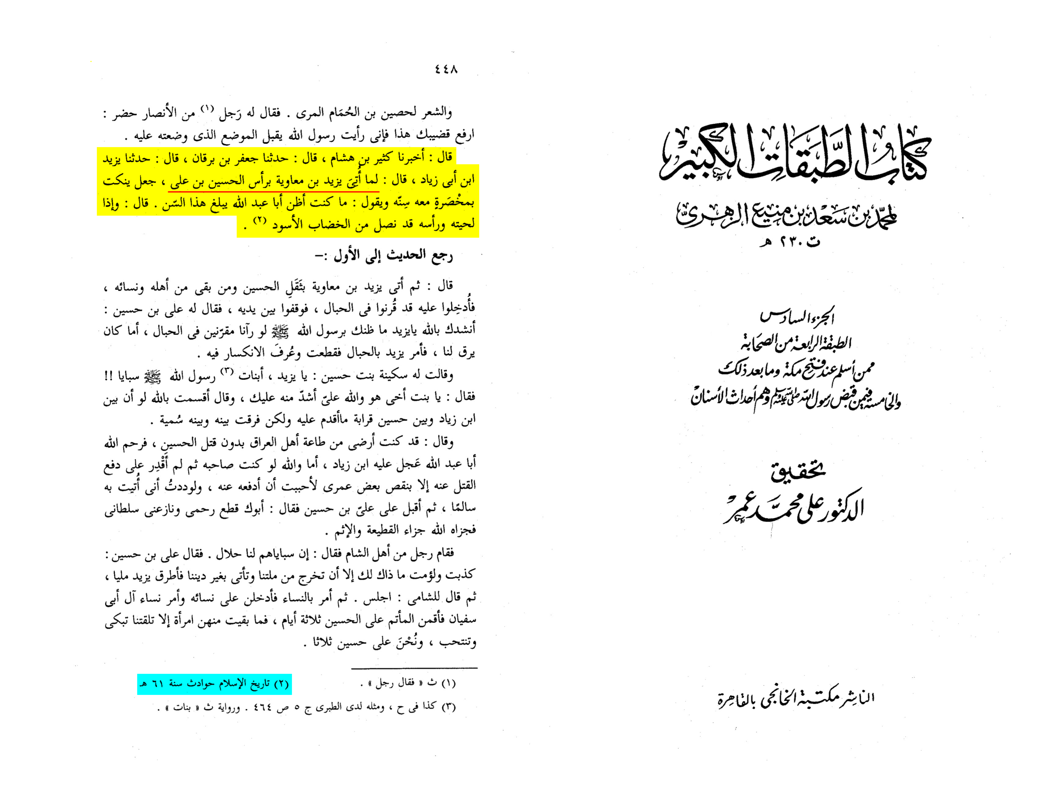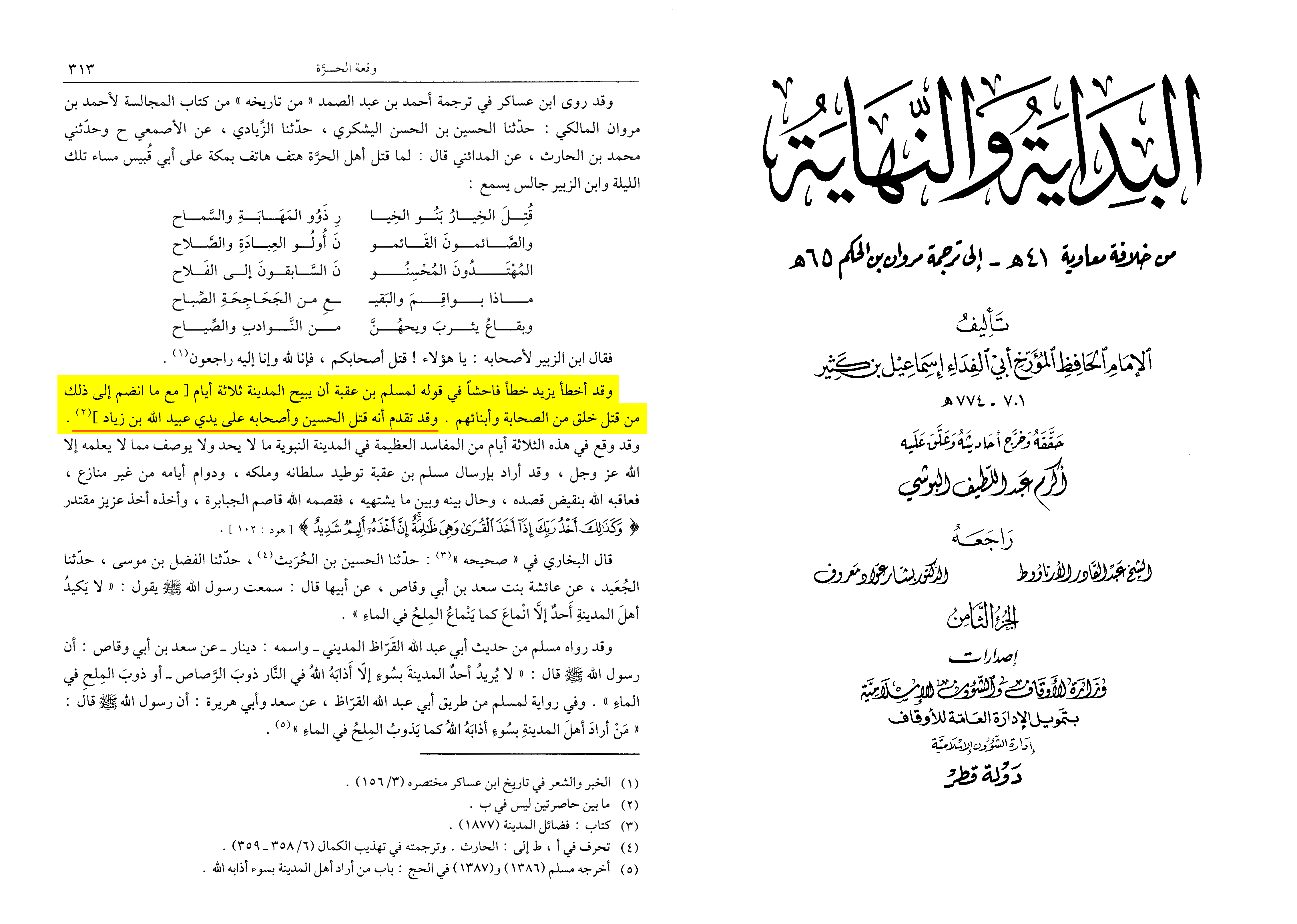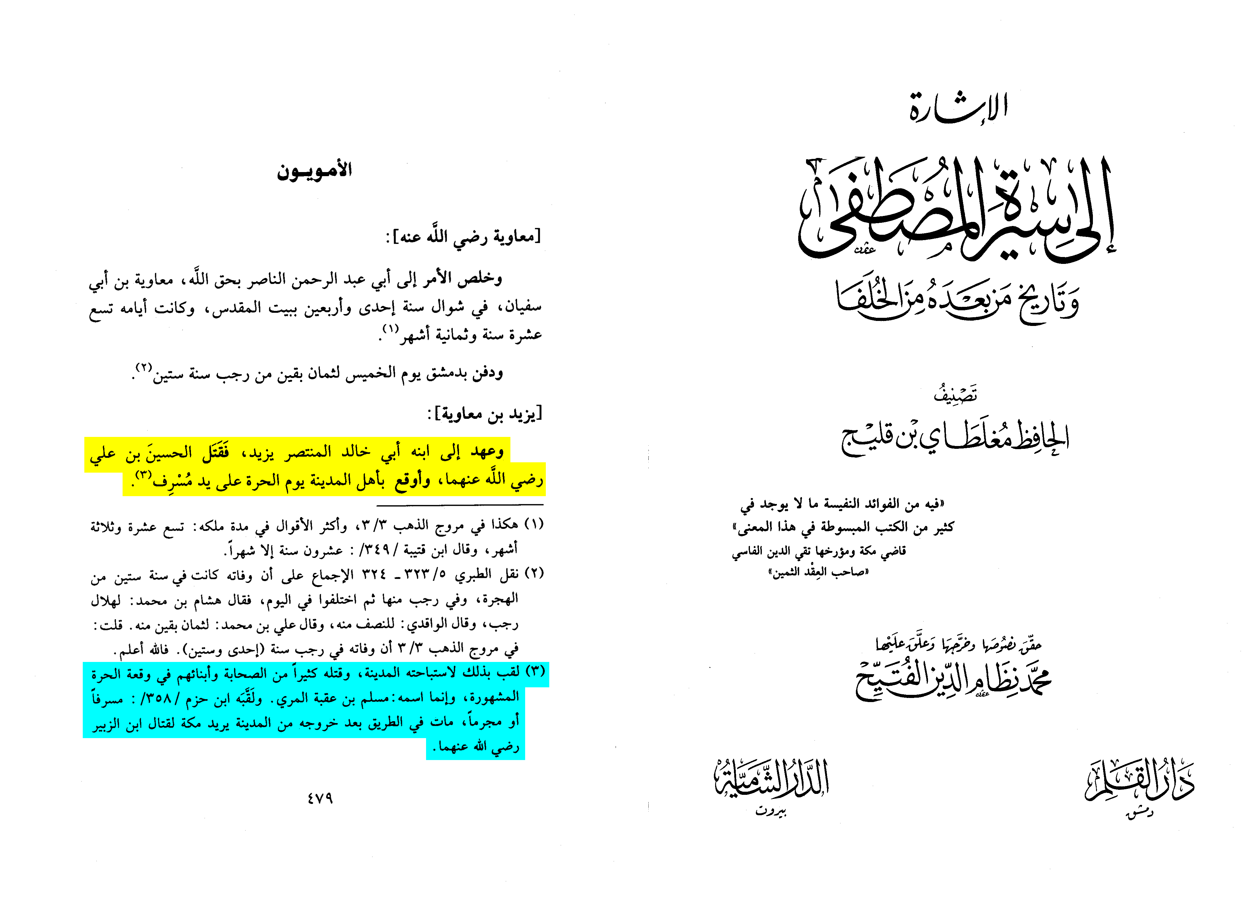 He entrusted the pledge to his son, Abu Khalid al-Muntasir Yazid. Then he killed al-Husayn b. ʿAli, may God be pleased with them both, and he committed the massacre of the people of Medina on the day of al-Harra at the hands of Musrif.