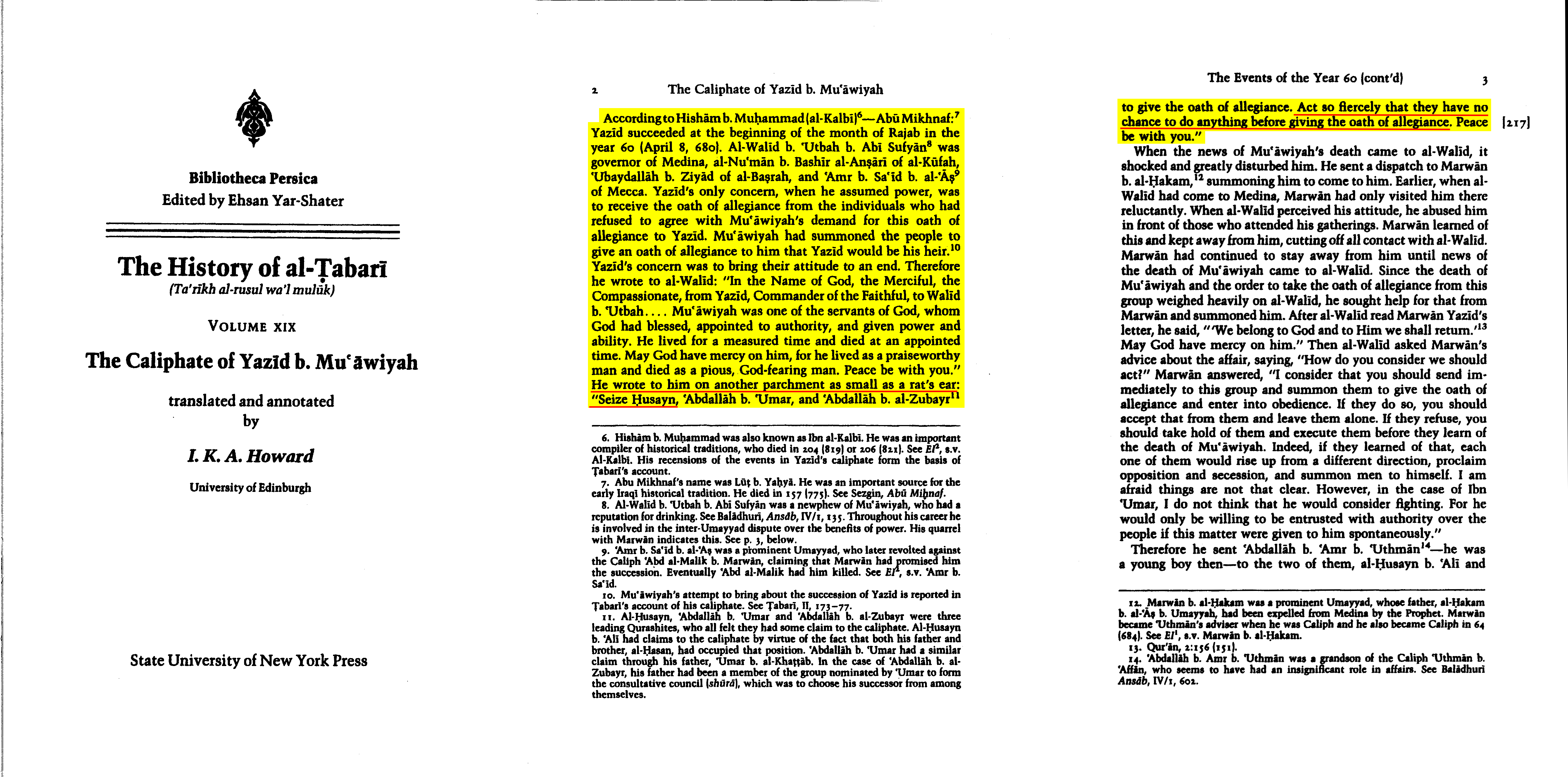 Yazid's only concern, when he assumed power, was to receive the oath of allegiance from the individuals who had refused to agree with Mu'awiyah's demand for this oath of allegiance to… Therefore he wrote to al-Walid: "In the Name of God, the Merciful, the Compassionate, from Yazid, Commander of the Faithful, to Walid b. Utbah… Seize Husayn, 'Abdallah b. 'Umar, and 'Abdallah b. al-Zubayr to give the oath of allegiance. Act so fiercely that they have no chance to do anything before giving the oath of allegiance. Peace be with you."