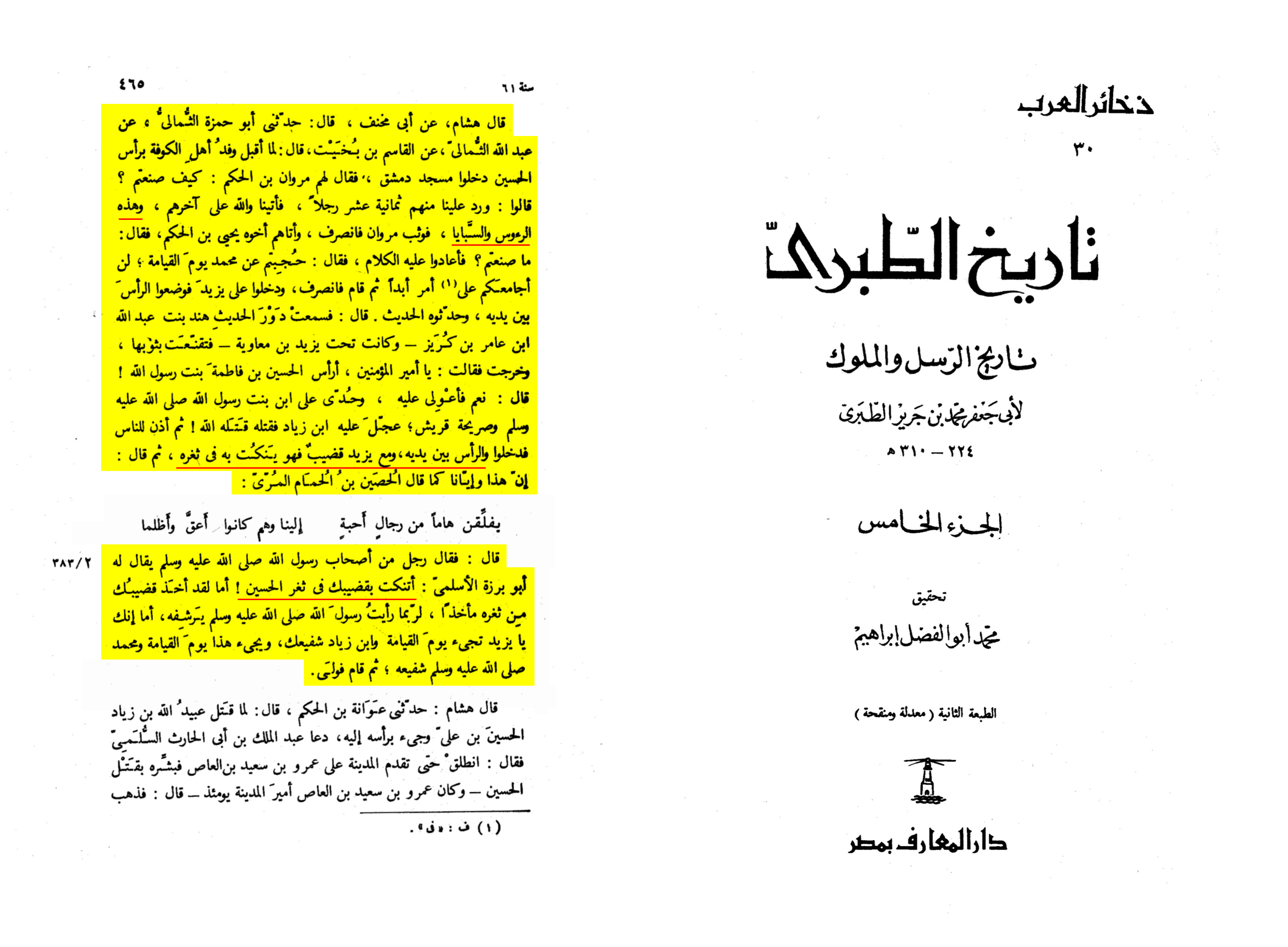 Some accounts mention that Yazid cried and felt remorse after hearing the news of al-Husayn’s death, but these accounts fail to portray an accurate chronology of the events that unfolded. The correct turn of events was recorded in Tarikh al-Tabari Vol. 20, pg. 9 - 10: