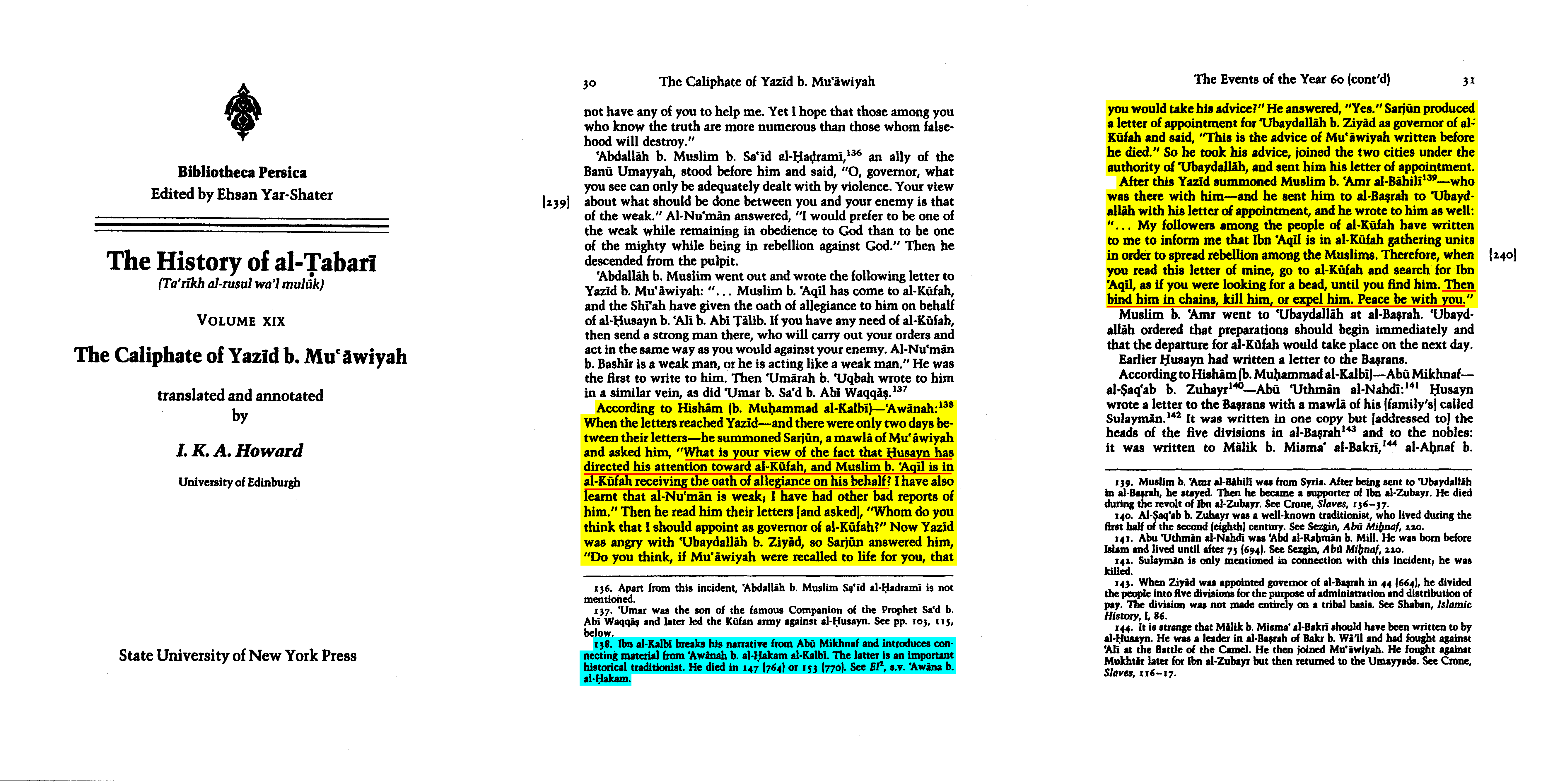 When the letters reached Yazid-and there were only two days between their letters-he summoned Sarjūn, a mawla of Mu'awiyah and asked him, "What is your view of the fact that Husayn has directed his attention toward al-Kufah, and Muslim b. 'Aqil is in al-Küfah receiving the oath of allegiance on his behalf? I have also learnt that al-Nu'man is weak, I have had other bad reports of him."