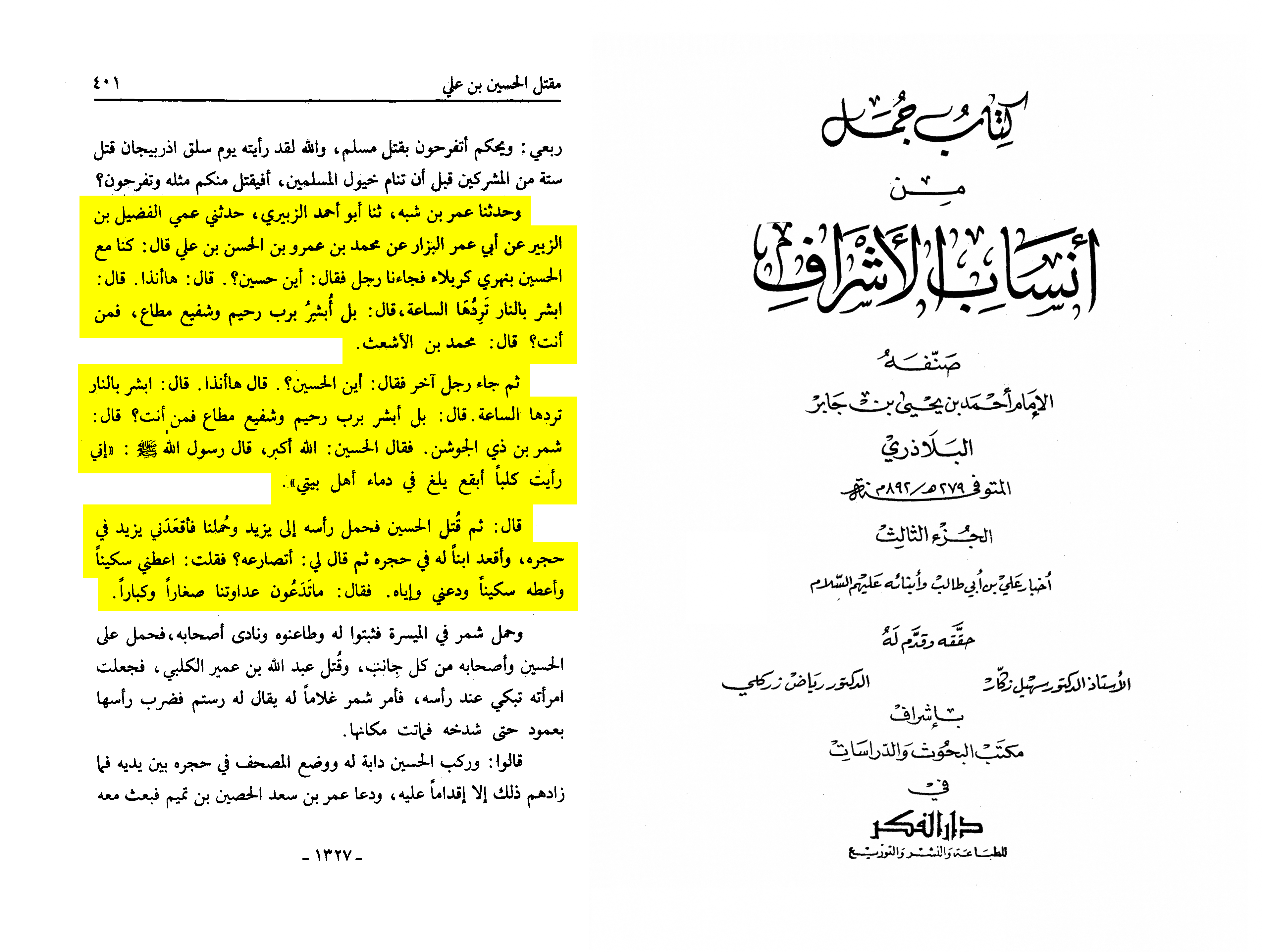 Al-Baladhuri (d. 279) in Ansab al-Ashraf Vol. 3, pg. 371