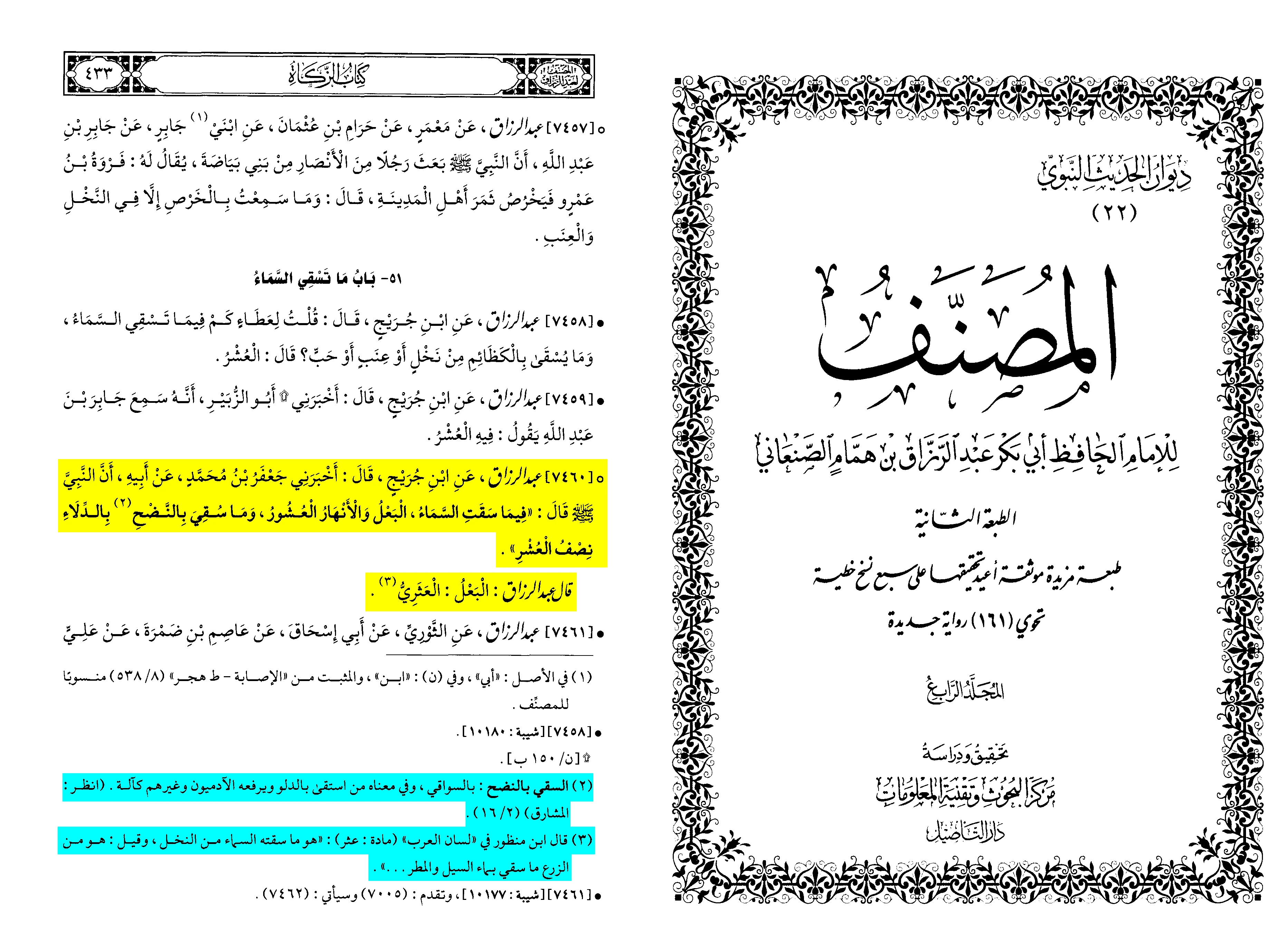 عبد الرزاق، عَنِ ابْنِ جُرَيْجٍ، قَالَ: أَخْبَرَنِي جَعْفَرُ بْنُ مُحَمَّدٍ، عَنْ أَبِيهِ، أَنَّ النَّبِيَّ صلى الله عليه وسلم قَالَ: "فِيمَا سَقَتِ السَّمَاءُ، الْبَعْلُ وَالْأَنْهَارُ الْعُشُورُ، وَمَا سُقِيَ بِالنَّضْحِ بِالدِّلَاءِ نِصْفُ الْعُشْرِ".