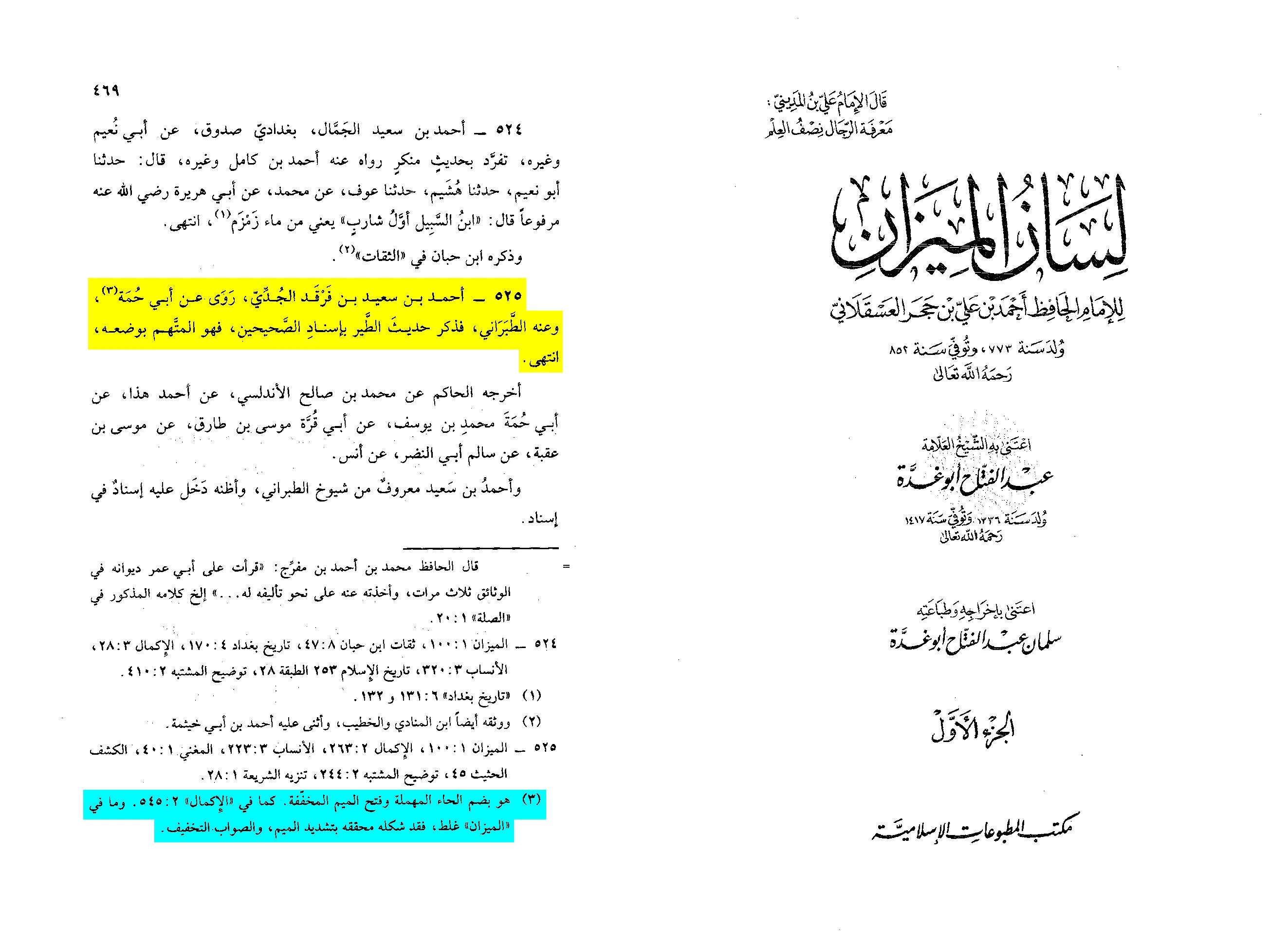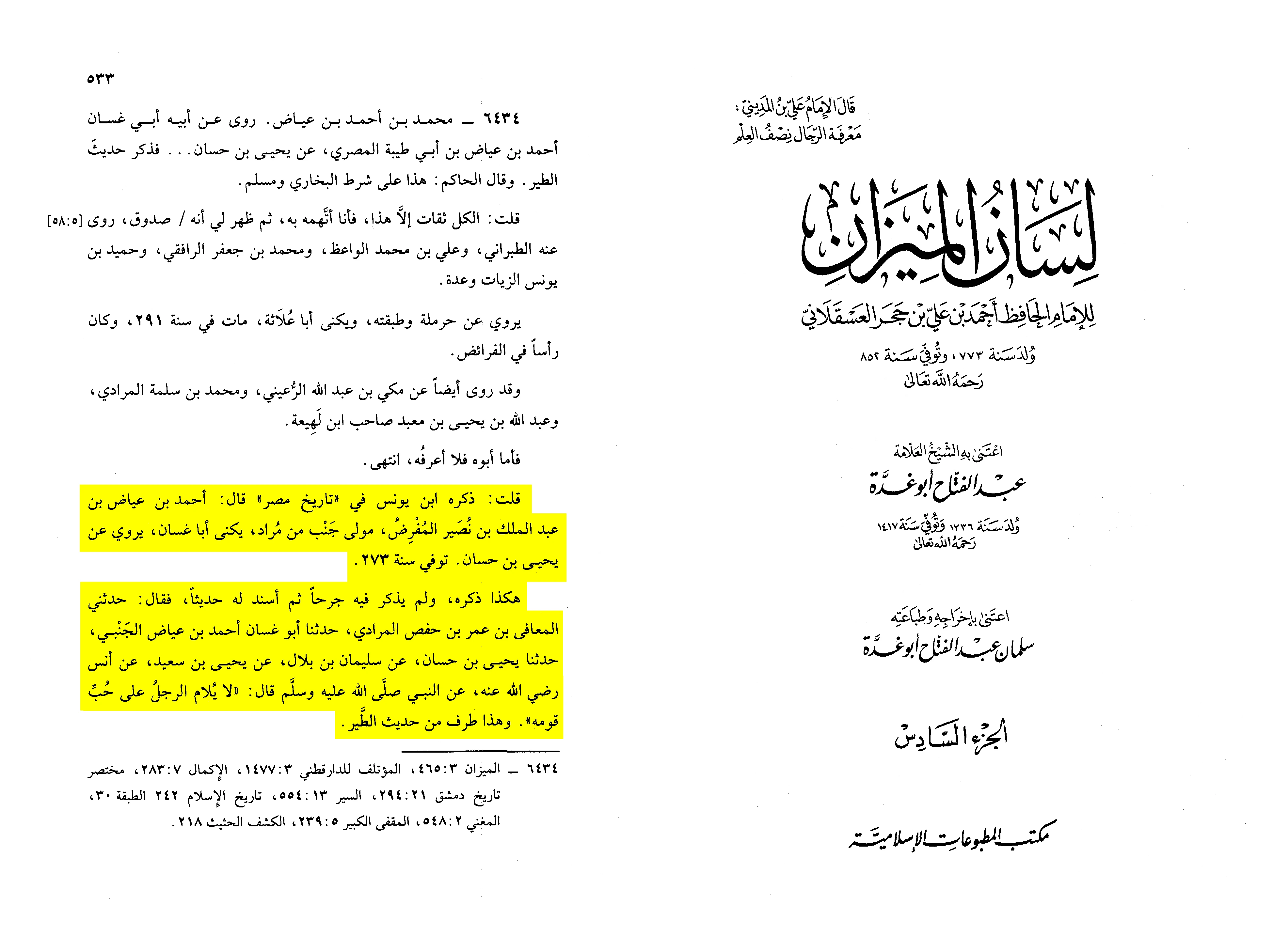 In another example of clear censorship, we mention Ibn Yunus al-Masri, who was the student of al-Nasa’i and al-Razi. Ibn Hajar quotes his reference in Lisan al-Mizan, Vol. 6, pg. 533: