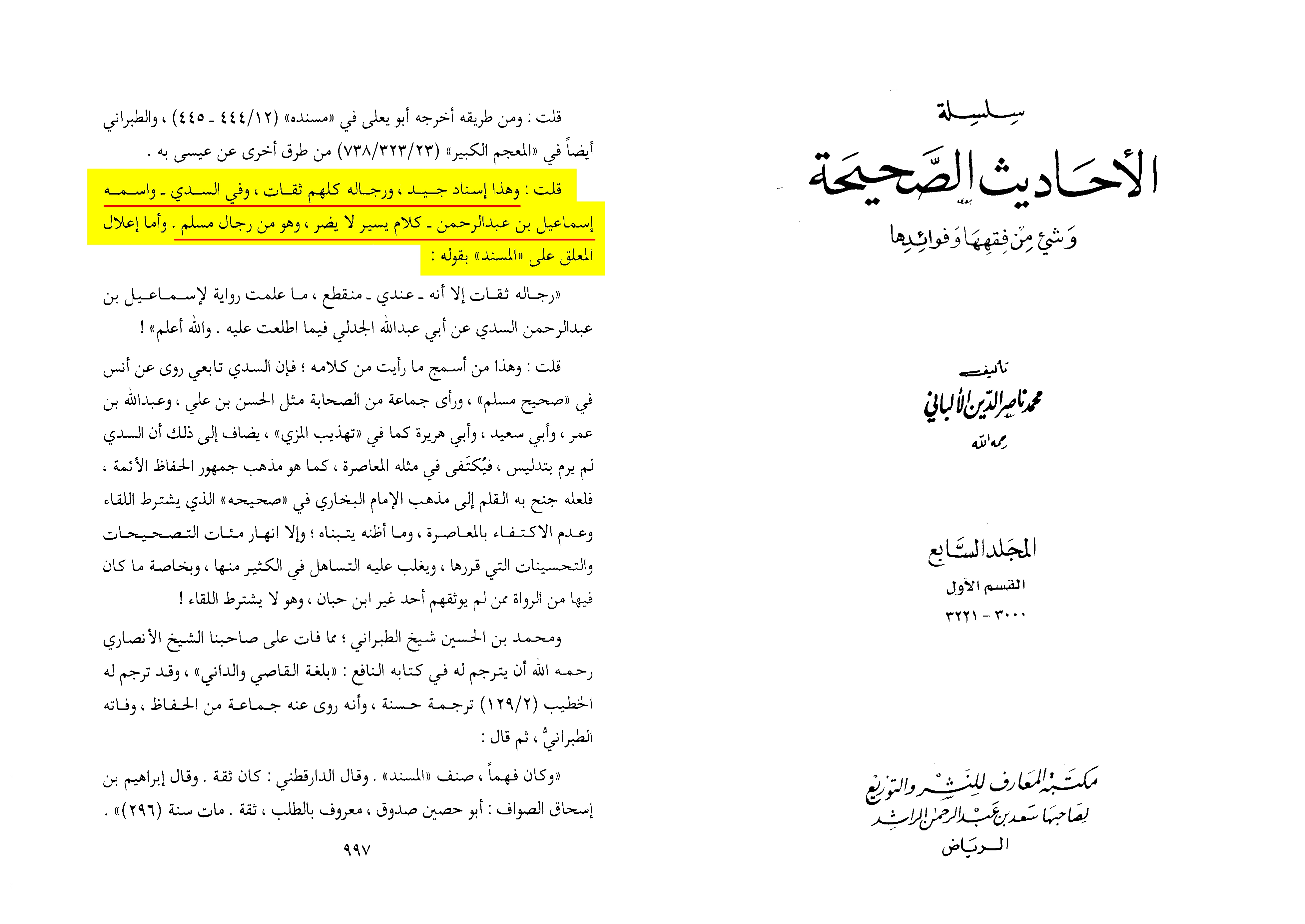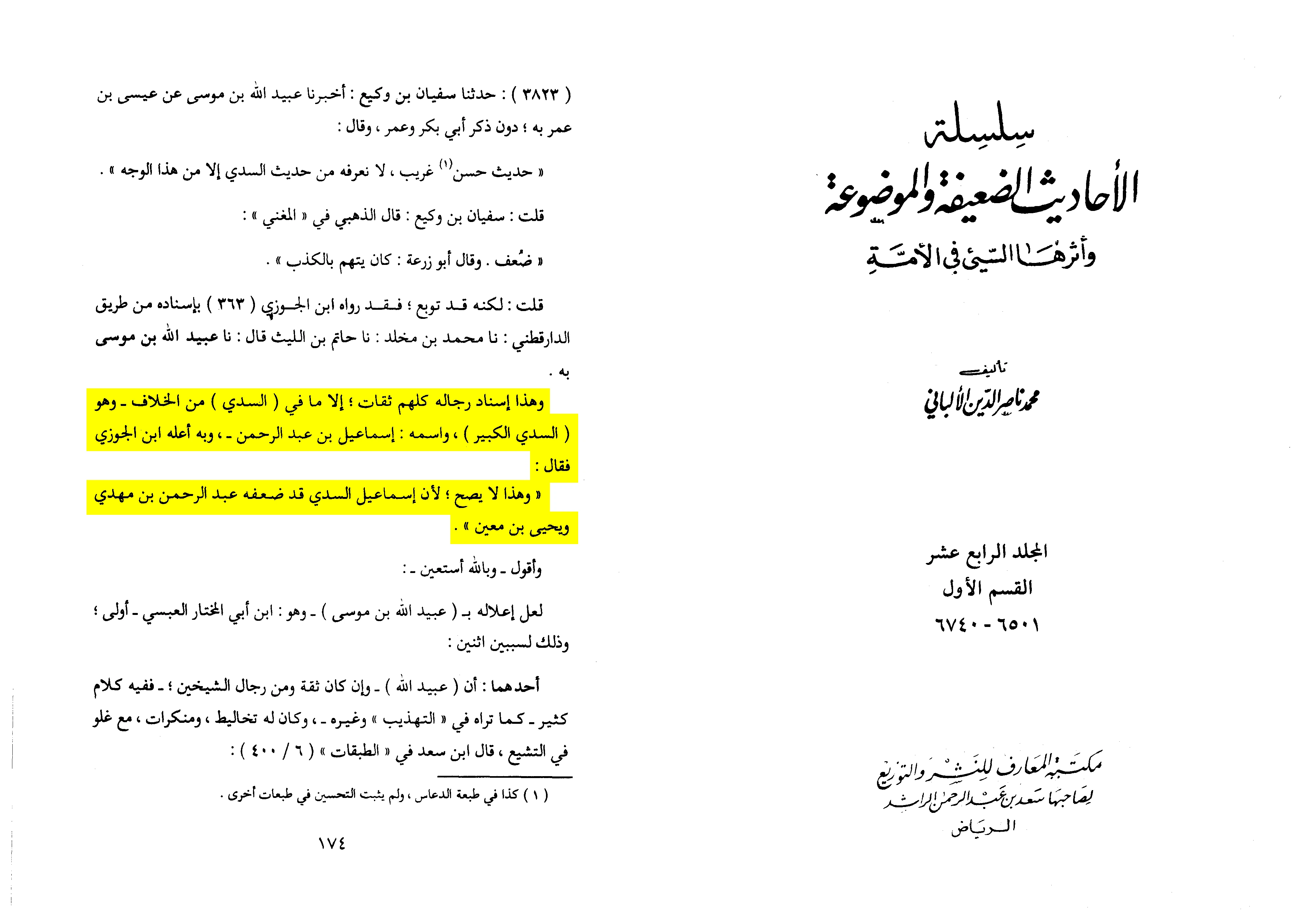 Just consider this hilarious contradiction of Al-Albani, where in one hadith where al-Suddi narrated, Al-Albani says he’s reliable; Silsalat al-Ahadith al-Sahiha, vol. 7, pg. 997: