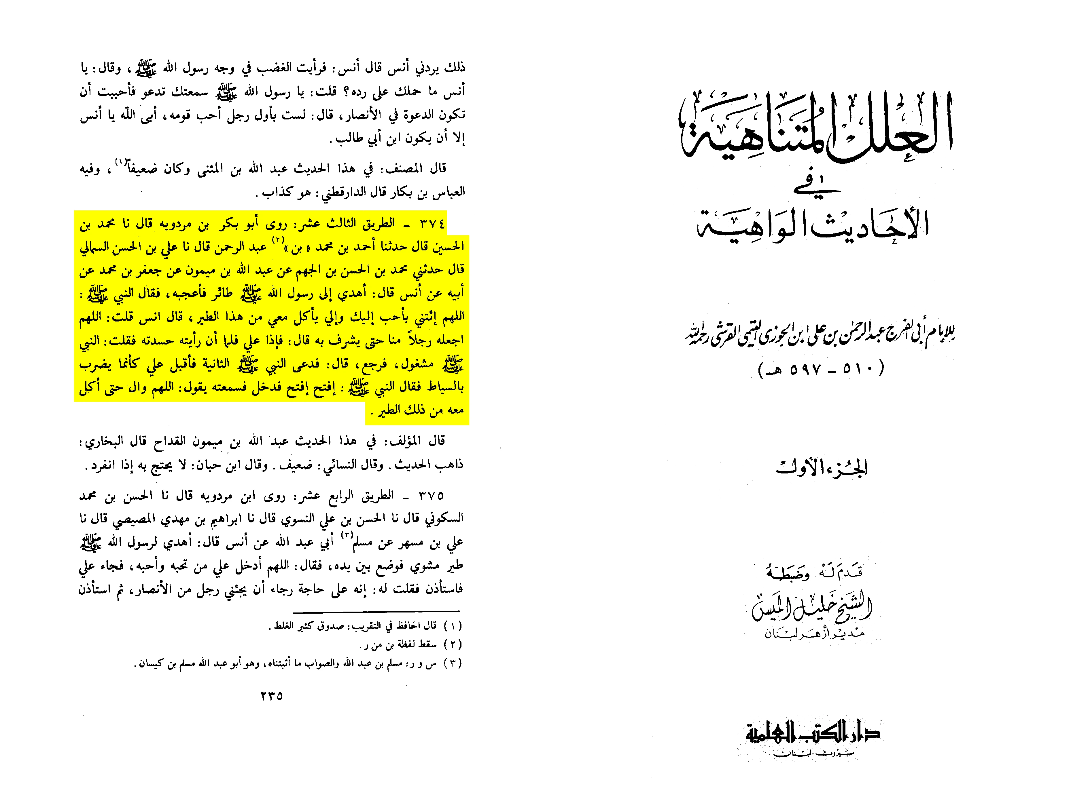 We also want you to take a look at how they talk about al-Hakim simply for authenticating Hadith al-Tayr in ‘Ilal al-Mutanahiyah, vol. 1, pg. 234: