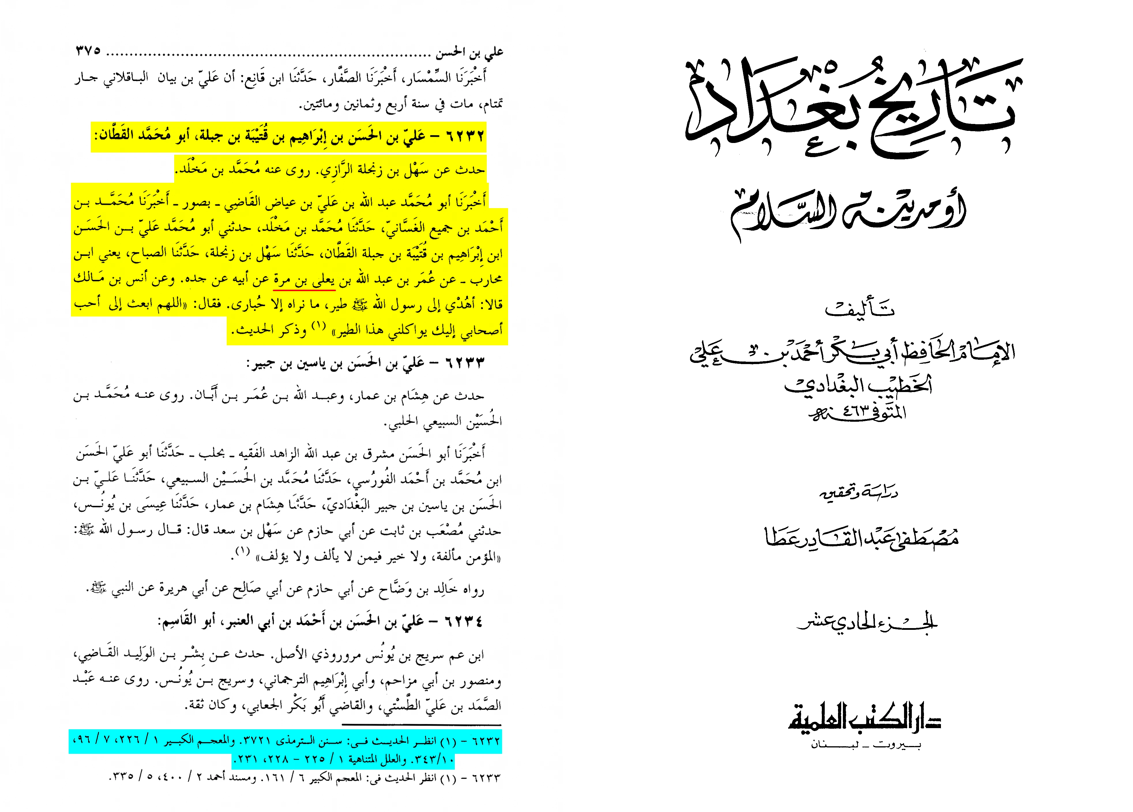 We ask again: Why did Ibn Udayy feel the need to explicitly mention that he narrated Hadith al-Tayr? He had to make the fact that he narrated Hadith al-Tayr clear to his reader. This truly shows that Sunni Hadith science was never about who was reliable and truthful, it was always about how well a narrator managed to censor what Ahlus Sunnah dislikes!