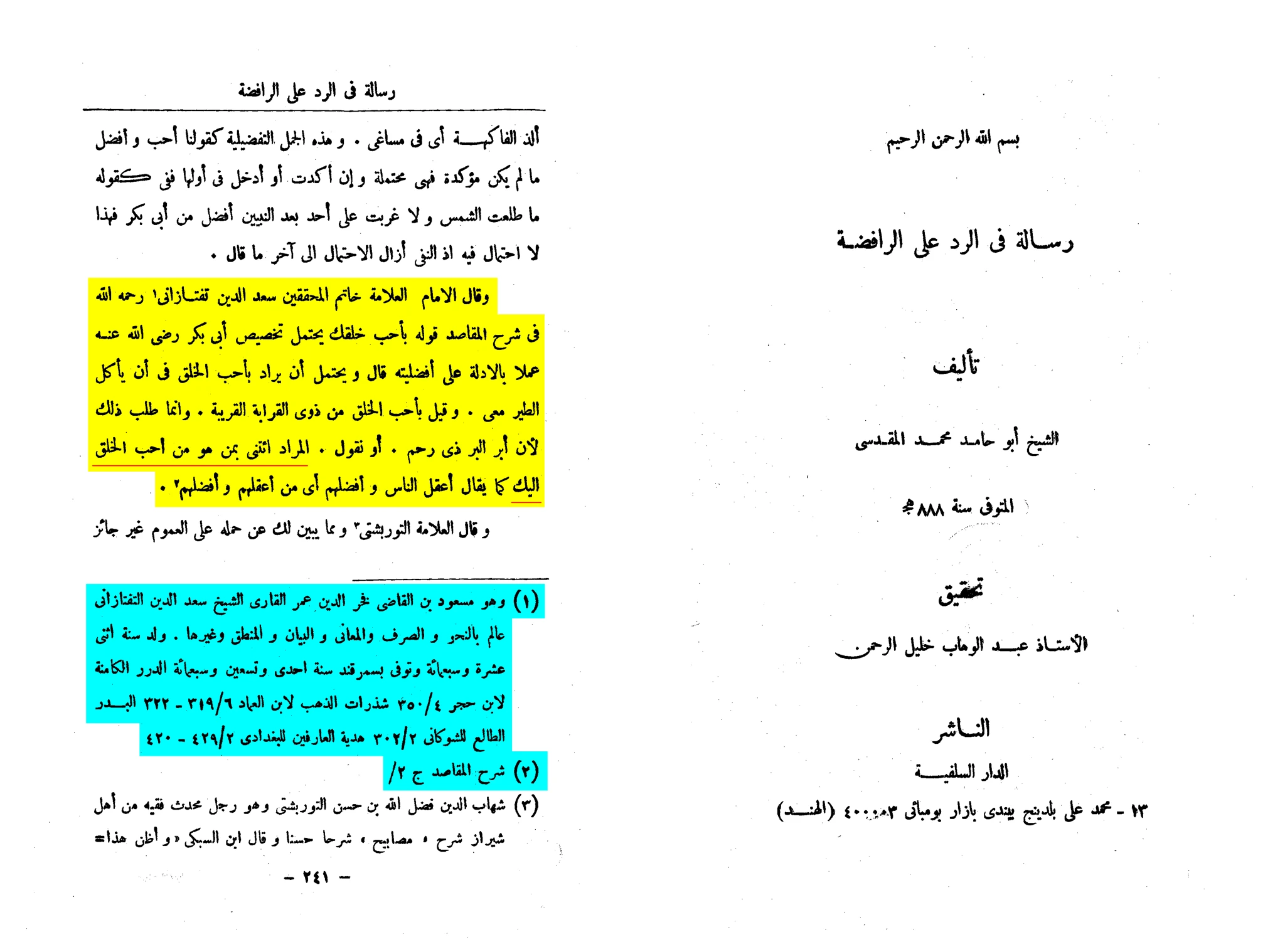 We read in al-Radd ‘ala al-Rafida, pg. 241 by al-Maqdisi: