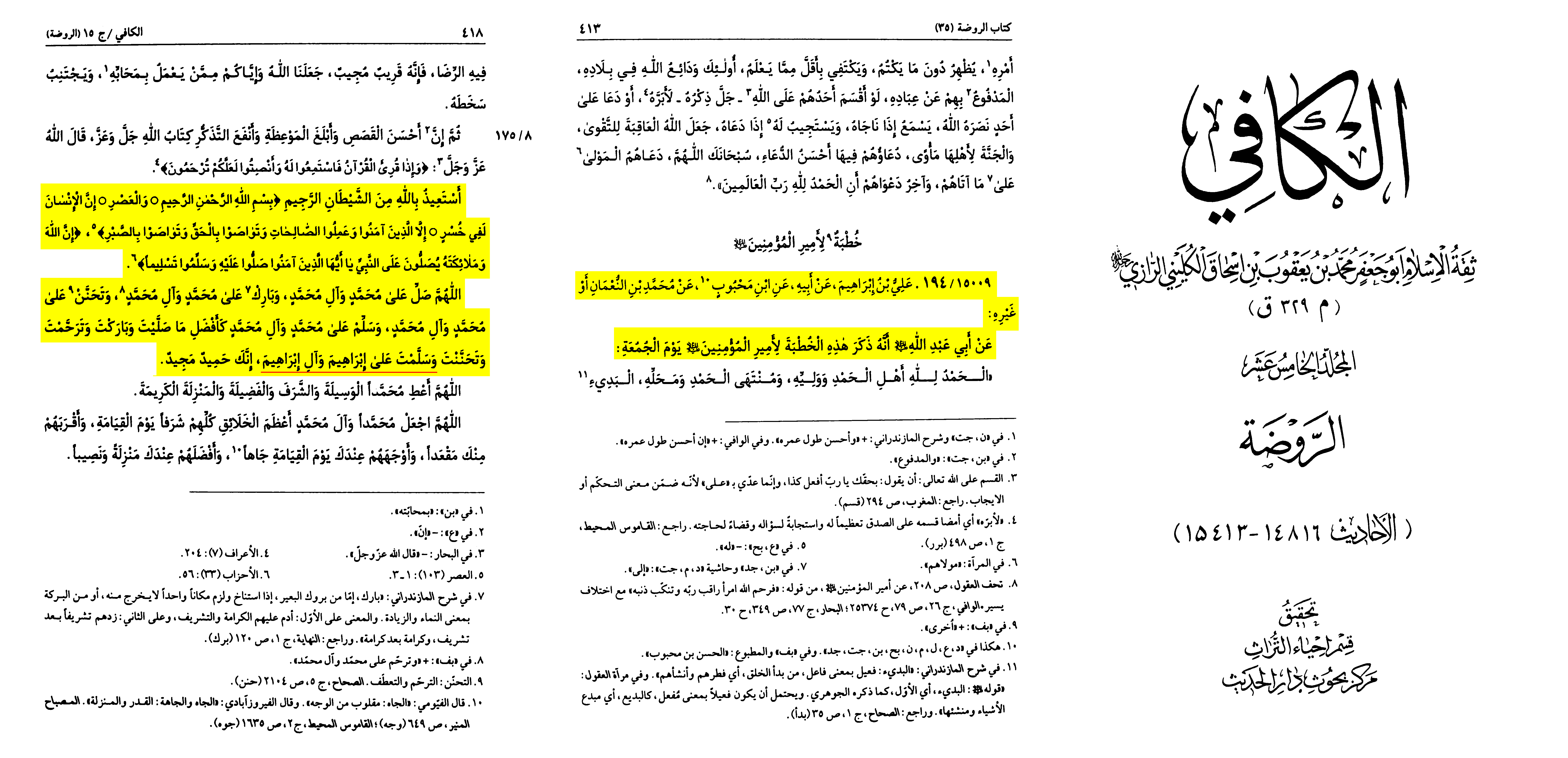 Ali ibn Ibrahim, from his father, from Ibn Mahbub, from Muhammad ibn al-Nuʿman or another, from Abu Abdillah, that he mentioned this sermon of the Commander of the Faithful on the day of Jumuah: