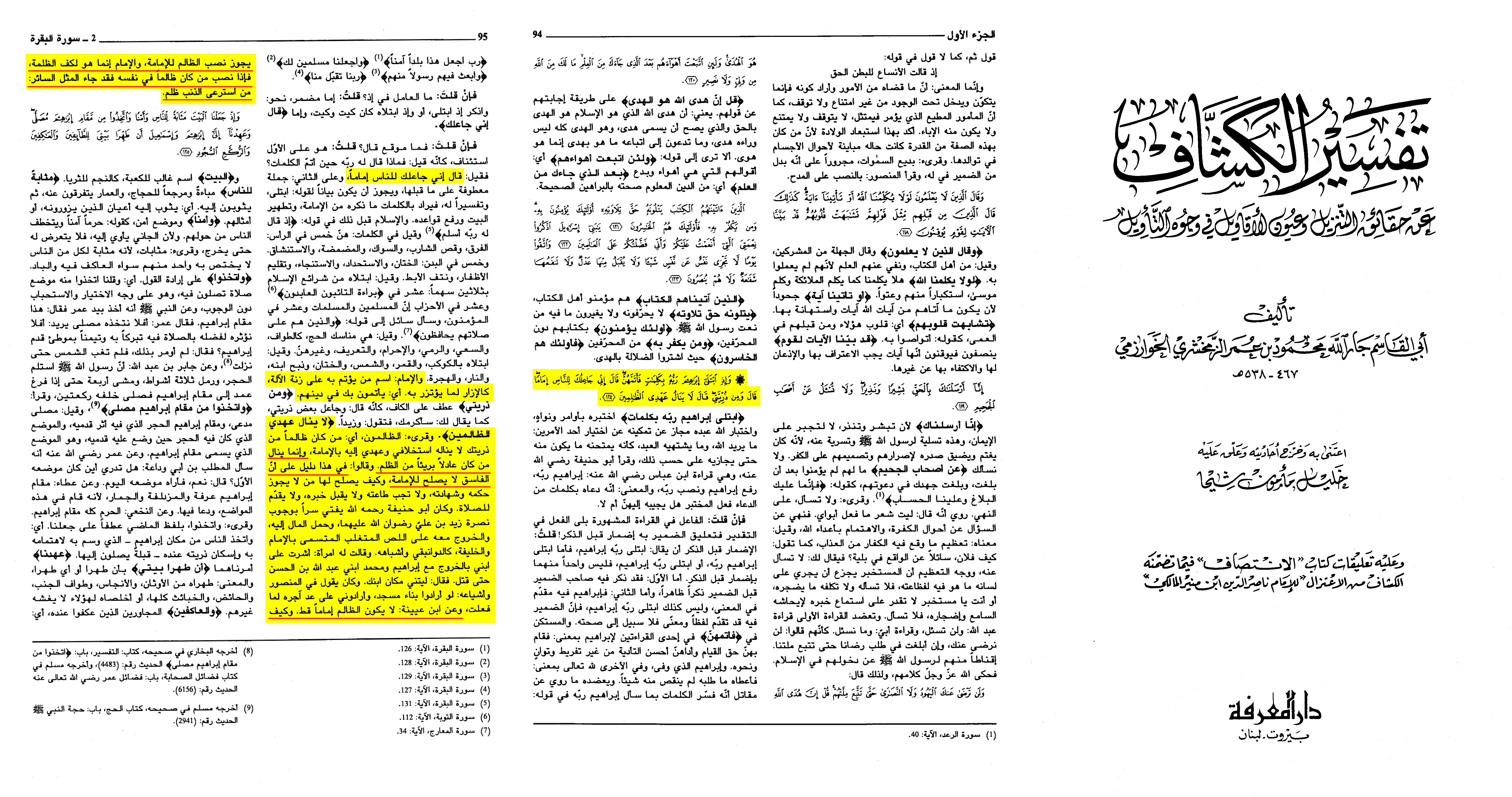 Again, there is a clear divine mandate in this verse. In other verses, Abraham is identified with prophethood (nubuwwa), messengership (risala), friendship (khulla), but in this verse, Imamate is a separate station. There is also a link between the Imamate and a covenant (`ahd), which belongs to Allah and not the people. Abraham asks about a continuity of this Imamate among his progeny, which partially occurs, on the condition that it does not reach the unjust (dhalimeen). This means that injustice and Imamate cannot be combined (thulm is a mani` of khilafah), and therefore an Imam cannot be a doer of evil. This view is confirmed by Zamakhshari in Tafsir Kashaf, pg. 194 -195