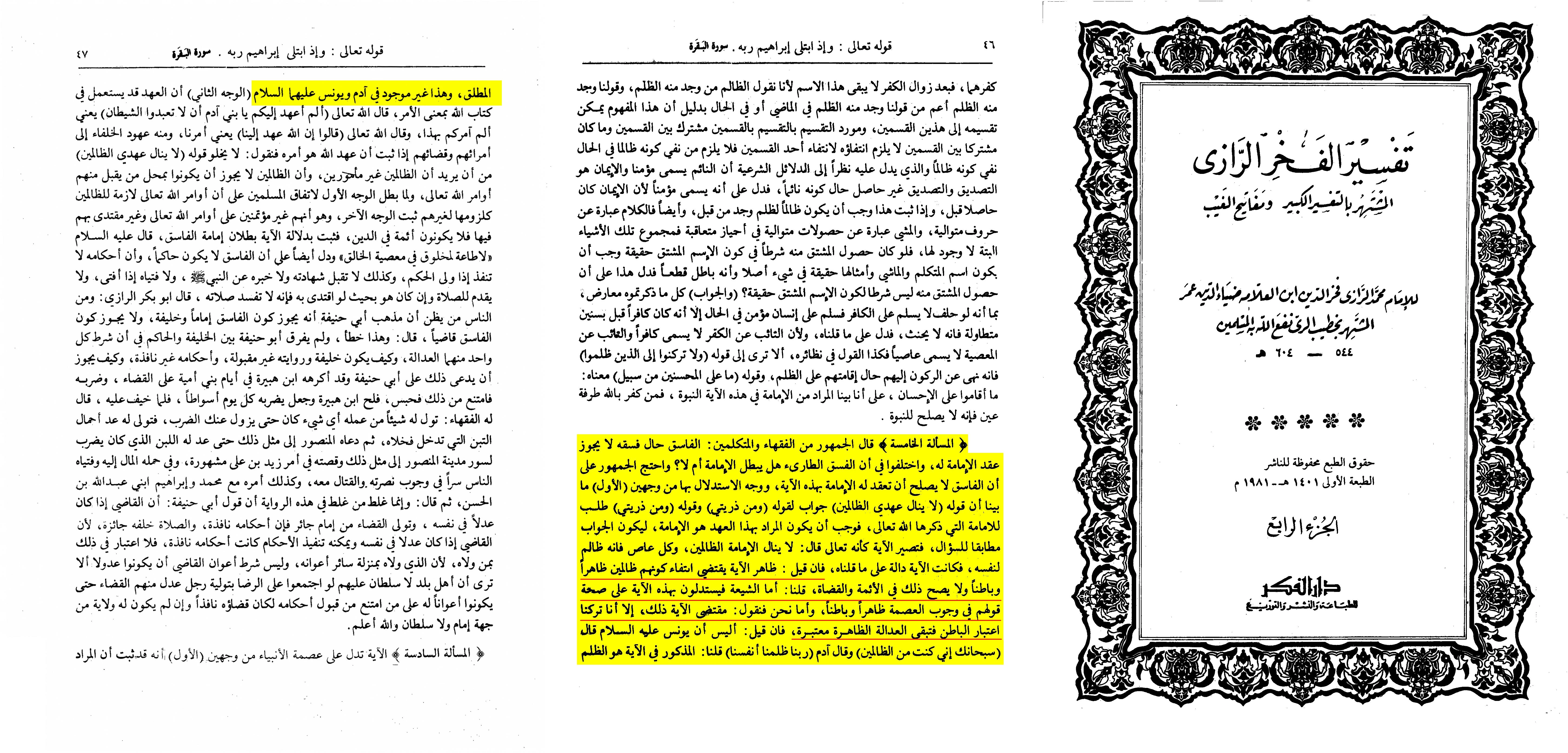 The first: It is clear that His saying “My covenant does not extend to the wrongdoers (thalimin)” is a reply to His saying “and for my descendants?”. His saying “and for my descendants?” is a request for the leadership that Allah mentioned [earlier]. It is thus necessary for the meaning of this covenant to be leadership in order for it to be a response to the question. So, it is as though the verse would be saying, “leadership does not extend to the wrongdoers.” All who disobey [Allah] wrong themselves (dhalim li nafsih), so, the verse indicates what we have said. If it is said, “the apparent meaning of this verse would negate both the outward and the inward wrongdoer, and that is not the case for the imams and the judges”, then we say, “the Shi’a use this verse to prove the correctness of their doctrine that necessitates the outward and inward infallibility [of an Imam].” As for us, we say, “the verse requires that, except that we leave out the inward consideration, and outward justice remains considered.” If it is said, “Didn’t Jonah (as) say, ‘Glory to You! Surely, I was of the wrongdoers’ (21:87), and didn’t Adam say, ‘Our Lord! We have wronged ourselves.’ (7:23)’, then we say, ‘What the [original] verse is referring to is a constant wrongdoer (al-thalim al-mutlaq), and this is not the case for Adam and Yunus (as).