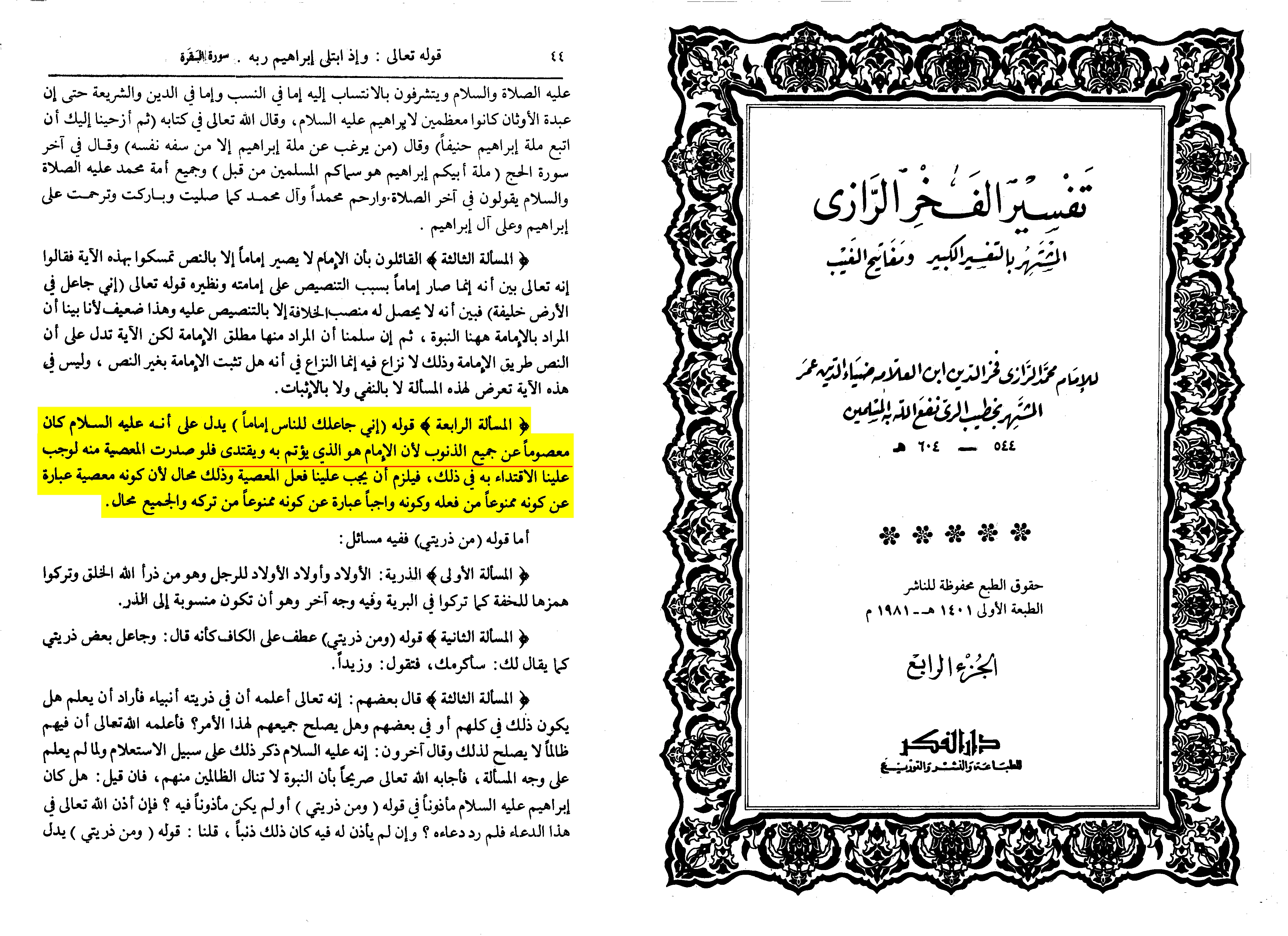 As well as, Fakhr Al Razi in Tafsir Al Kabir Vol 4, pg. 44, with Razi even going so far as to say the Imam is Ma'sum (Infallible):