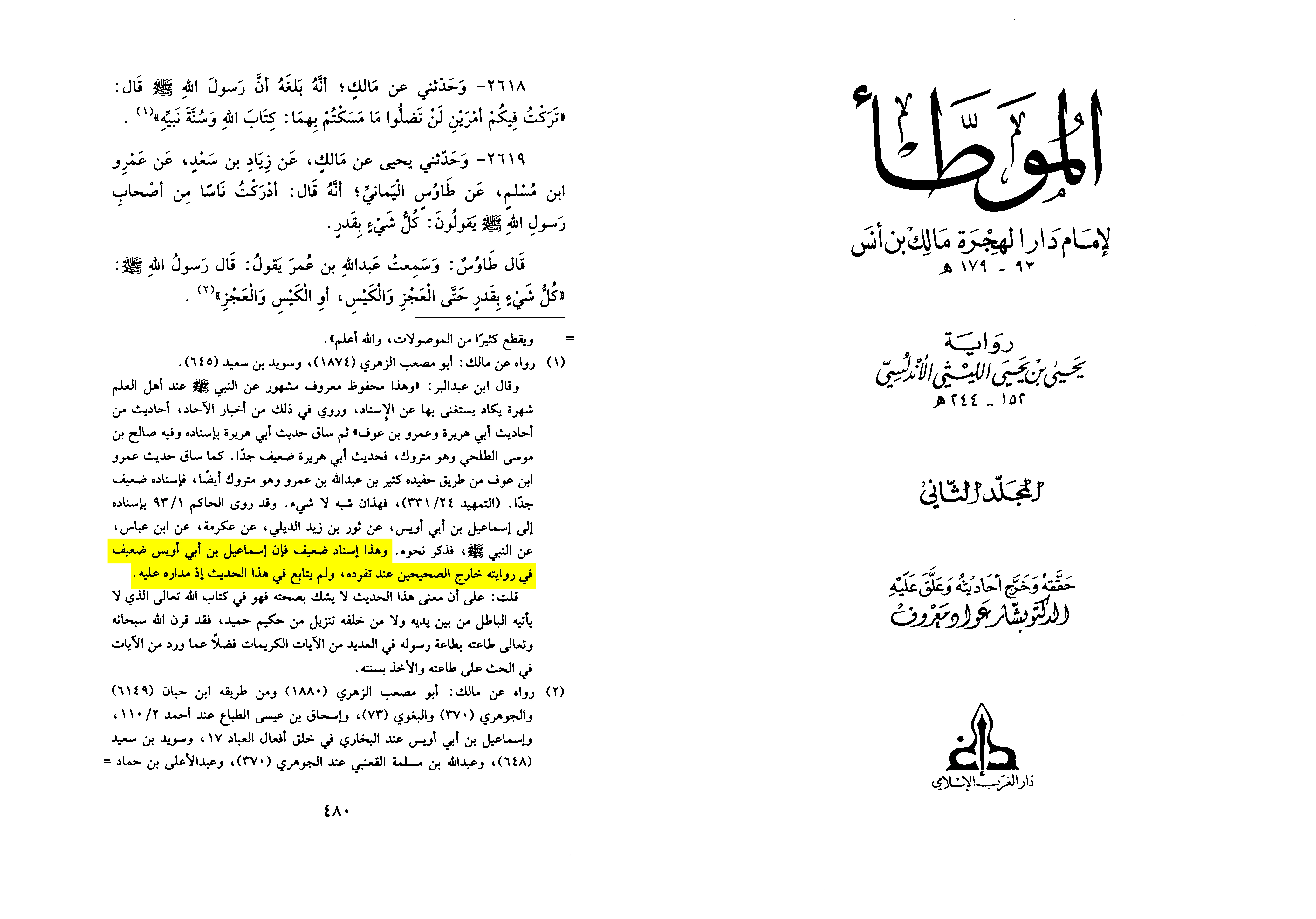 We also have the words of the contemporary scholar Bashar ‘Awad Ma’ruf in his critical edition of Muwatta' Malik b. Anas, Vol. 2, pg. 480: