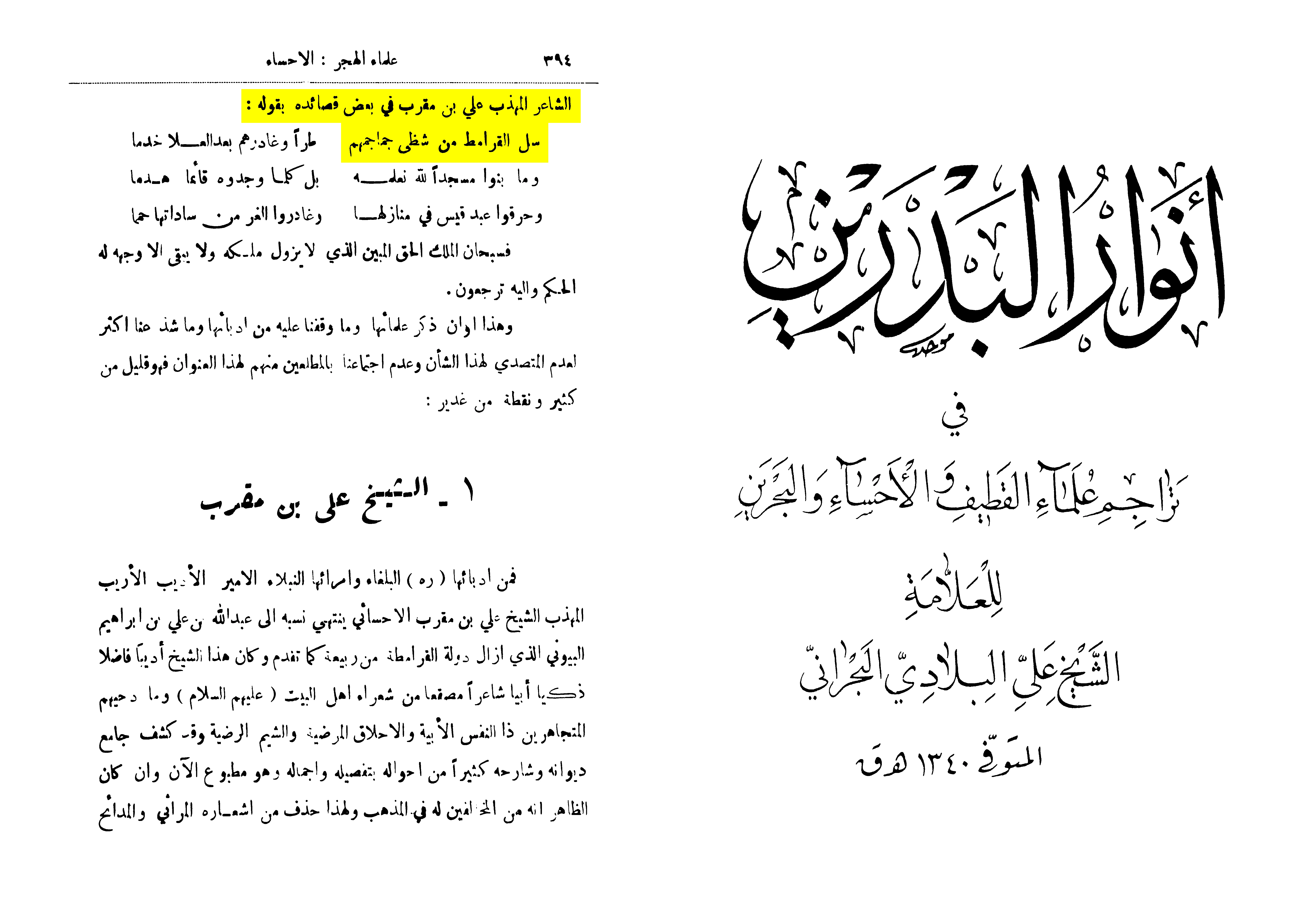 الشاعر المهذب علي بن مقرب في بعض قصائده بقوله: سل القرامط من شظى جماجمهم