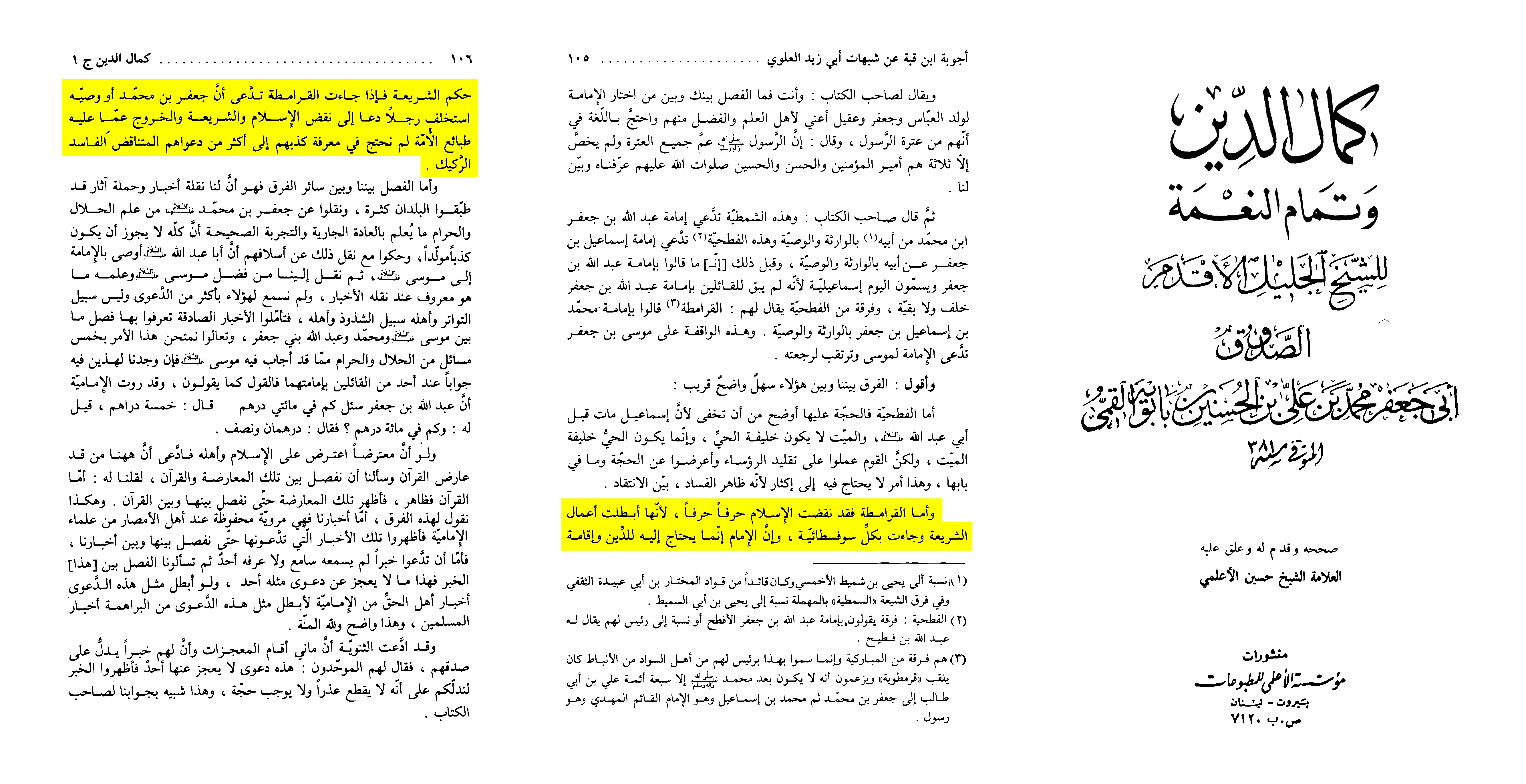 As for the Qaramita, they have transgressed Islām in all matters, for they have abolished the legal actions and brought all kinds of sophistry [to justify themselves]. And the Imām is required for the [existence of the] Religion, and for the establishment of the legal judgements. Then if the Qarāmiṭa come claiming that Jaʿfar b. Muḥammad or the Executor of his will has appointed a man who calls towards the violation of Islām and of the [Divine] Law, or [towards] the deviation from the traditions of the Ummah, we would not need more than their inconsistent, false and weak claims in order to recognize their lies.
