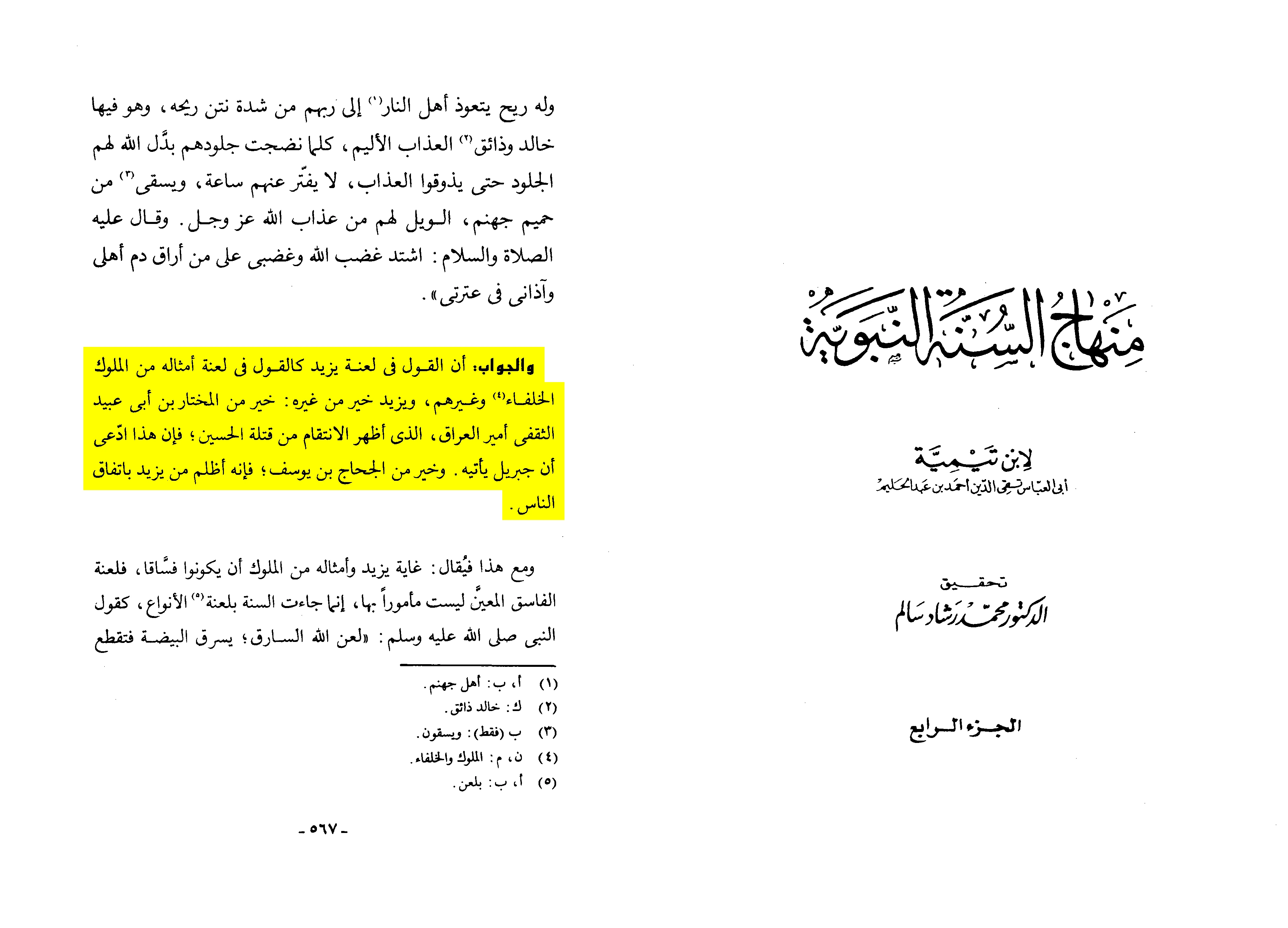 - .... والجواب أن القول في لعنة يزيد كالقول في لعنة أمثاله من الملوك الخلفاء وغيرهم ، ويزيد خير من غيره خير من المختار بن أبي عبيد الثقفي أمير العراق الذي أظهر الانتقام من قتلة الحسين فإن هذا أدعي أن جبريل يأتيه ، وخير من الحجاج بن يوسف فانه أظلم من يزيد باتفاق الناس