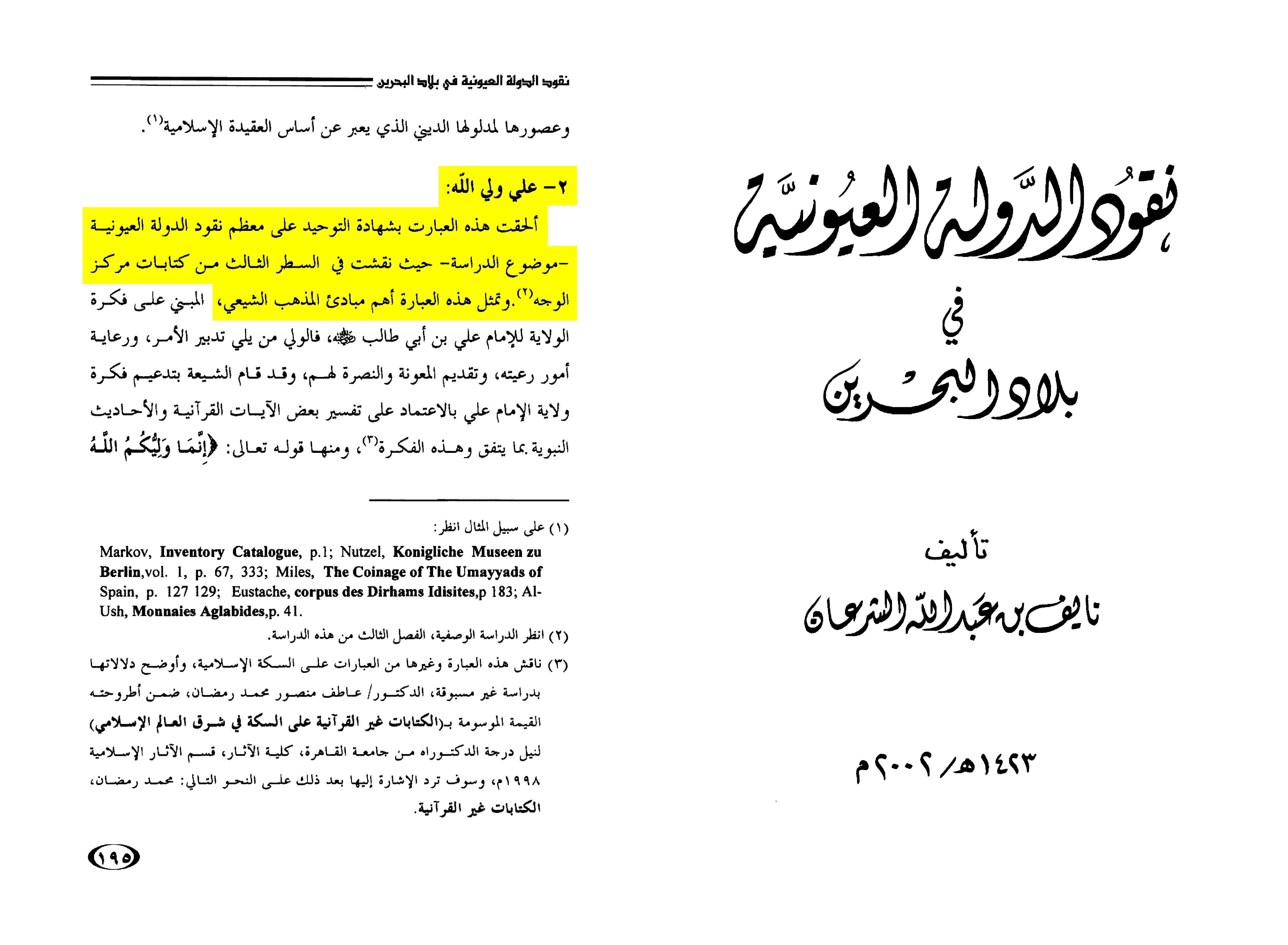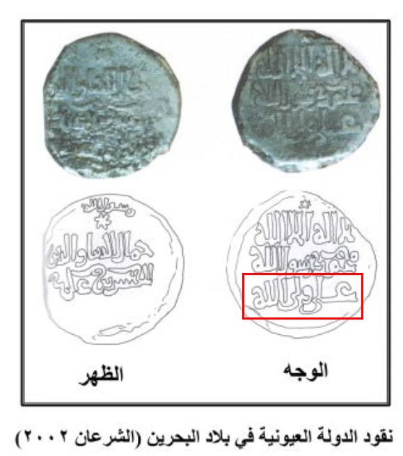 This phrase follows the phrases testifying to tawhid on the coins of the Uyunid state -the topic of research- and it was minted on the third line at the center of the face of the coin. And this phrase signifies one of the most foundational beliefs of the Shia sect.