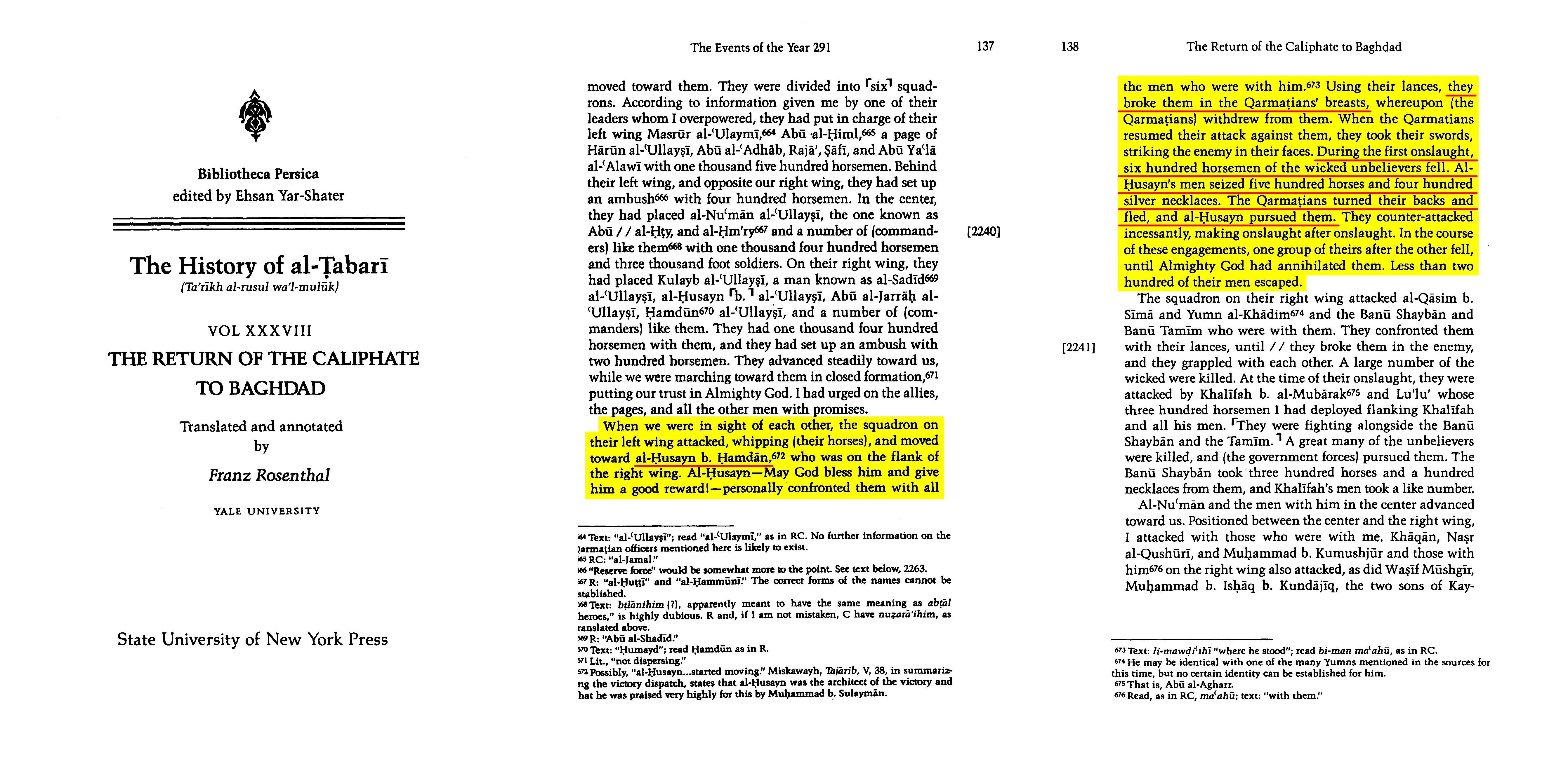 When we were in sight of each other, the squadron on their left wing attacked, whipping (their horses), and moved toward al-Husayn b. Hamdan, who was on the flank of the right wing. Al-Husayn-May God bless him and give him a good reward!-personally confronted them with all the men who were with him. Using their lances, they broke them in the Qaramita' breasts, whereupon (the Qaramita) withdrew from them. When the Qaramita resumed their attack against them, they took their swords, striking the enemy in their faces. During the first onslaught, six hundred horsemen of the wicked unbelievers fell. Al Husayn's men seized five hundred horses and four hundred silver necklaces. The Qarmatians turned their backs and fled, and al-Husayn pursued them. They counter-attacked incessantly, making onslaught after onslaught. In the course of these engagements, one group of theirs after the other fell, until Almighty God had annihilated them. Less than two hundred of their men escaped.