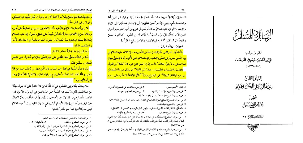 Furthermore, al-Sharif al-Murtada himself believed Ghadir is an unquestionable proof for imamate. This was mentioned in his al-Rasa'il wal-Masa'il, Vol. 3, pg. 320 - 321: