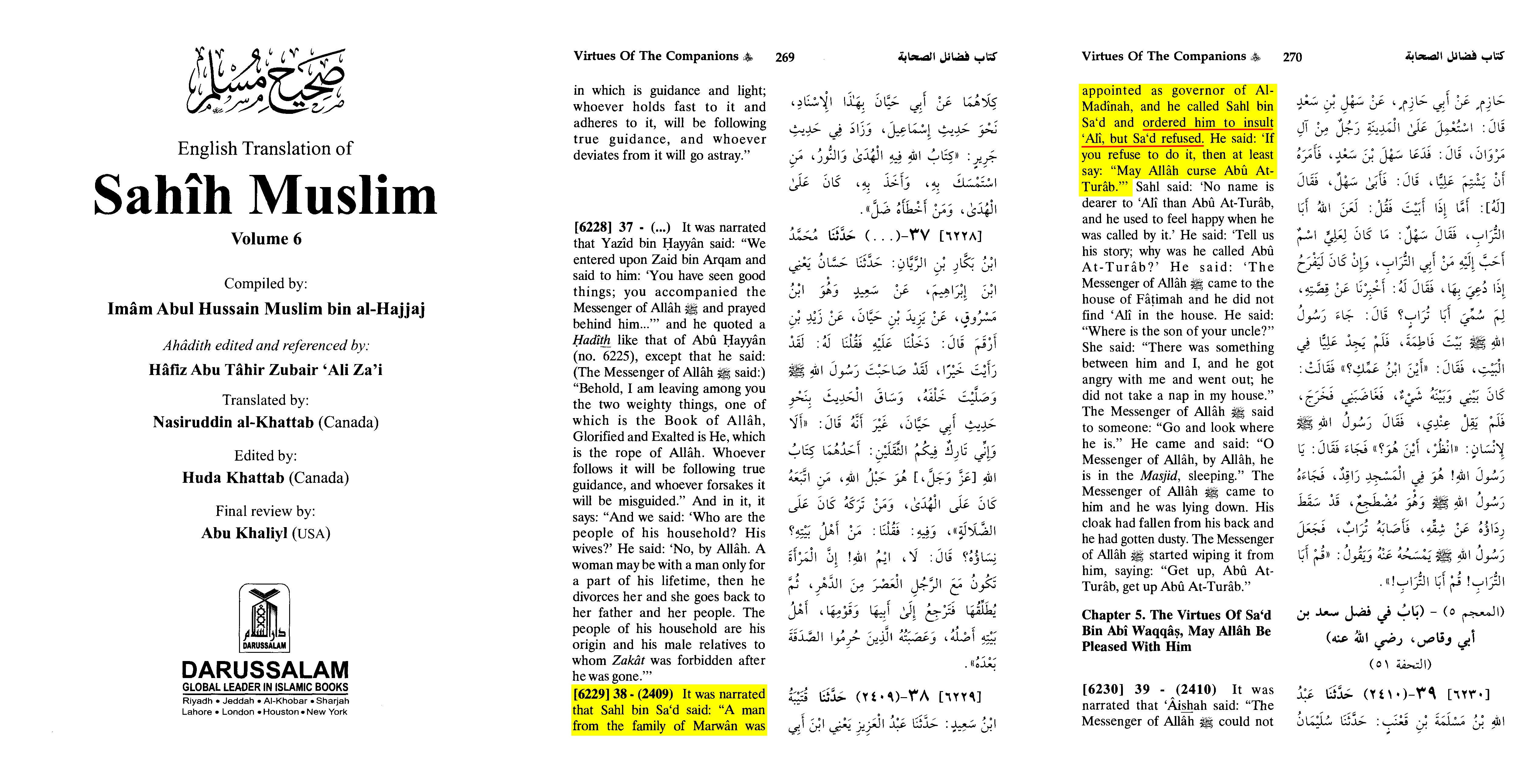 "A man from the family of Marwan was appointed as governor of Al-Madinah, and he called Sahl bin Sa'd and ordered him to insult 'Alî, but Sa'd refused. He said: 'If you refuse to do it, then at least say: "May Allâh curse Abû At- Turâb."