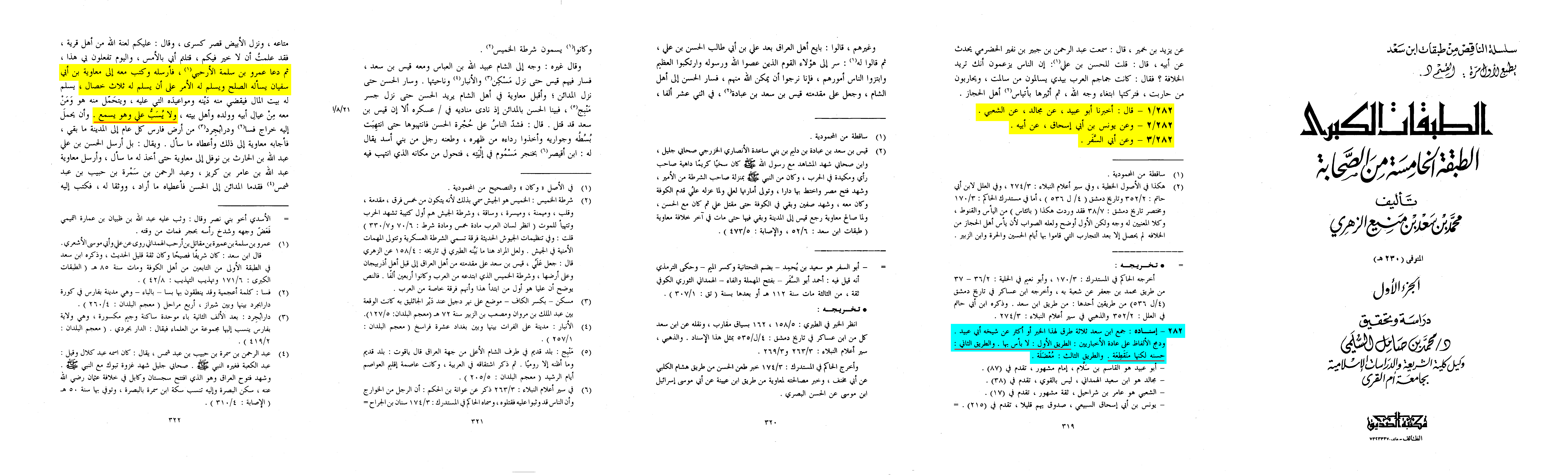 Al-Shaykh Muhammad al-Sulami, the editor of this edition of Taqabat Ibn Sa’ad has said that the first chain of transmission is acceptable, and the second is good though it has a disconnection.