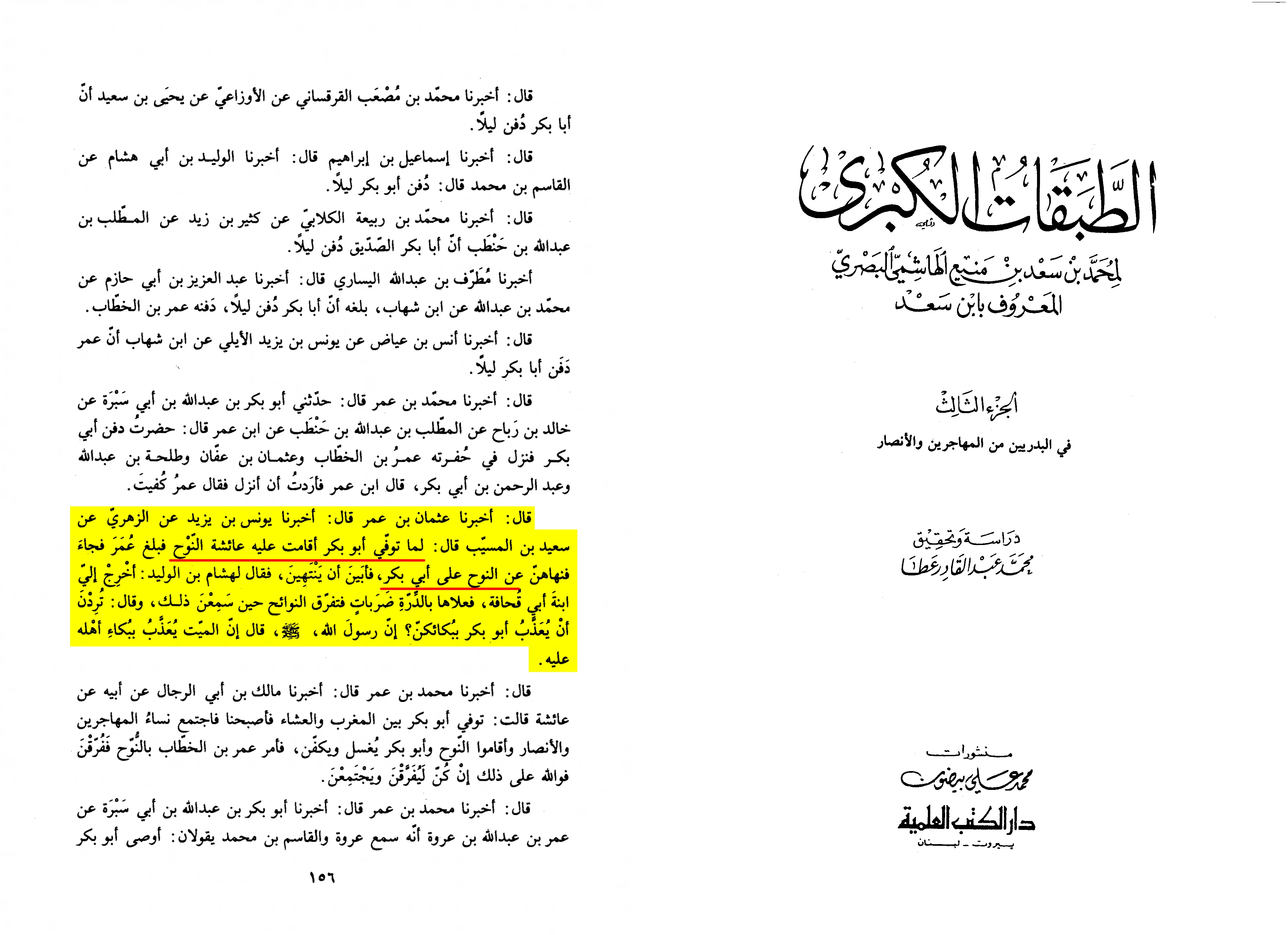 لَمَّا تُوُفِّي أَبُو بَكْرٍ أَقَامَتْ عَلَيْهِ عَائِشَةُ النَّوْحَ فَبَلَغَ عُمَرَ فَجَاءَ فَنَهَاهُنَّ عَن النّوْحِ عَلَى أَبِي بَكْرٍ. فَأَبَيْنَ أَنْ يَنْتهِينَ. فَقَالَ لِهِشَامِ بْنِ الْوَلِيدِ: أَخْرِجْ إِلَيَّ ابْنَةَ أَبي قحافة. فعلاها بالدرة ضربات فتفرق النوائح حين سمعن ذلك. وقال: تردن أن يعذب أبو بكر ببكائكن؟ إن رسول الله - صلى الله عليه وسلم -[قال إن الميت يعذب ببكاء أهله عليه]