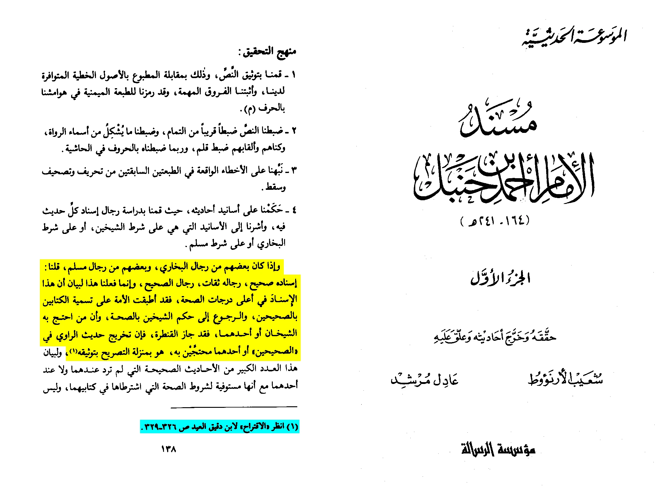 وإذا كان بعضهم من رجال البخاري، وبعضهم من رجال مسلم، قلنا : إسناده صحيح ، رجاله ثقات، رجال الصحيح ، وإنما فعلنا هذا لبيان أن هذا الإسناد في أعلى درجات الصحة، فقد أطبقت الأمة على تسمية الكتابين بالصحيحين، والرجوع إلى حكم الشيخين بالصحة، وأن من احتج به الشيخان أو أحدهما، فقد جاز القنطرة، فإن تخريج حديث الراوي في «الصحيحين» أو أحدهما محتجين به هو بمنزلة التصريح بتوثيقه