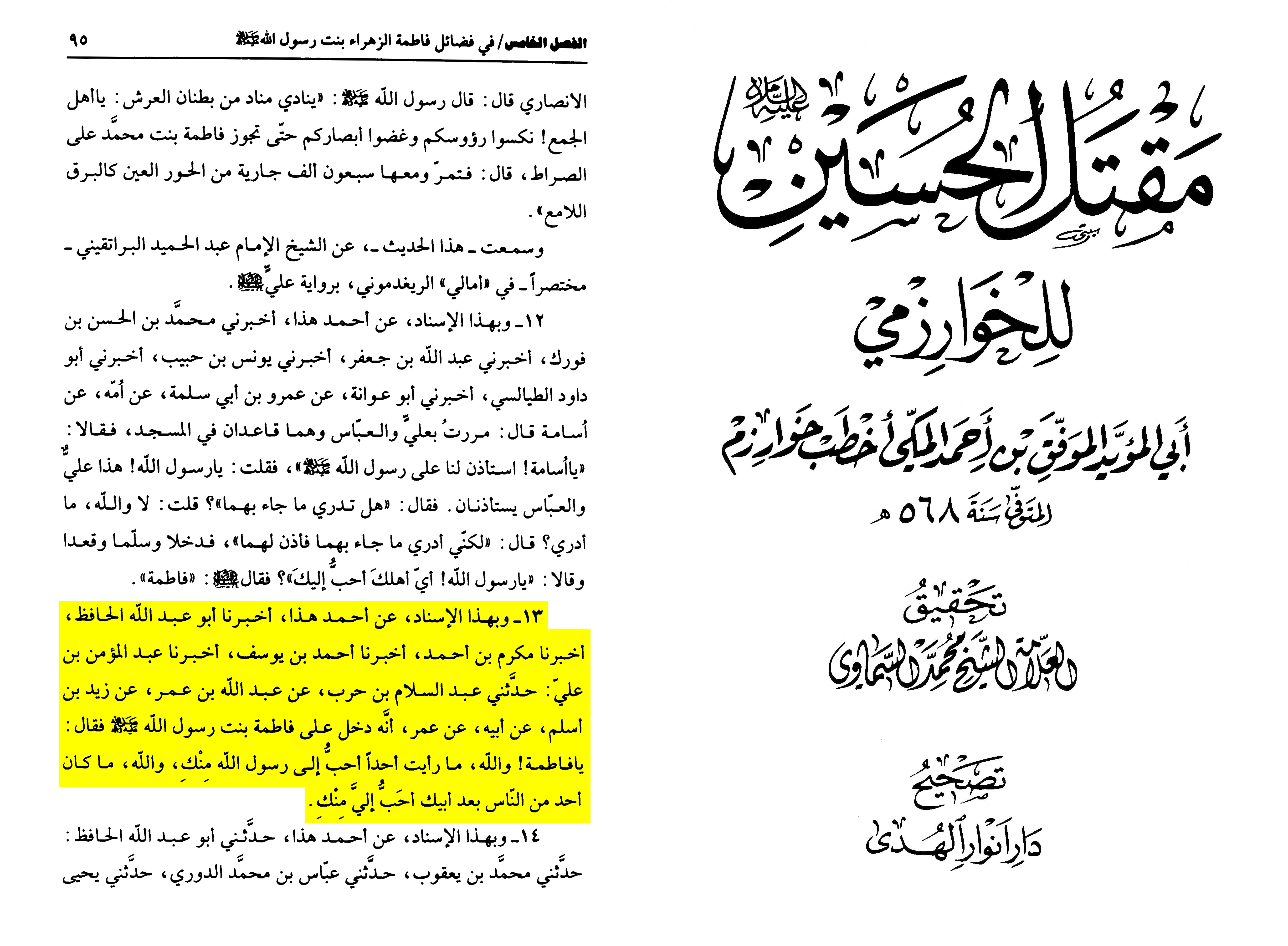 Narrated to us Makrem b. Ahmad al-Qadhi, from Ahmad b. Yusuf al-Hamdani, from Abd al-Mu’min b. Ali, from Abd al-Salam b. Harb, from Ubaydillah b. Umar, from Zayd b. Aslam, from Aslam, from Umar that he entered into the house of Fatima (as) and said: ‘Oh daughter of the Messenger of Allah, no one is dearest to us more than your father and no one dearest to us after your father than you.