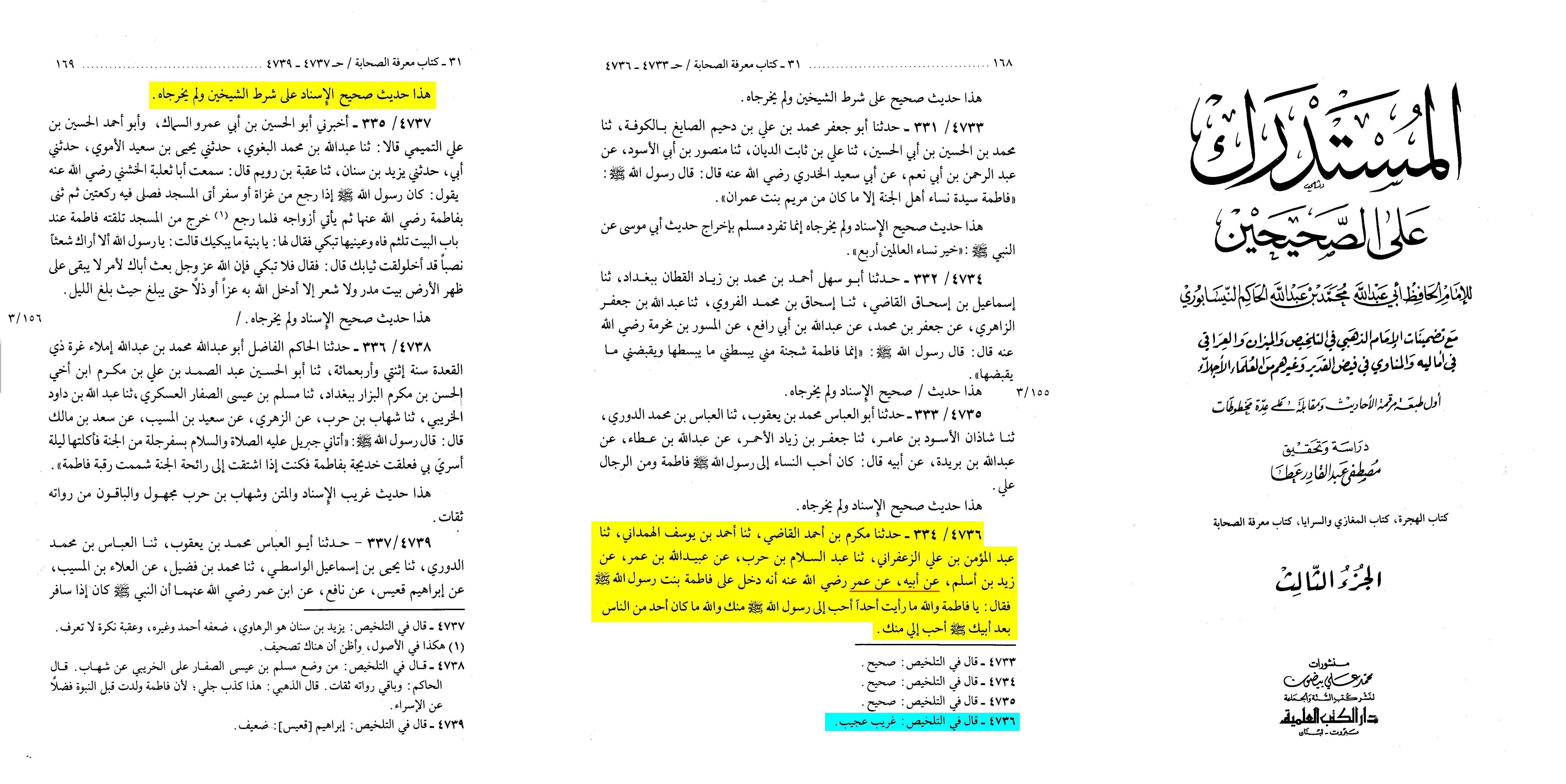 حدثنا : مكرم بن أحمد القاضي ، ثنا : أحمد بن يوسف الهمداني ، ثنا : عبد المؤمن بن علي الزعفراني ، ثنا : عبد السلام بن حرب ، عن عبيد الله بن عمر ، عن زيد بن أسلم ، عن أبيه ، عن عمر (ر) : أنه دخل على فاطمة بنت رسول الله (ص) ، فقال : يا فاطمة والله ما رأيت أحدا أحب إلى رسول الله (ص) منك ، والله ما كان أحد من الناس بعد أبيك (ص) أحب إلي منك ، هذا حديث صحيح الإسناد على شرط الشيخين ، ولم يخرجاه.