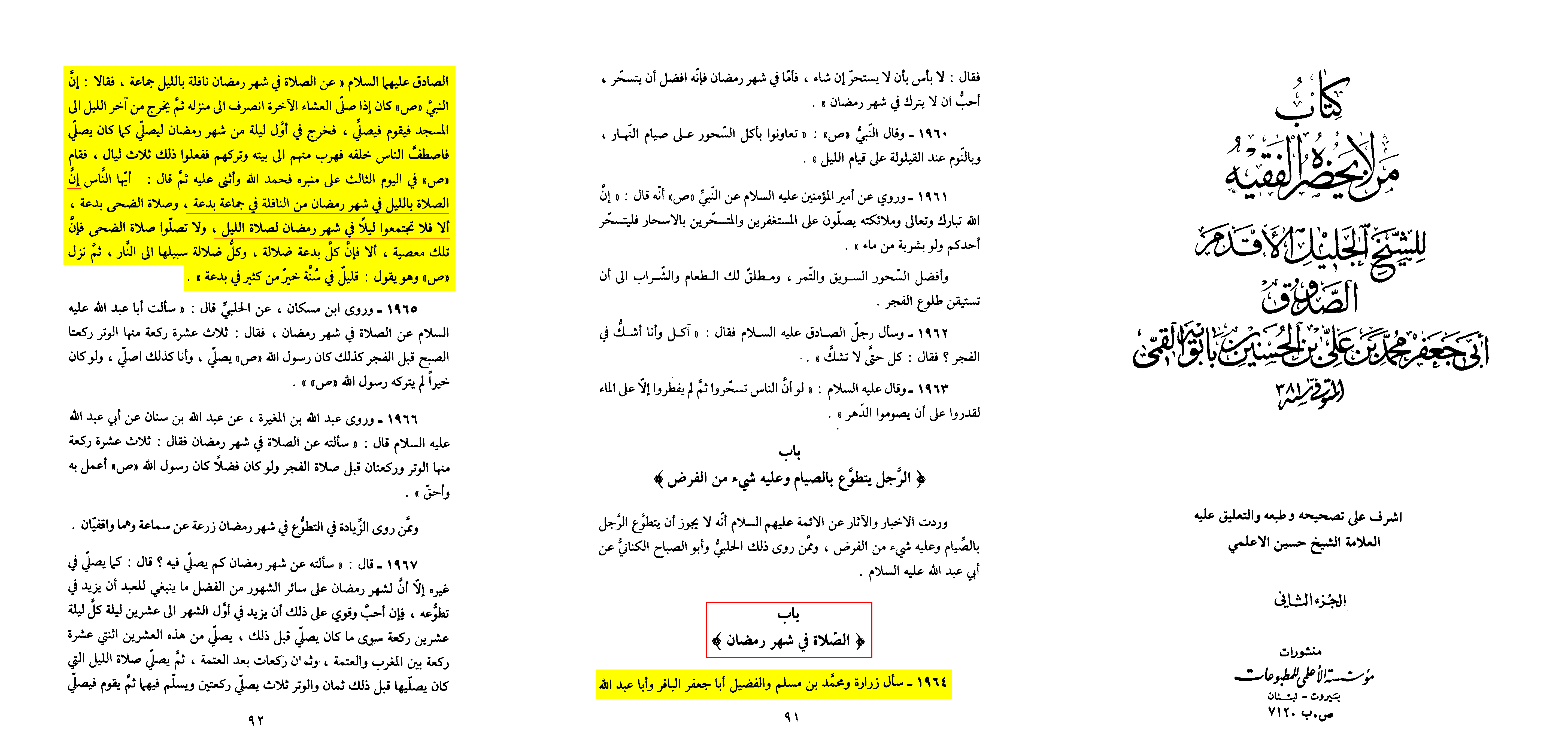 Zurārah, Muḥammad b. Muslim, and al-Fuḍayl asked Abā Jaʿfar al-Bāqir (as) and Abā ʿAbdillāh al-Ṣādiq (as) about offering nightly supererogatory prayers in congregation during the month of Ramaḍān.