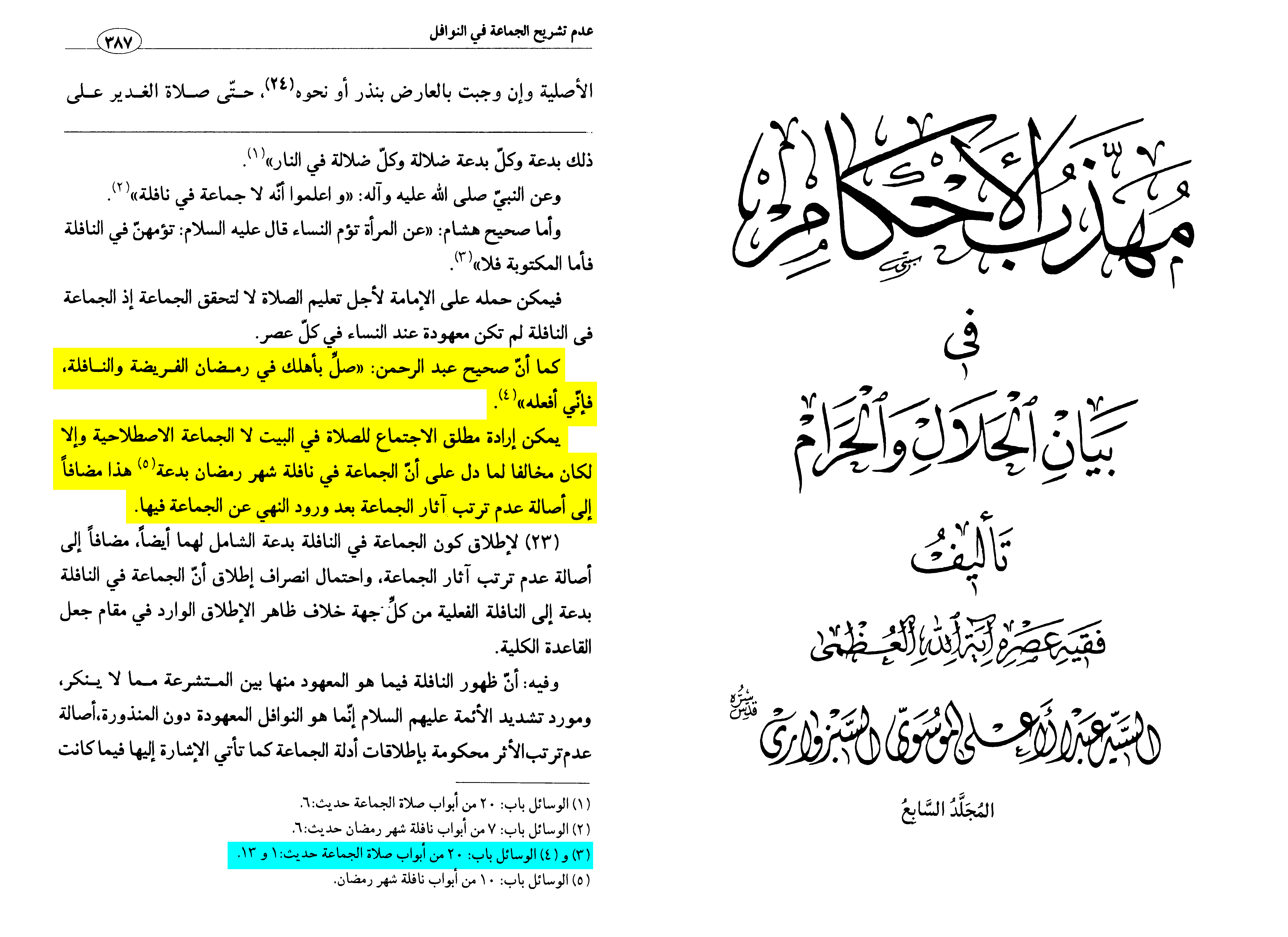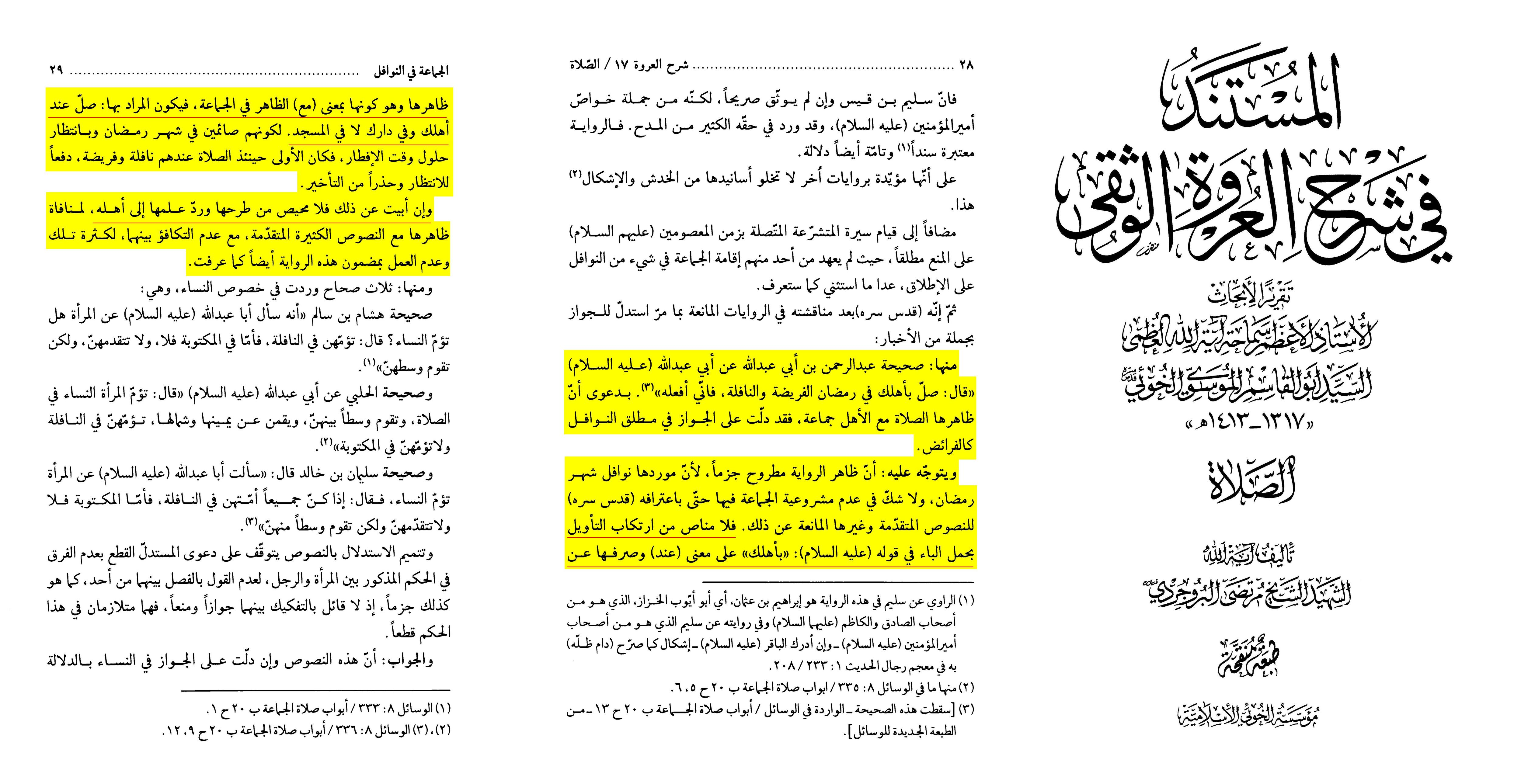 The apparent meaning of the narration must certainly be set aside, because its subject concerns the supererogatory prayers of the month of Ramadān, and there is no doubt regarding the non-permissibility of congregation in them according to his (i.e. Sayyid al-Khūʾī) own admission, due to the previously mentioned texts and others that prohibit it.