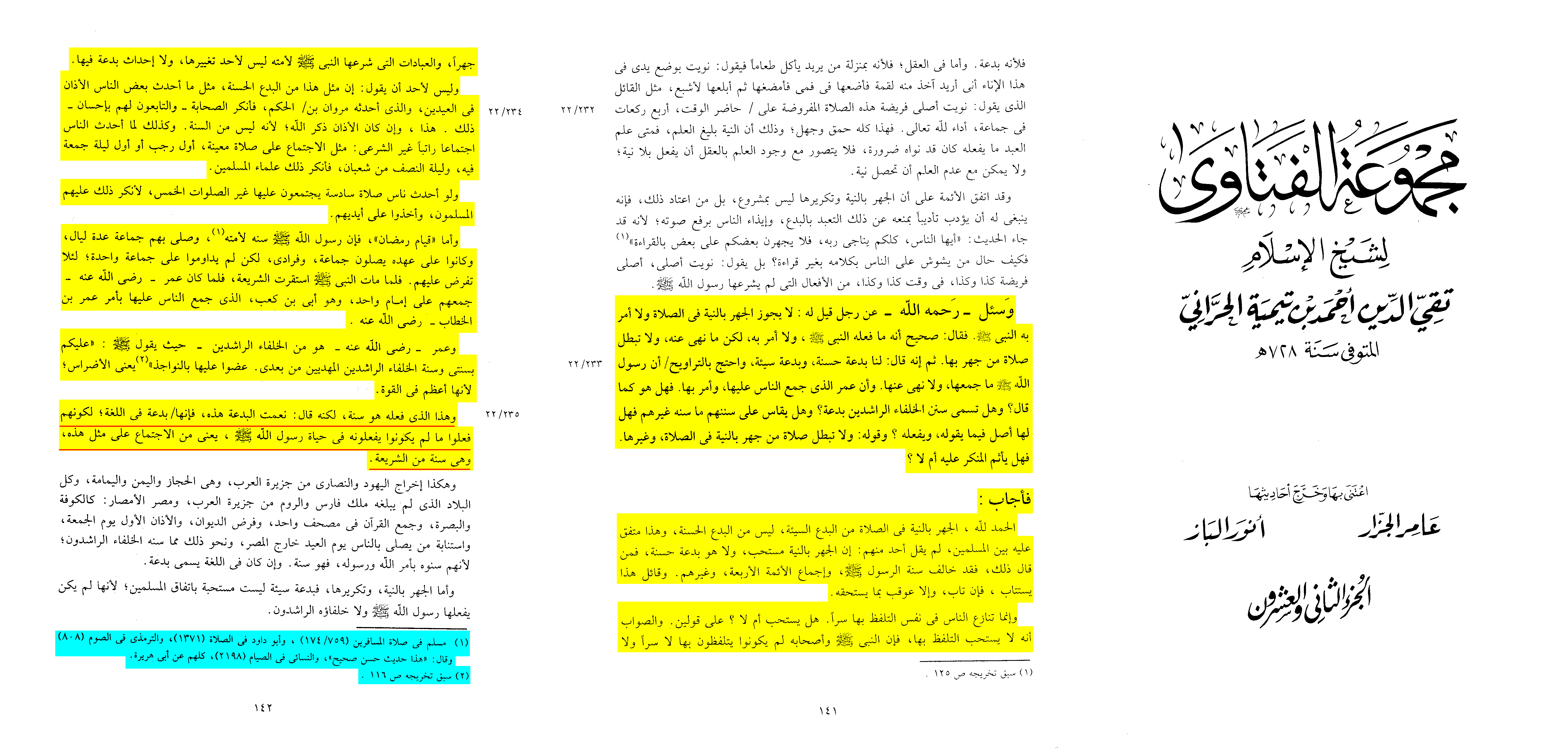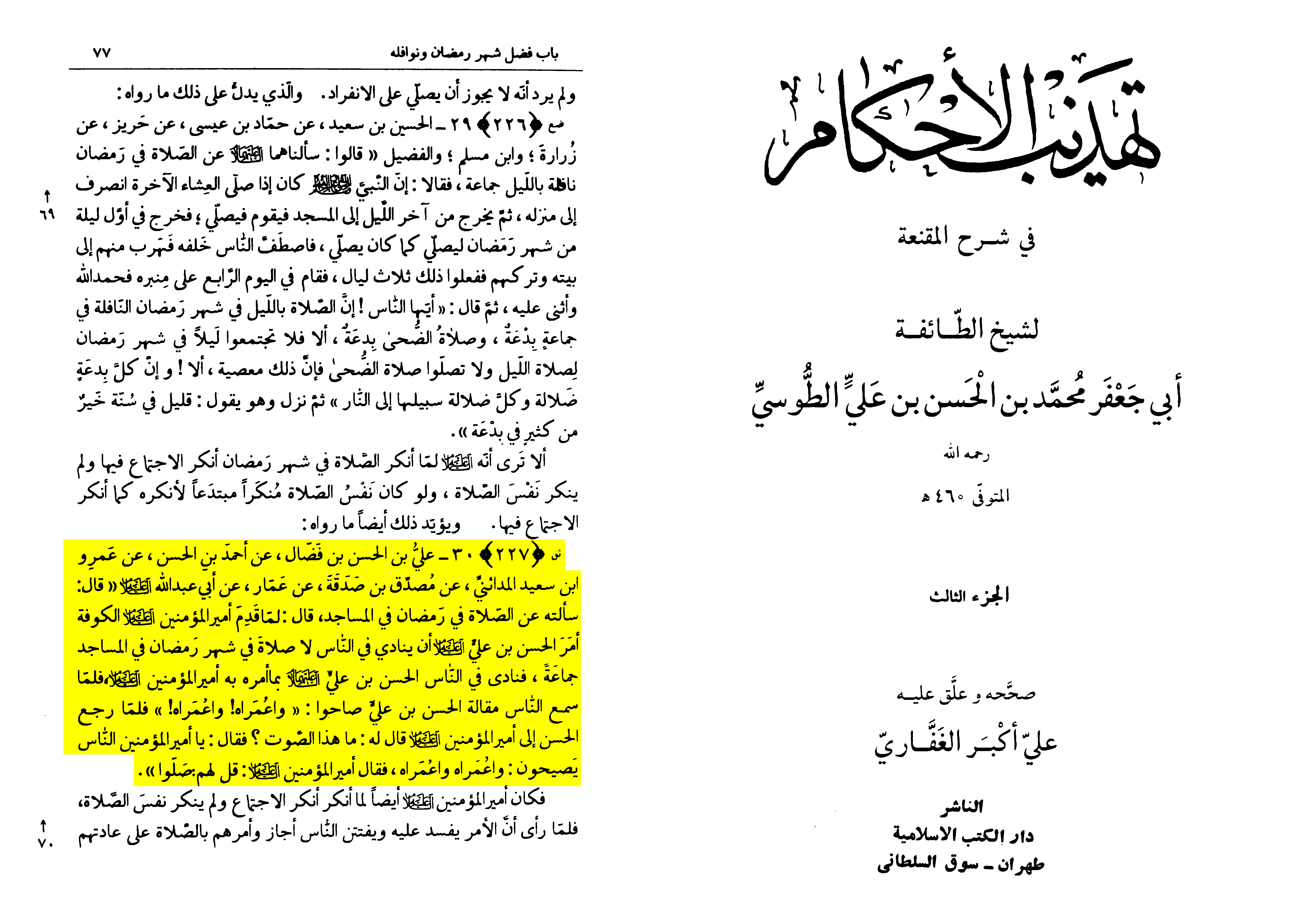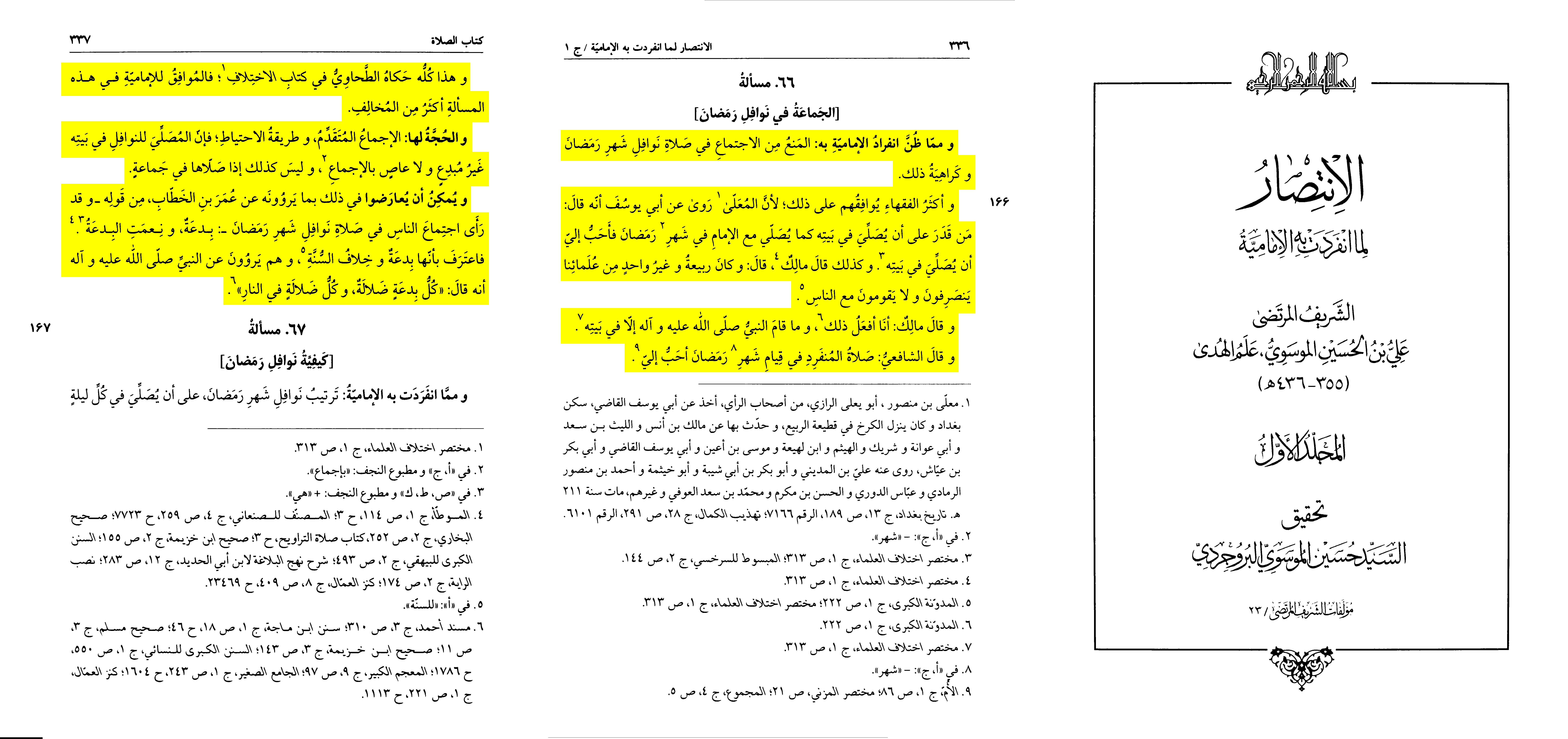 [Tusi says:] Thus the Commander of the Faithful, when he objected, objected to the gathering and did not object to the prayer itself. Then, when he saw that the matter would lead to disorder for him and that the people would fall into discord, he permitted it and ordered them to pray according to their custom.