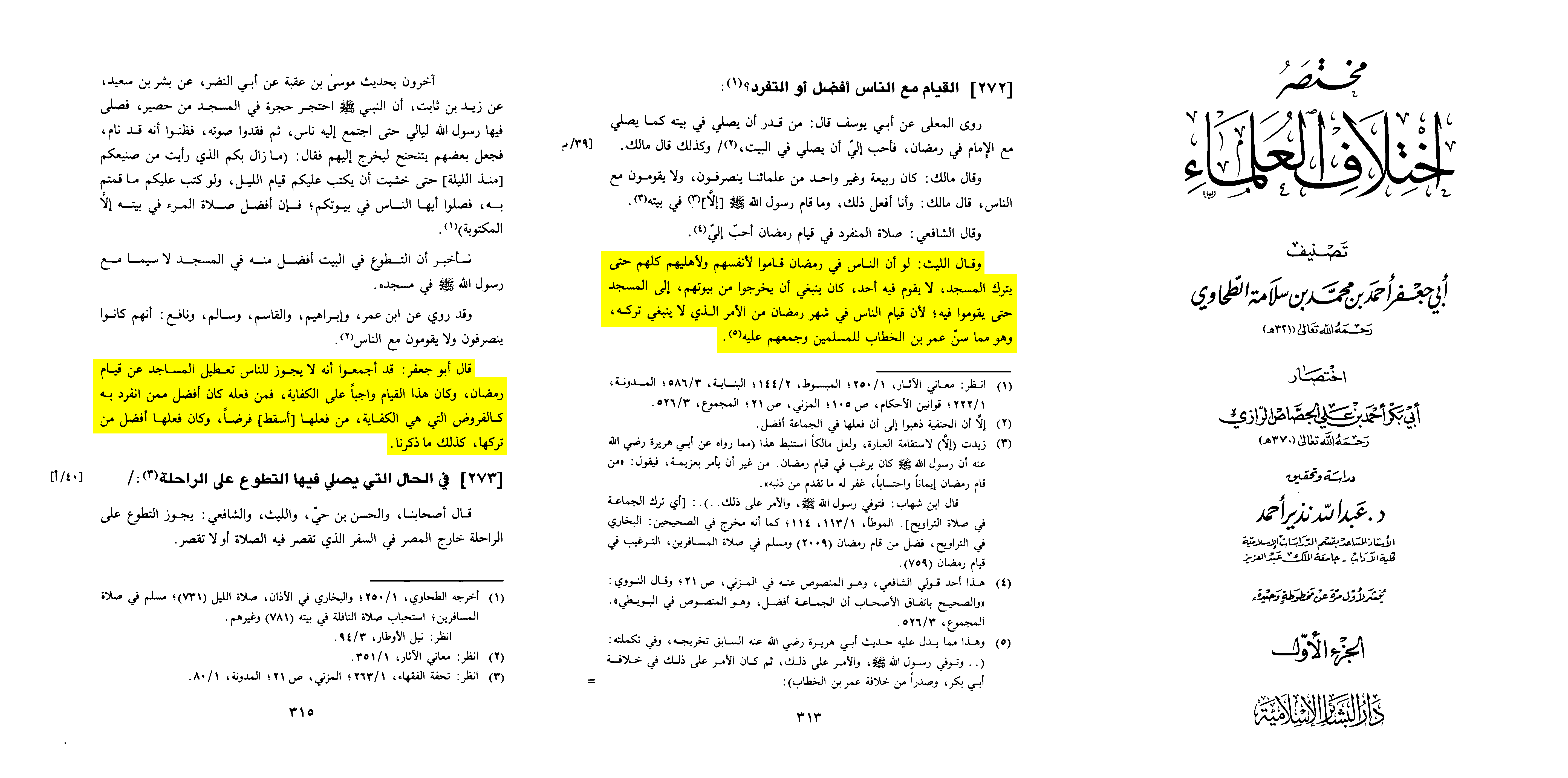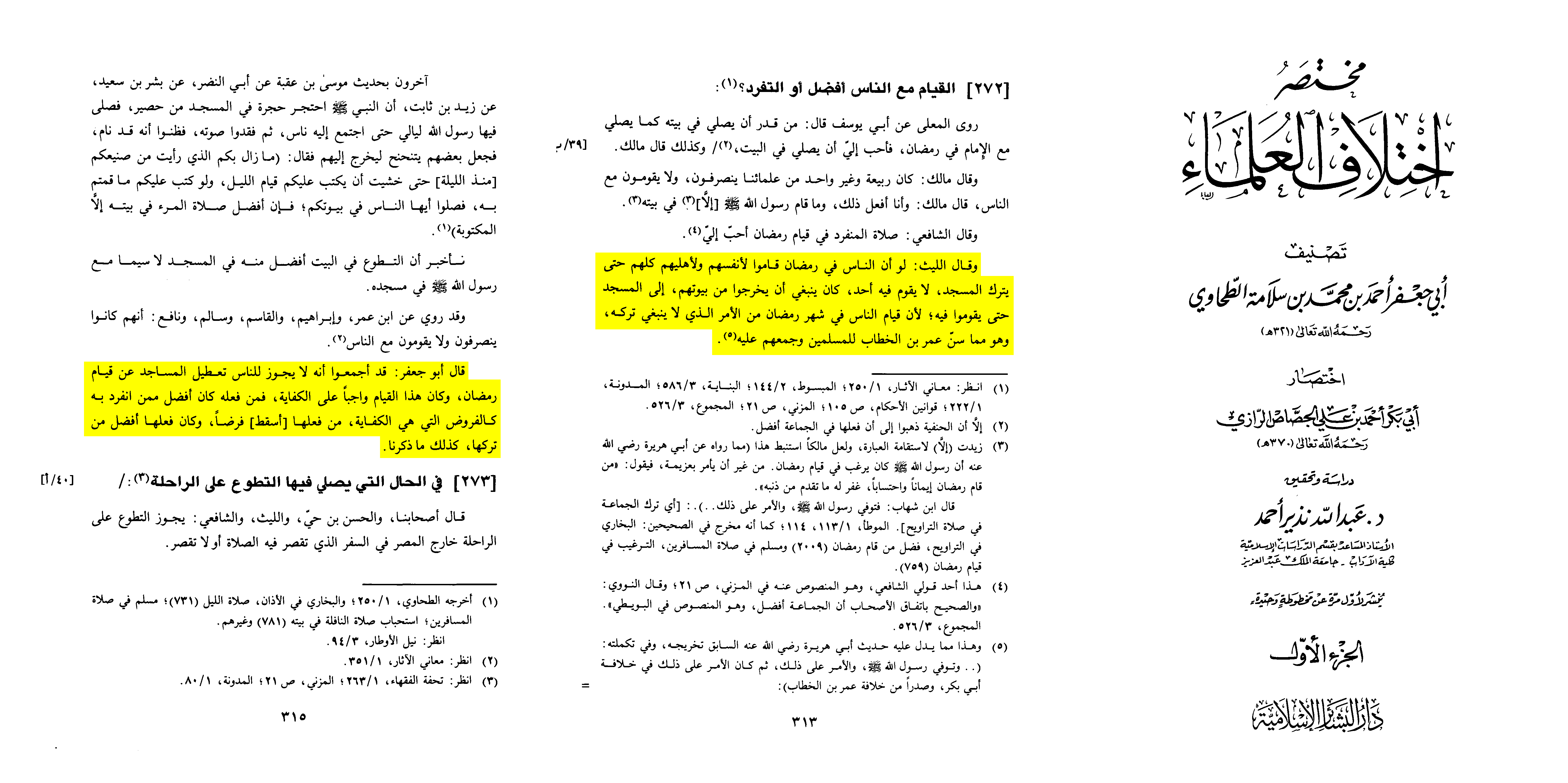 Abū Jaʿfar al-Ṭaḥāwī said: “They have agreed that it is not permissible for the people to leave the mosques devoid of the Ramaḍān night prayer. This standing was a communal obligation; whoever performed it was superior to the one who prayed alone- like obligations that are communal: whoever fulfills them lifts the duty, and performing them is better than abandoning them. Likewise is what we have mentioned.”
