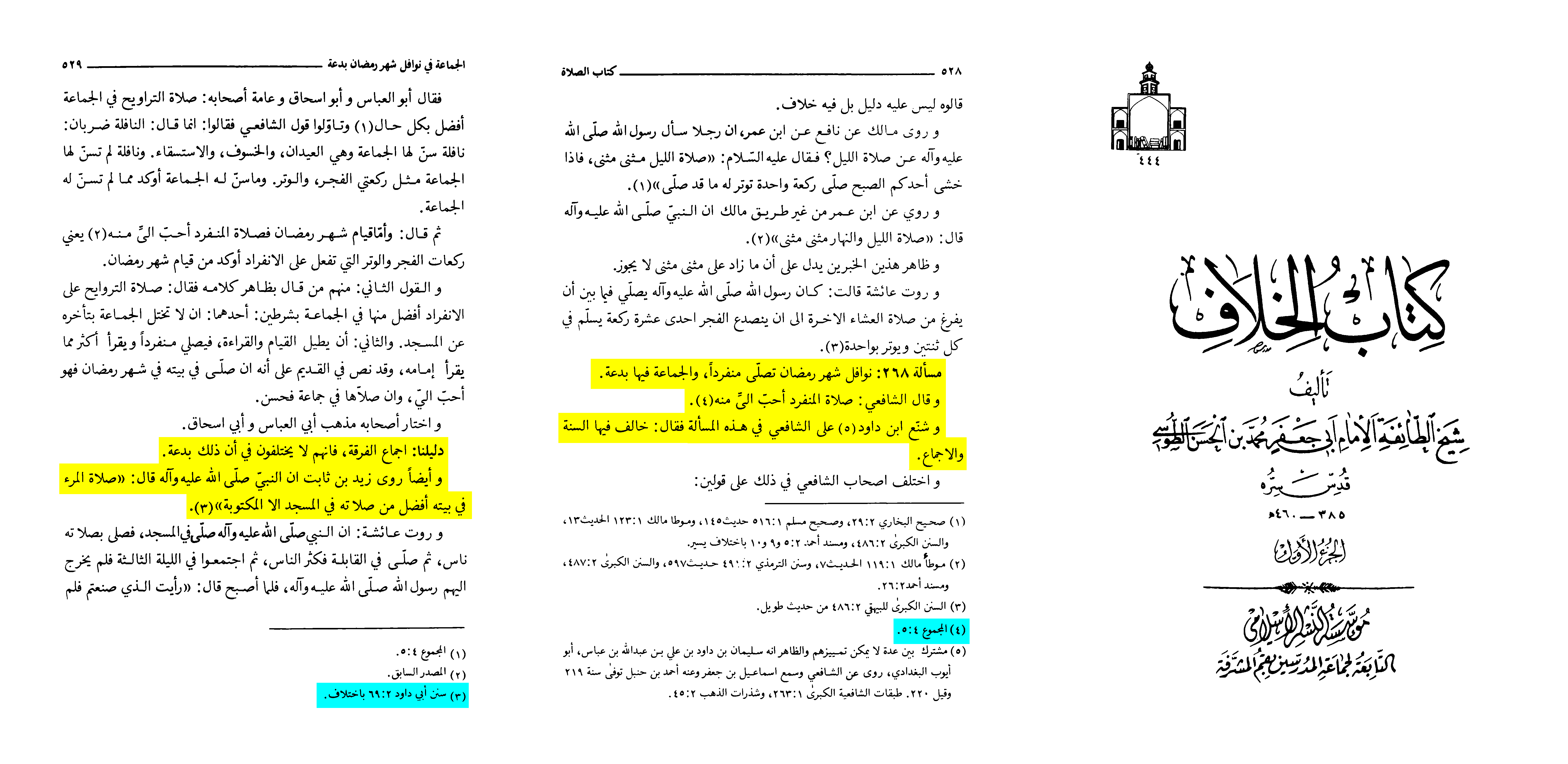 And hence, the abandonment of Tarāwīh prayers in congregation was a distinguishing sign of the Shīʿa, hence Shaykh al-Ṭūsī states that they had consensus (ijmāʿ) on this issue in Kitab al-Khilaf, Vol. 1, pg. 528 - 529: :