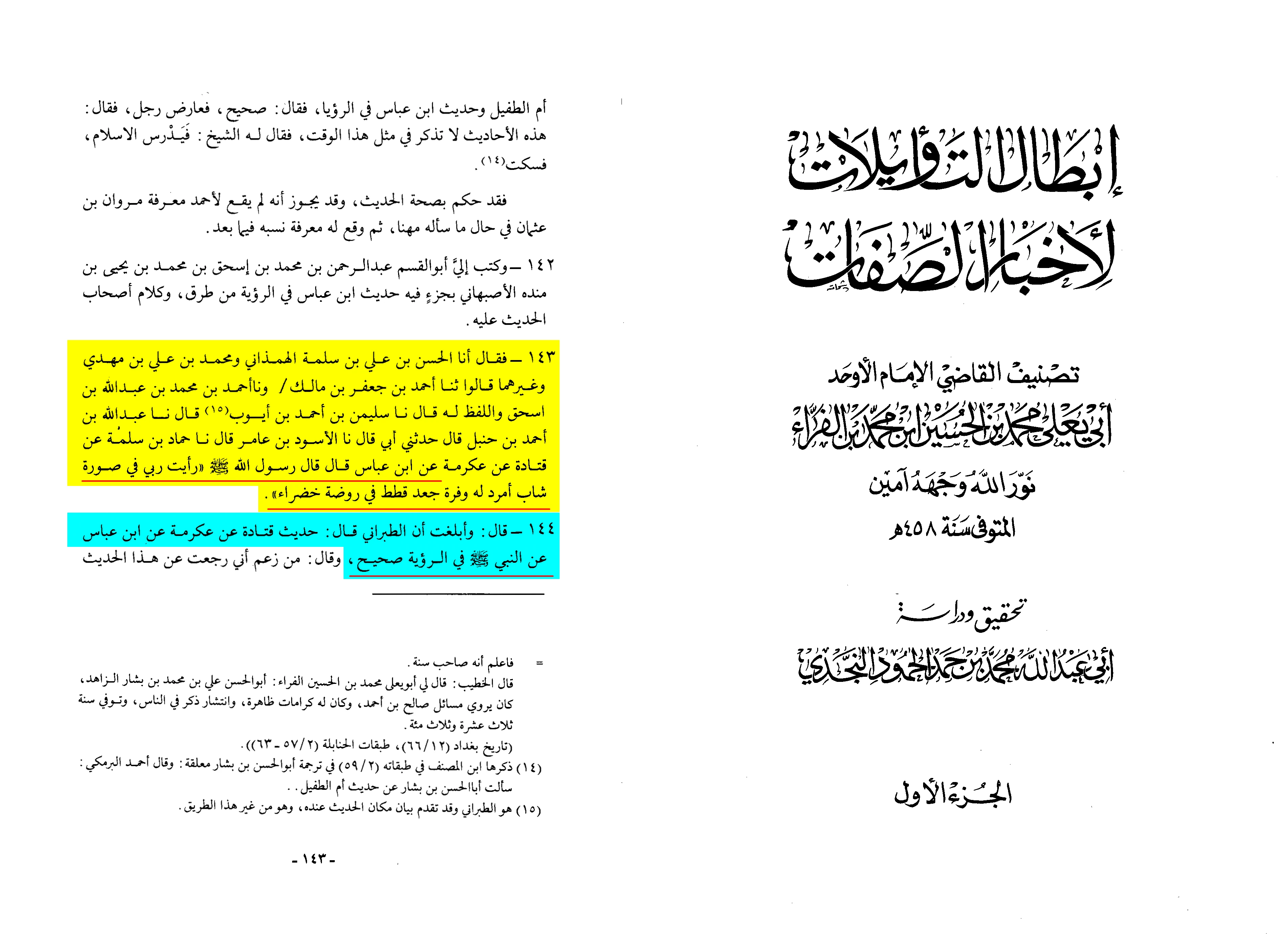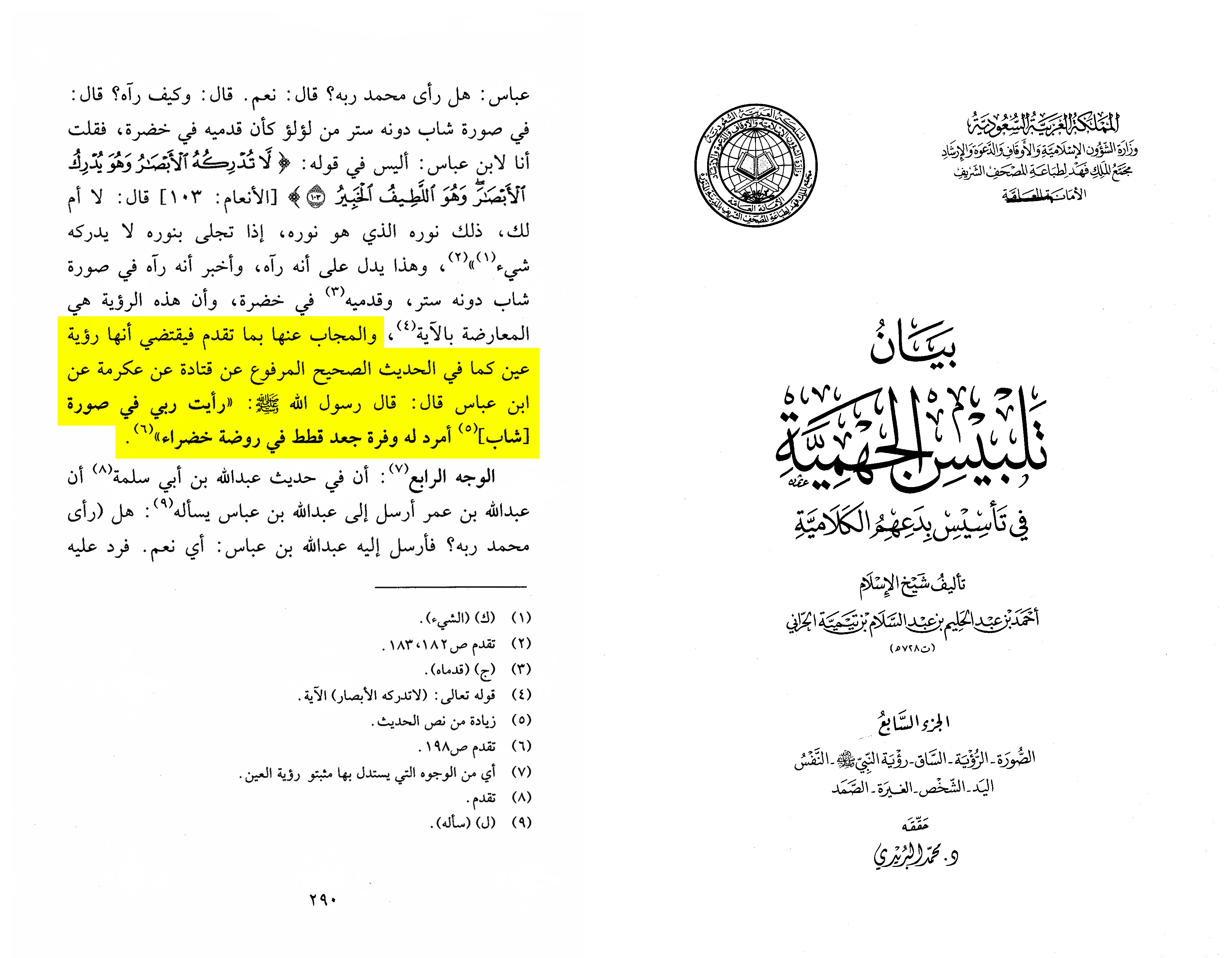 Narrated from Abu Al-Hassan bin Ali bin Salamah Al-Hamdani and Muhammad bin Ali bin Mahdi and others all from Ahmad bin Jaffar bin Malik and Ahmad bin Muhammad bin Abdullah bin Ishaq they said: Sulayman Ibn Ahmad bin Ayub from Abdullah bin Ahmad bin Hanbal from my father from Al-Aswad bin Amir from Hamad bin Salamah from Qutada from Ikrima from Ibn Abbas he said that the Prophet (saws) said: “I saw my lord in the image of a hairless youth with thick curly hair, in a green garden.”