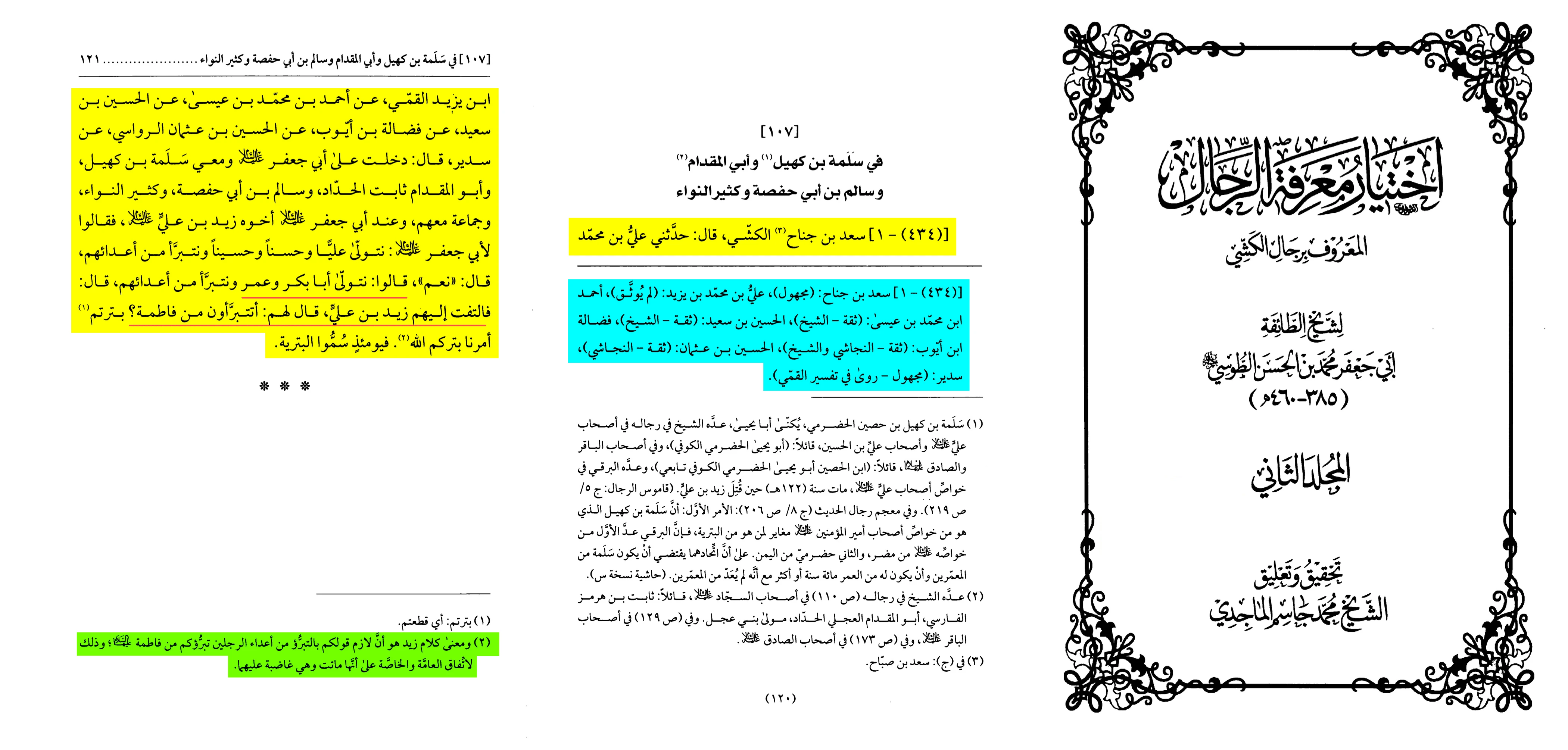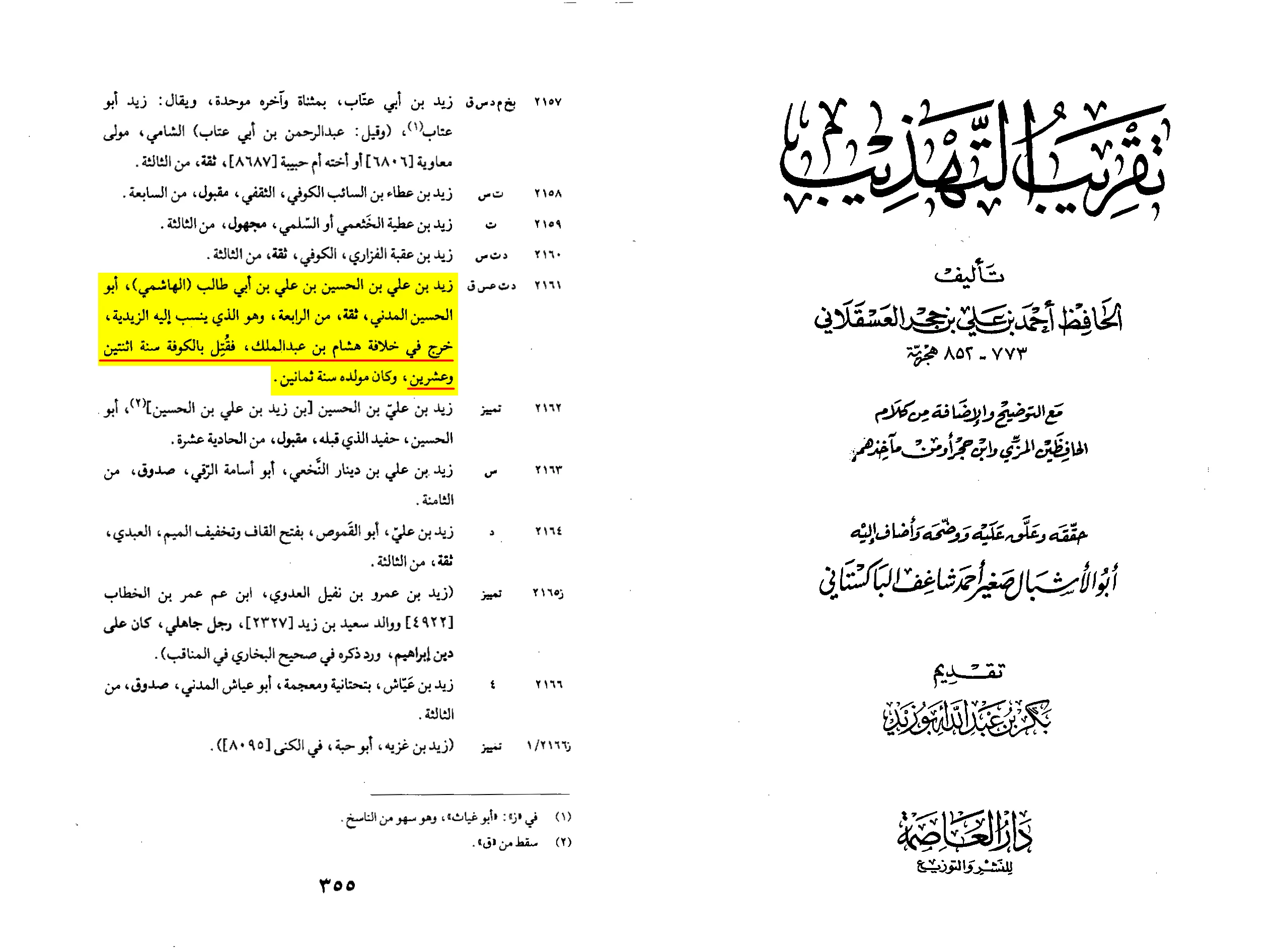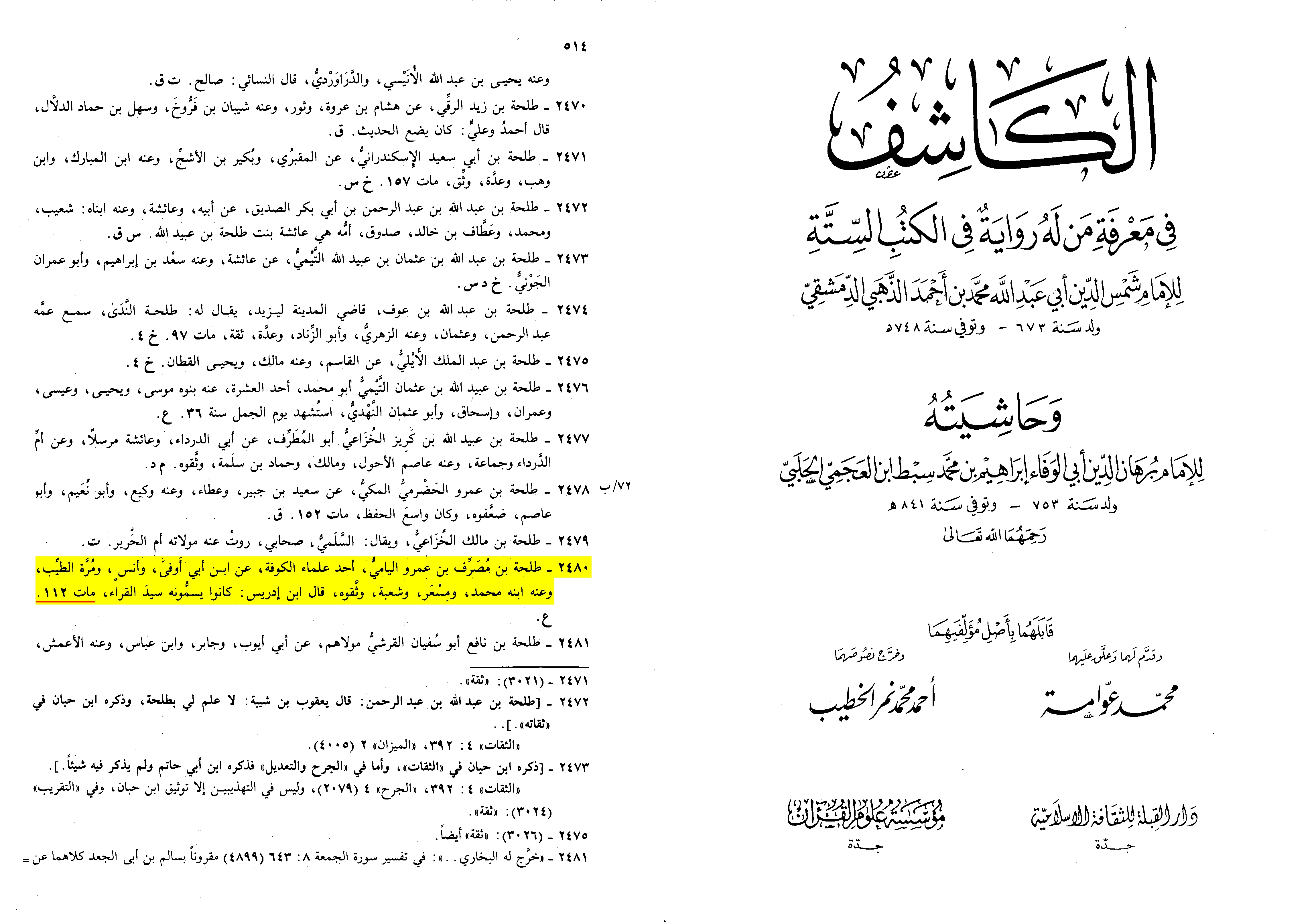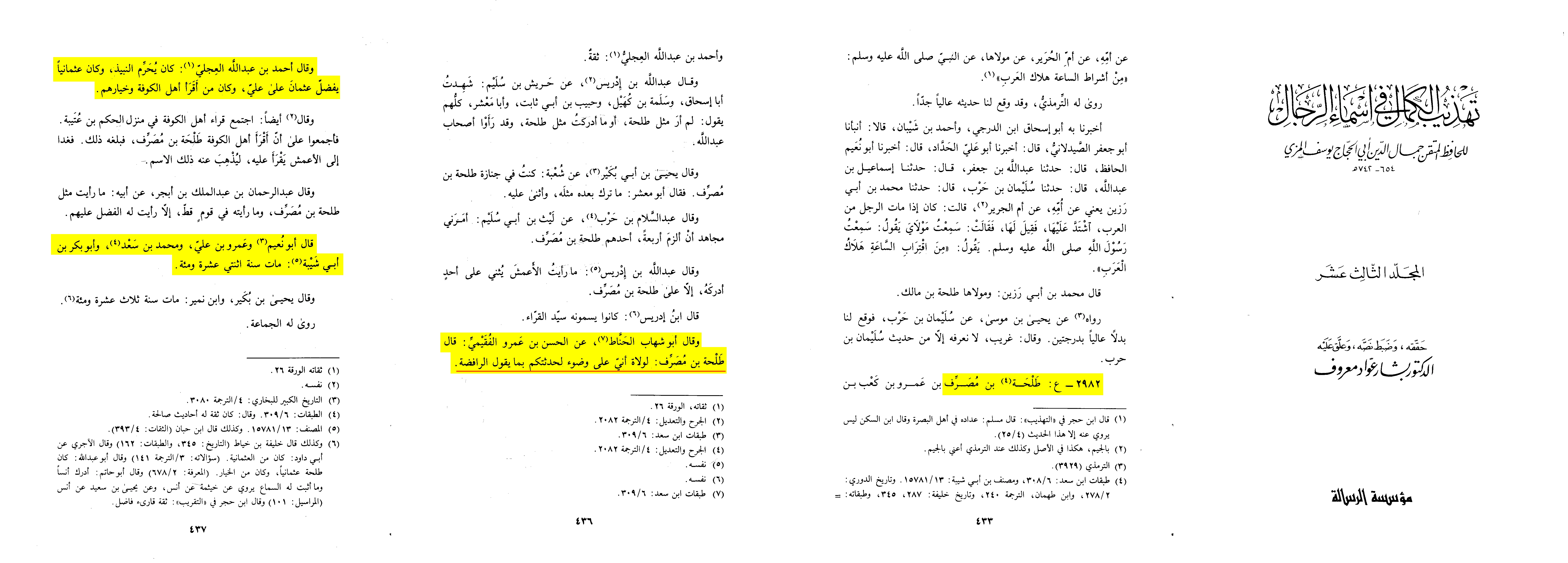 As for a more documented example, we’ll quote the Uthmani (i.e. nasibi) Talha Ibn Masref, who also died before Zayd’s rebellion in the year 112 Hijri according to all the same scholars quoted above in al-Kashif, Vol. 1, pg. 514, al-’Alaam, Vol. 3, pg. 230 and Tahdib al-Kamal, Vol. 13, pg. 433 - 437.