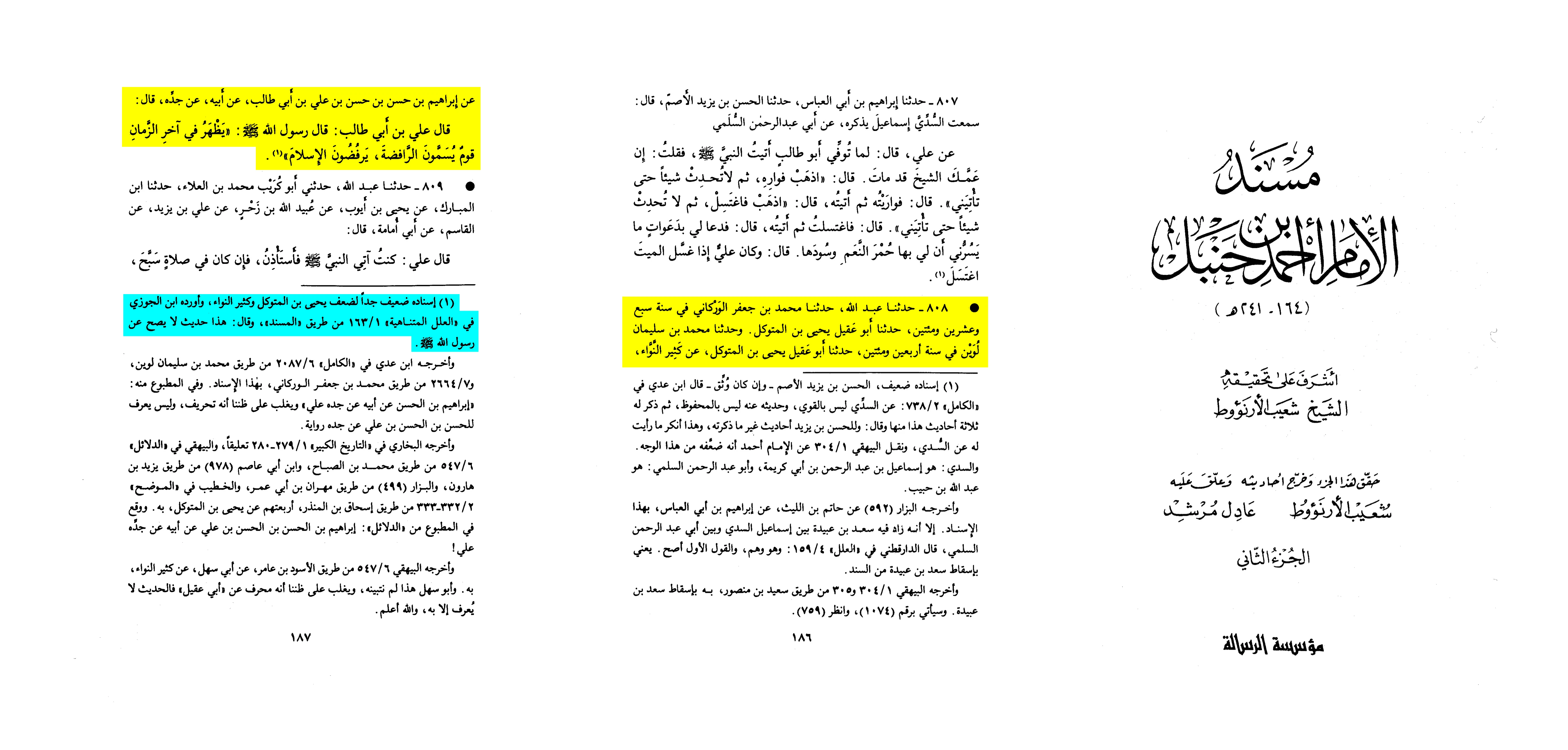 Shu’ayb al-Arn’aut also weakens the report narrated by Imam Ali (as) in Musnad Ahmad Ibn Hanbal, Vol. 2, pg. 186 - 187, quoting al-Bayhaqi where he weakens both reports and says all transmissions to these reports are weak in his Dala’il al-Nabuwa, Vol. 6, pg. 547 - 548.
