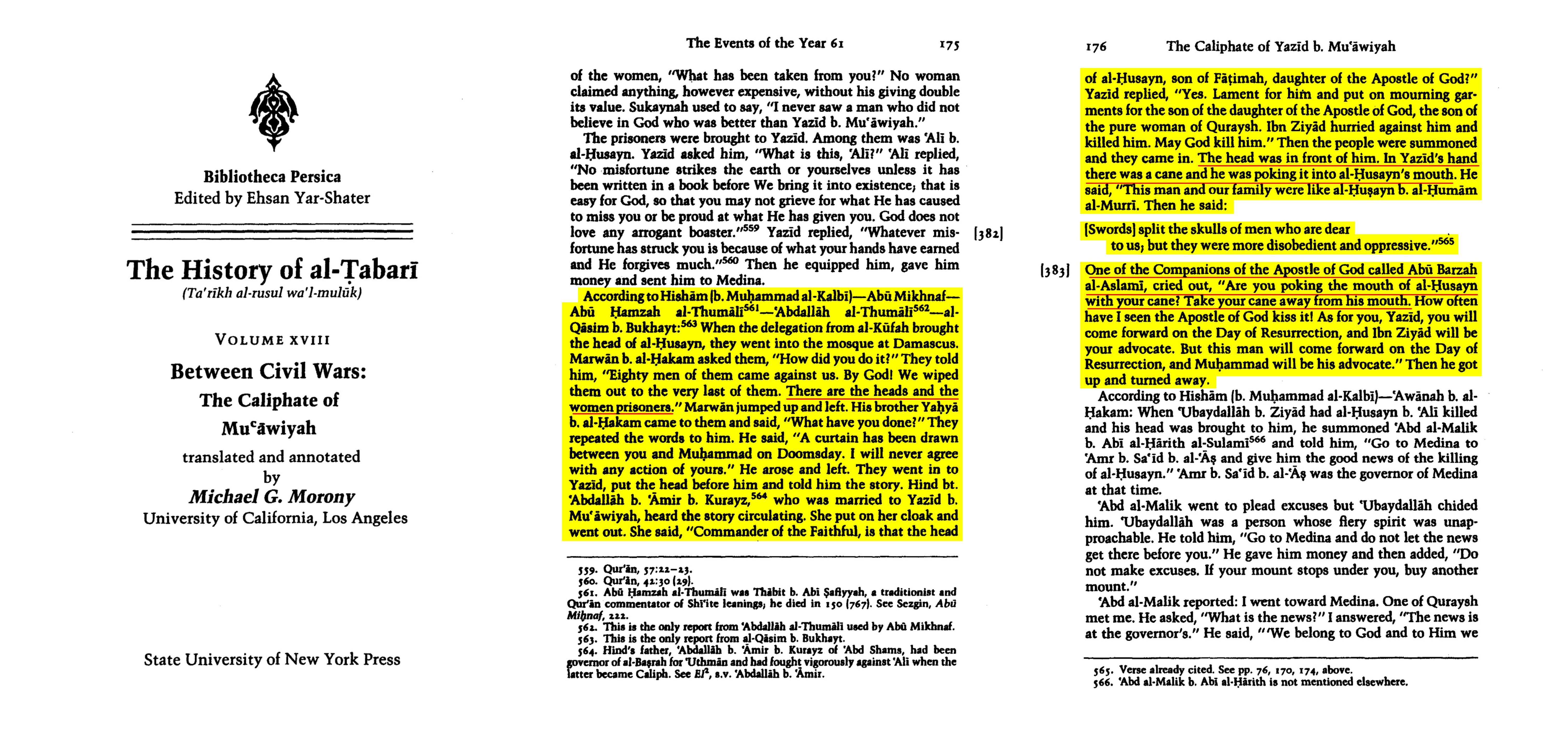 In Yazid's hand there was a cane and he was poking it into al-Husayn's mouth. He said, "This man and our family were like al-Husayn b. al-Humām al-Murri. Then he said: