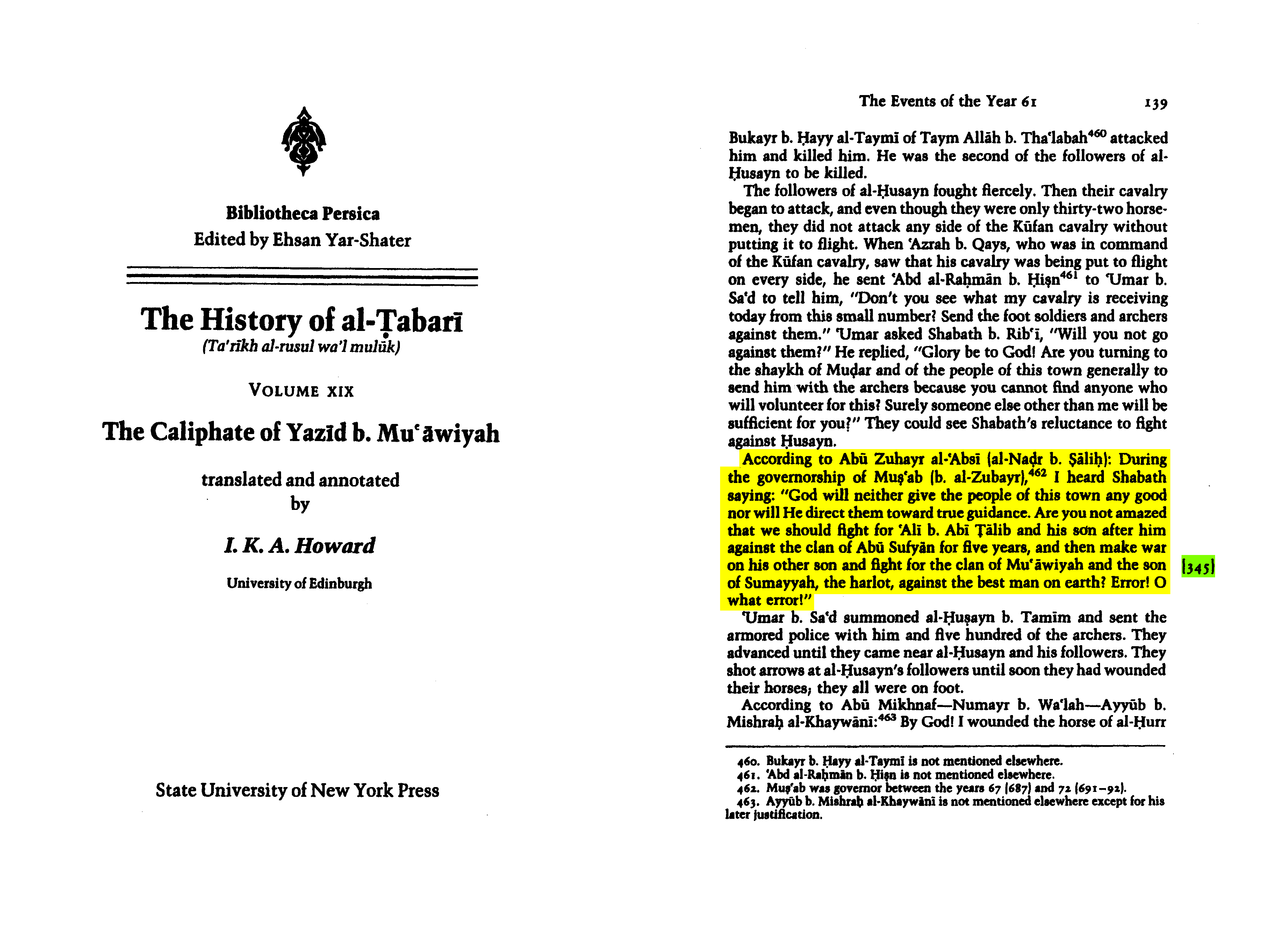 Later he repented and was present at the killing of Husayn. Then he was among those who sought vengeance for Husayn’s blood with al-Mukhtar. After that he was appointed over the police of Kufa. He was also present at the killing of al-Mukhtar. He died in Kufa around the year eighty. [D, S]