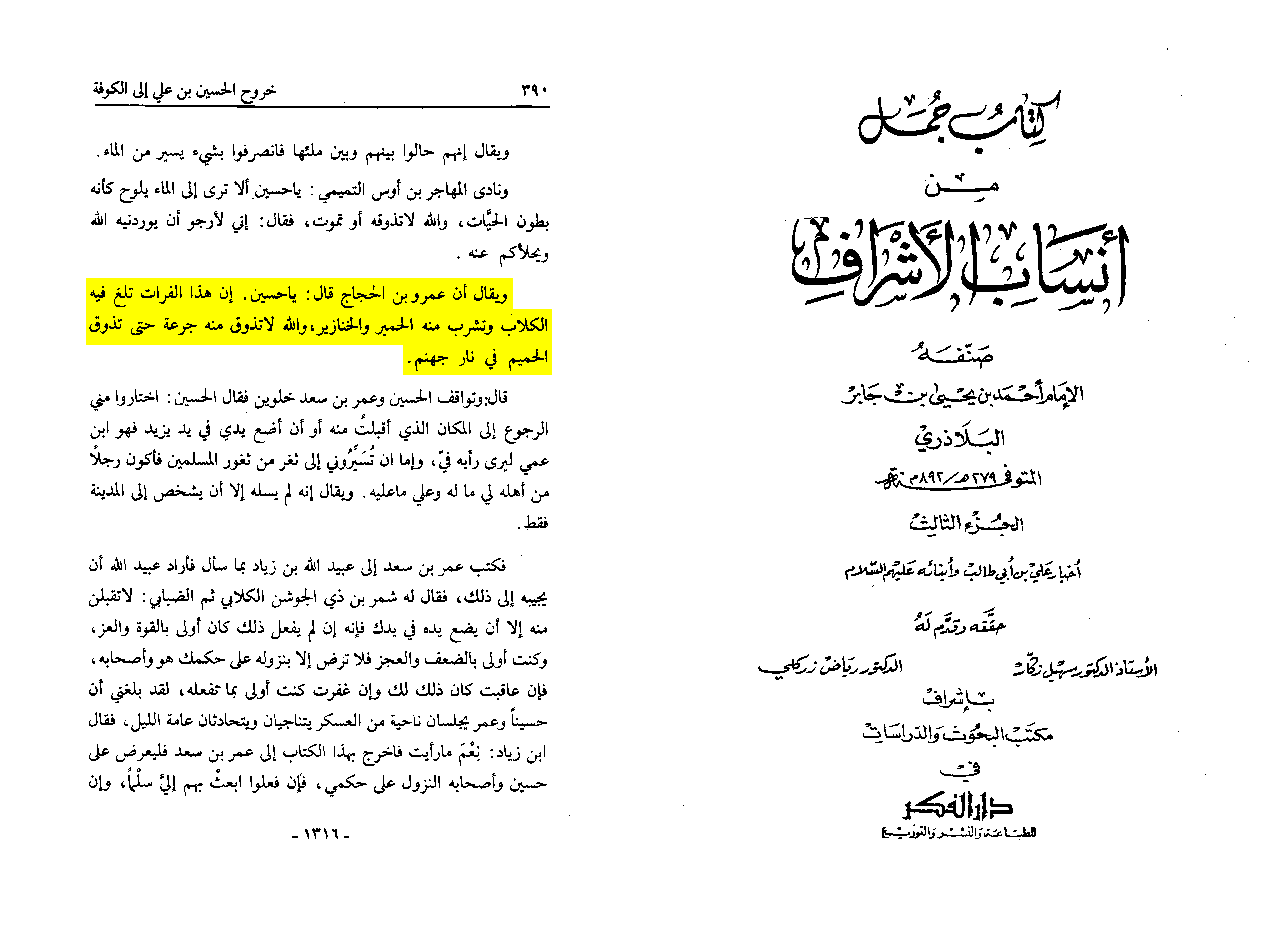 And it is said that Amr b. al-Hajjaj said: “O Husayn, this Euphrates—dogs lap from it, and donkeys and pigs drink from it. By God, you shall not taste from it a single sip until you taste boiling water in the Fire of Hell.”