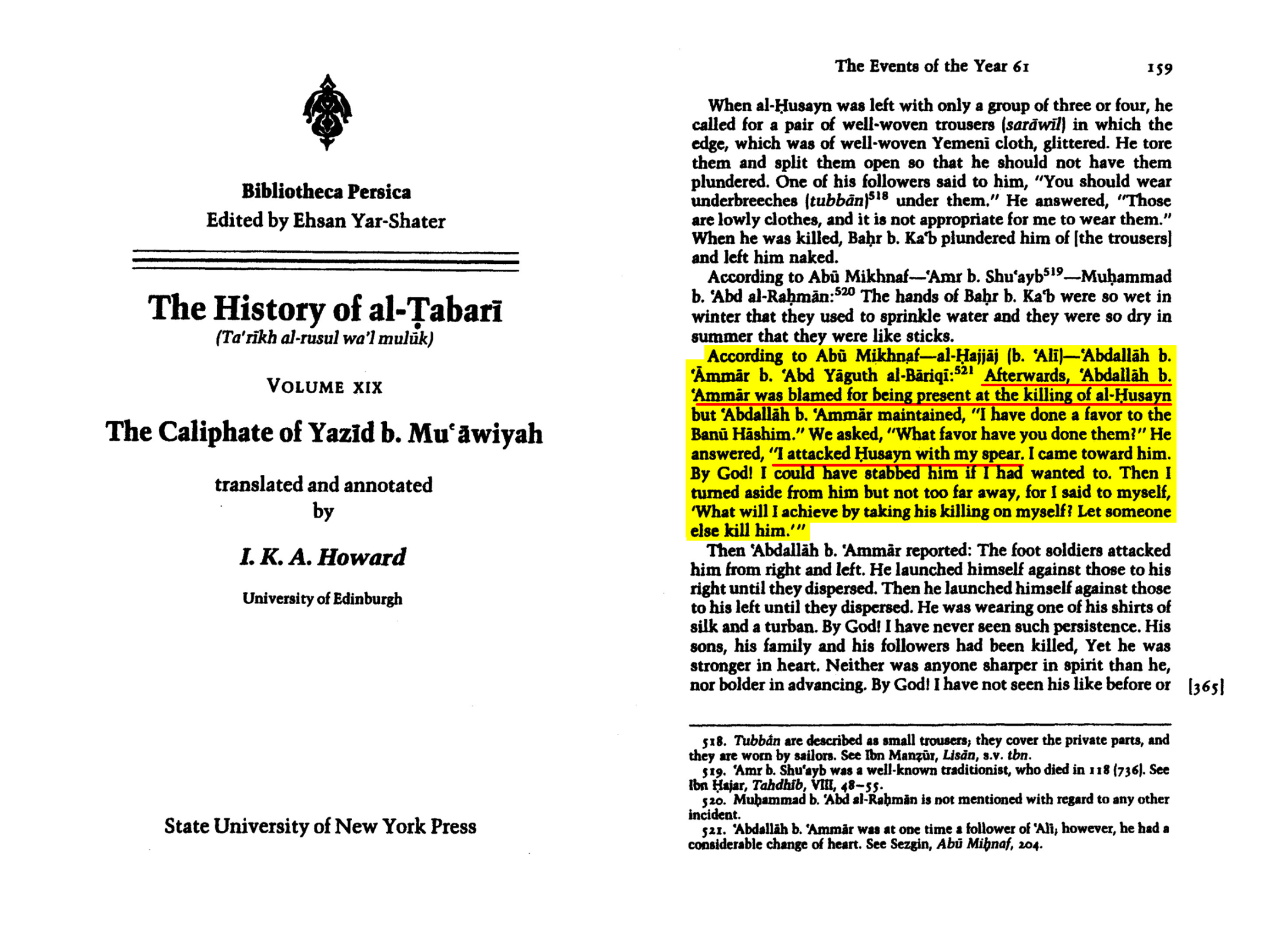 I went on, and there was a large well-equipped tent pitched in the sanctuary. I went to it, and there was 'Abdallah b. Amr b. al-'Aas. He questioned me and I told him about meeting al-Husayn b. 'Alī. He said to me, "Woe on you! Why don't you follow him? By God! He will be victorious, and no weapon will affect him or his followers."